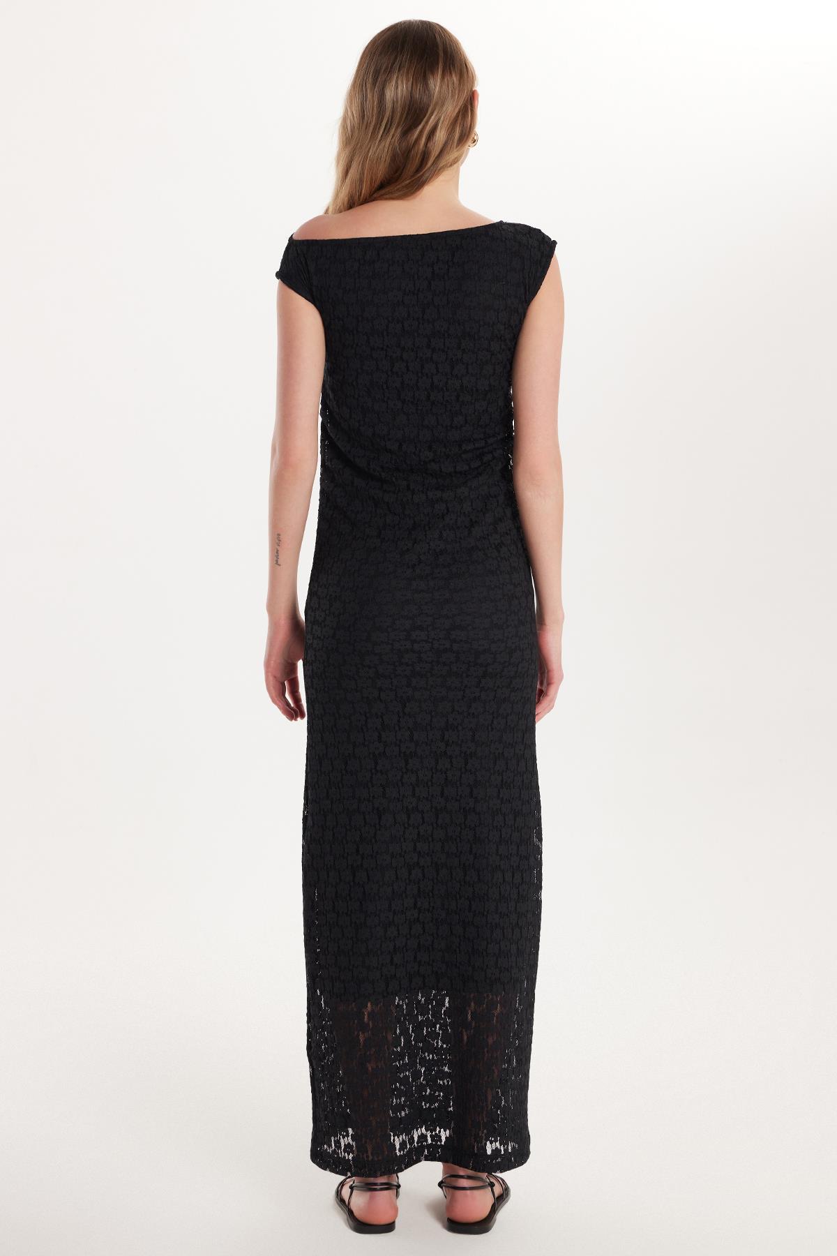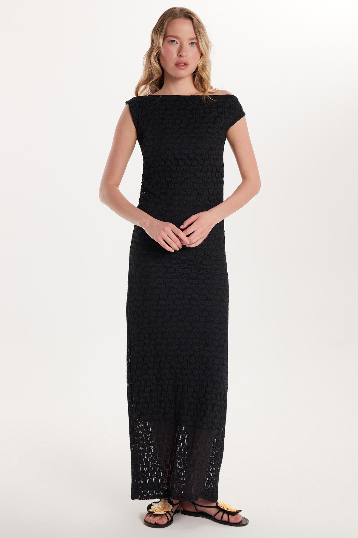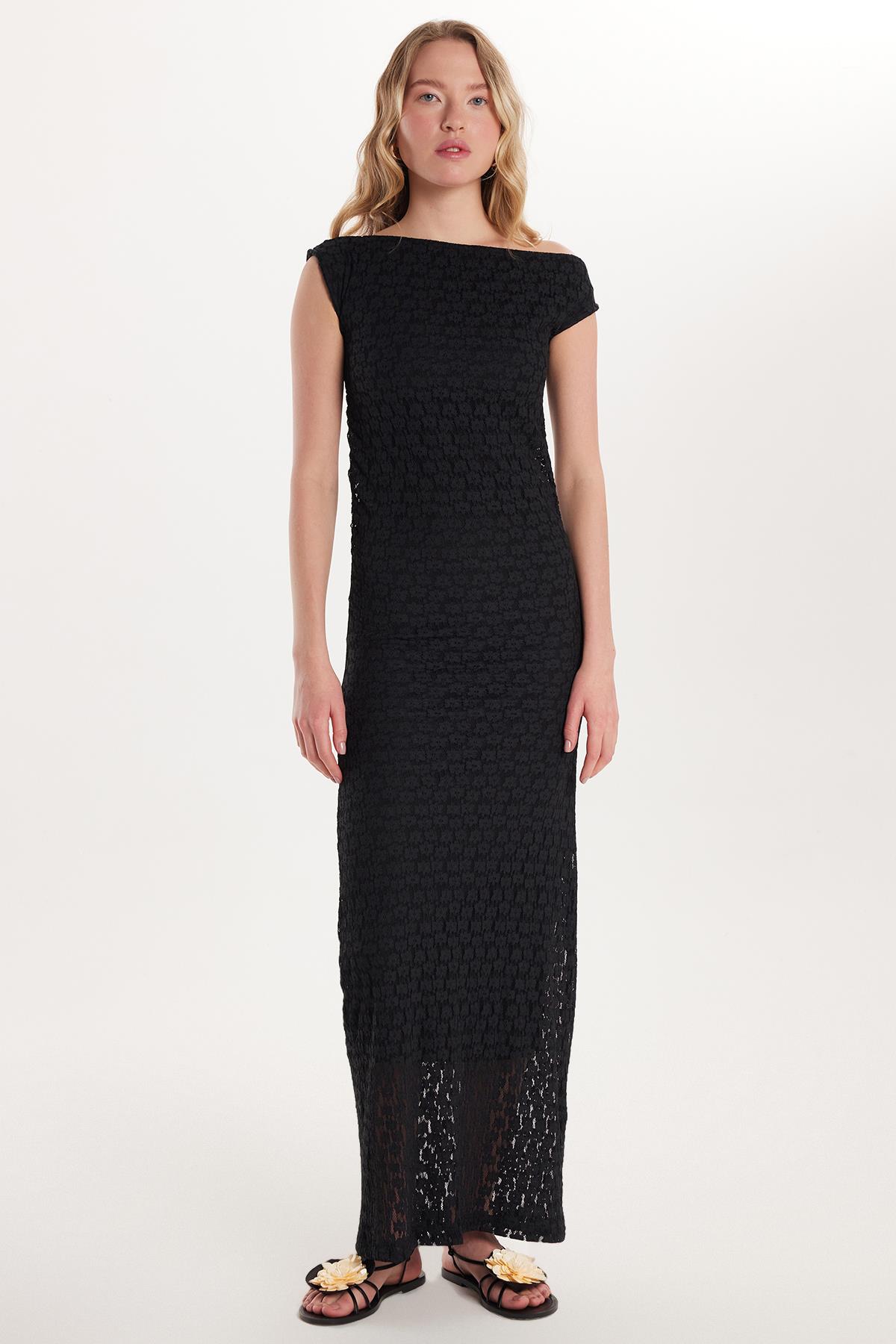 Kadın Standart Fit Omzu Açık Kayık Yaka Dantel Desenli Siyah Elbise
