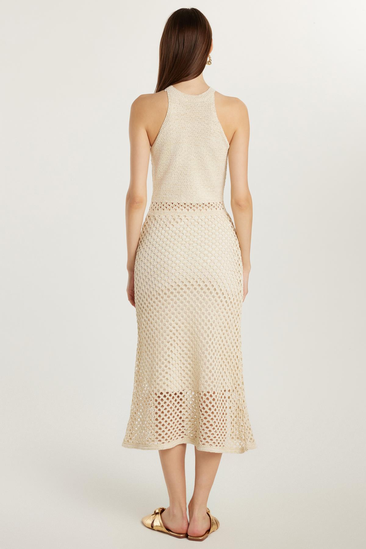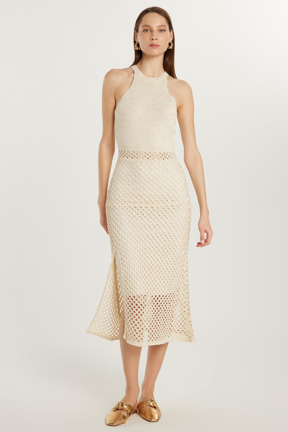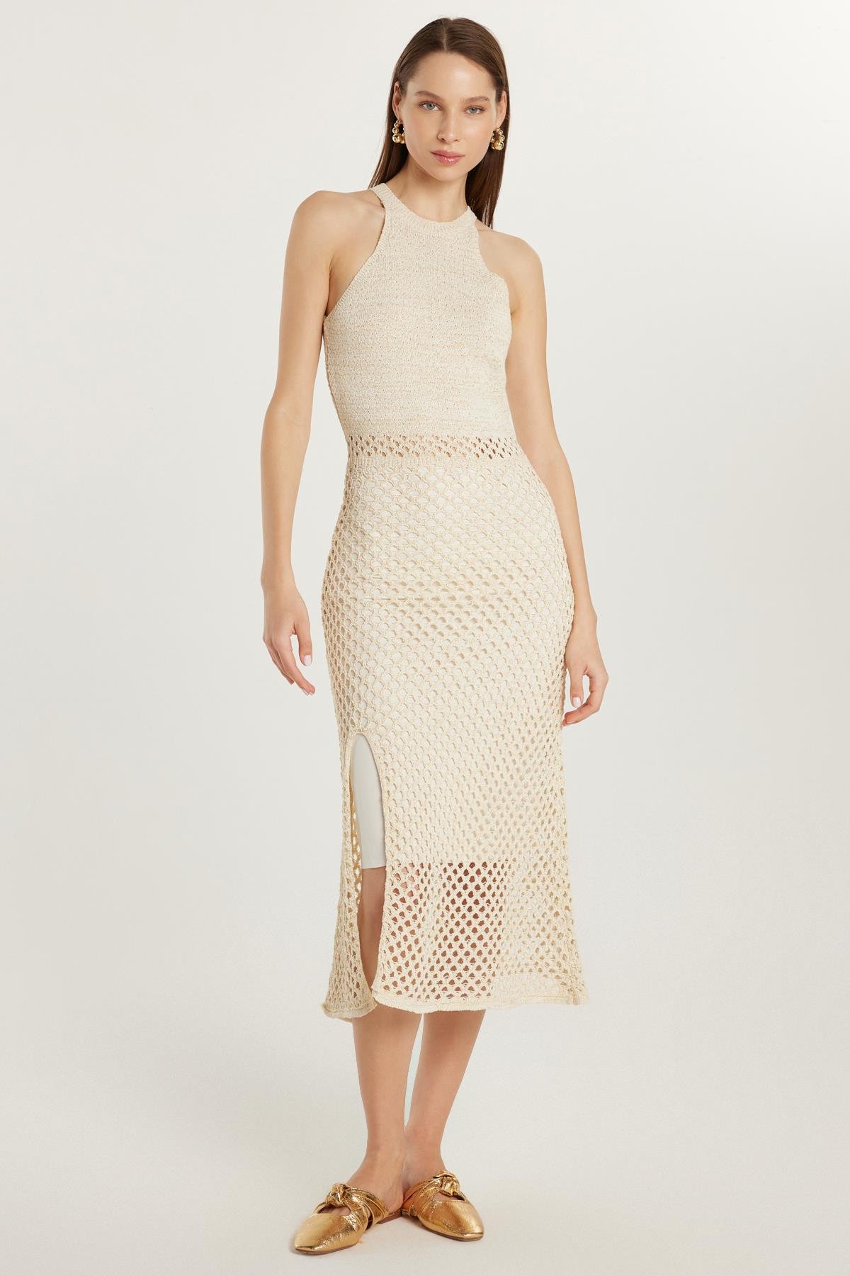 Kadın Standart Fit Örme Detaylı Bisiklet Yaka Ekru Elbise (ELB25034-84)