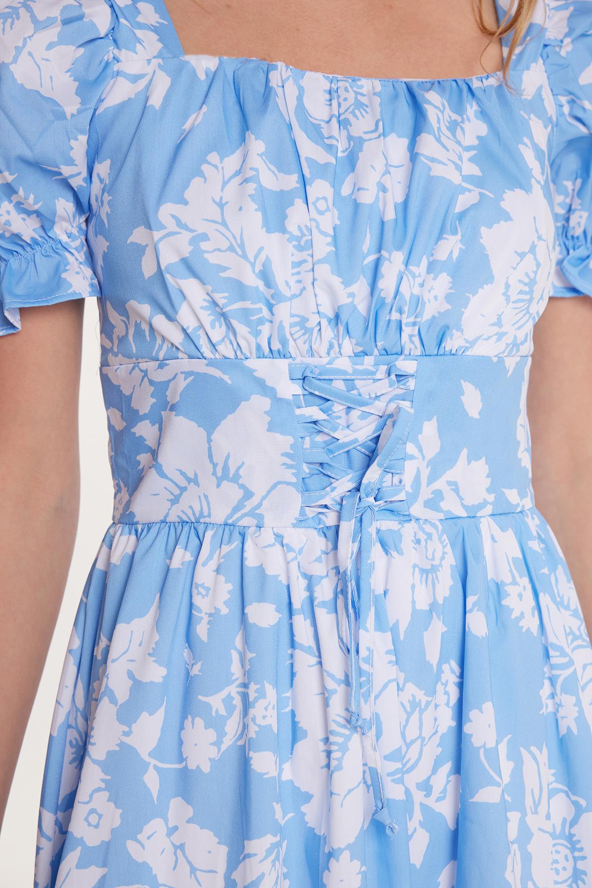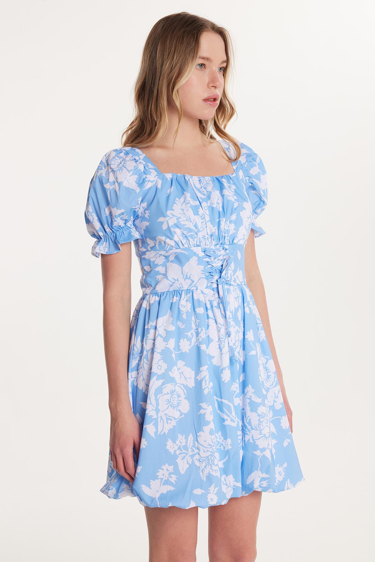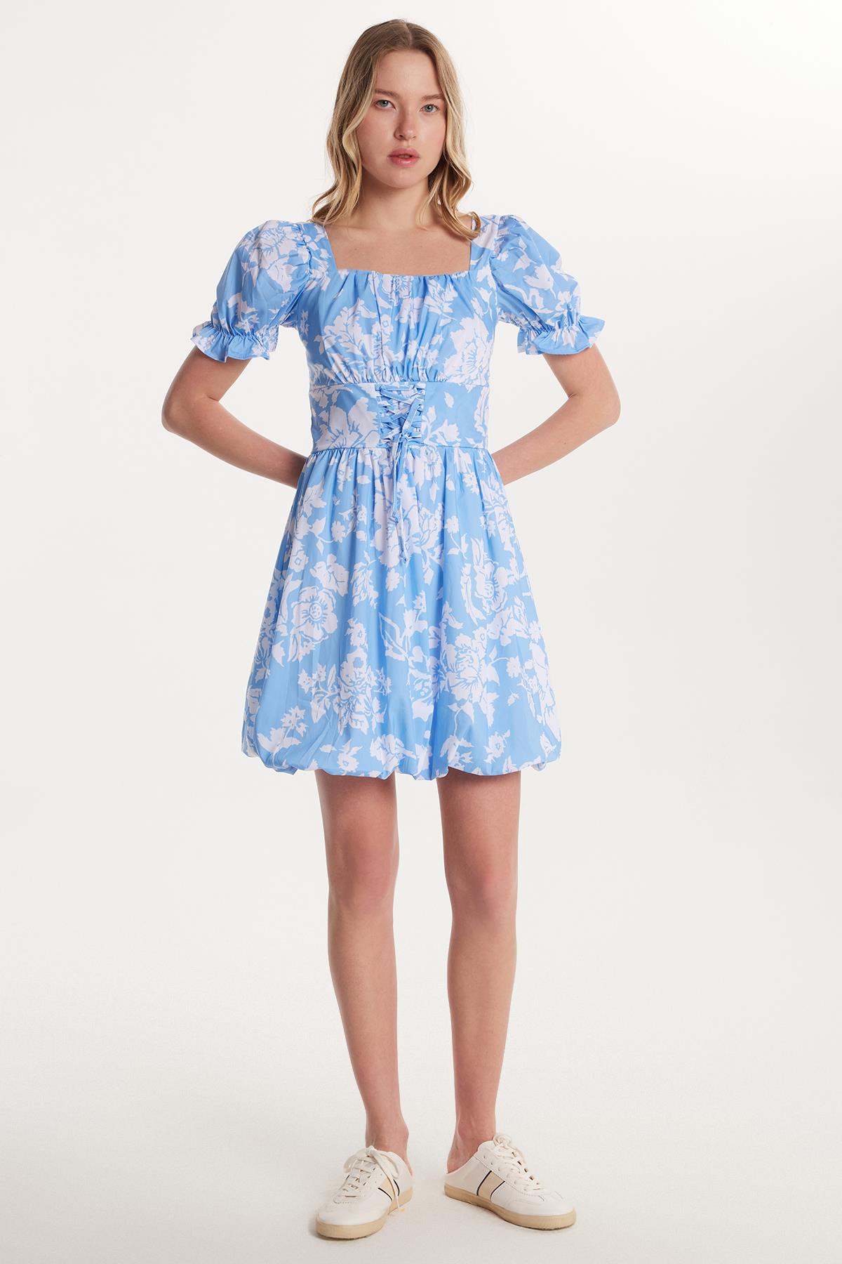 Kadın Standart Fit Pamuklu Kısa Kollu Lastikli Beli Büzgülü Bağlama Detaylı U Yaka Elbise