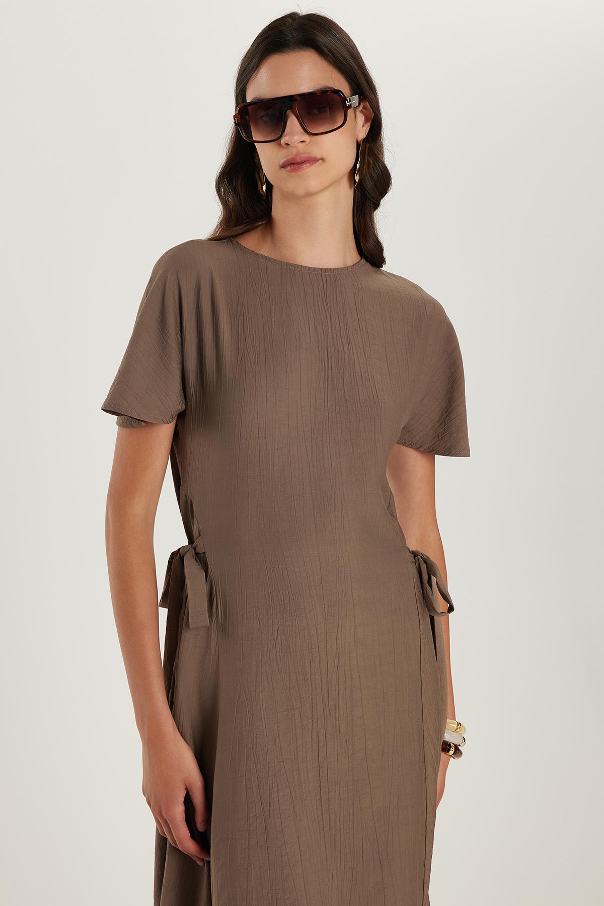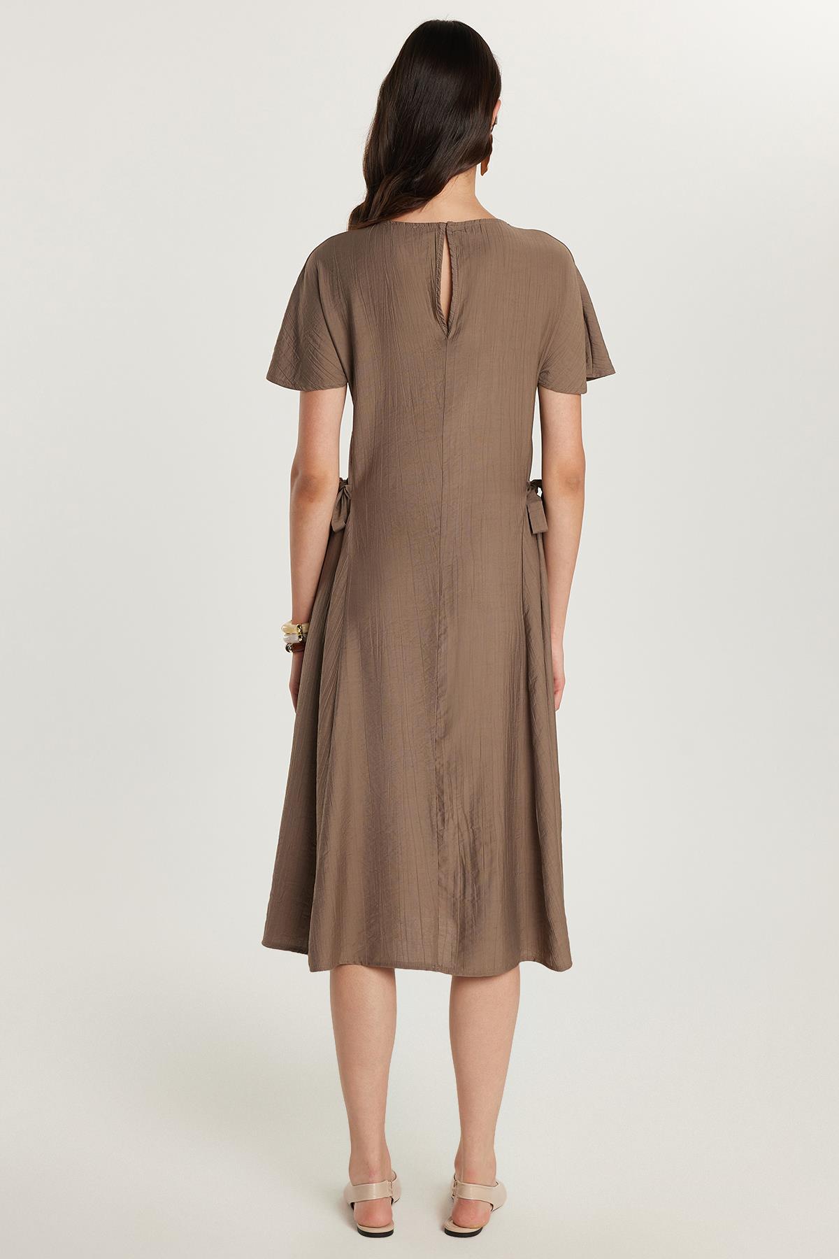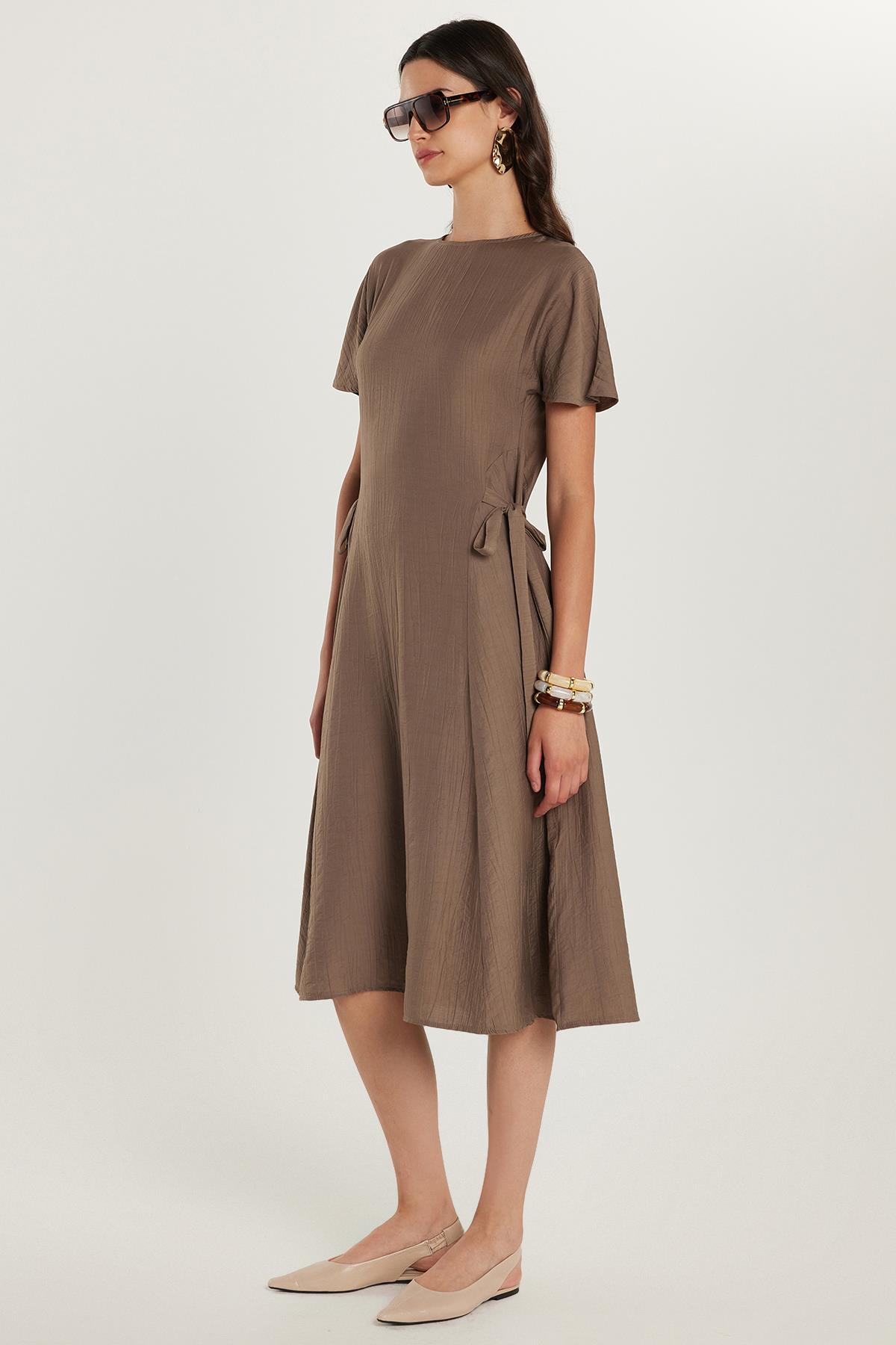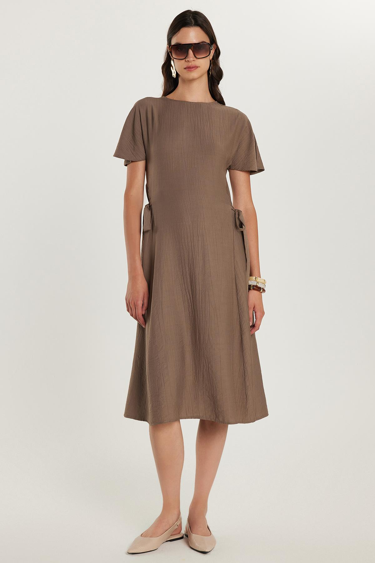 Kadın Standart Fit Yandan Fiyonk Bağlama Detaylı Kısa Kollu Bisiklet Yaka Füme Midi Boy Elbise (ELB25060-52)