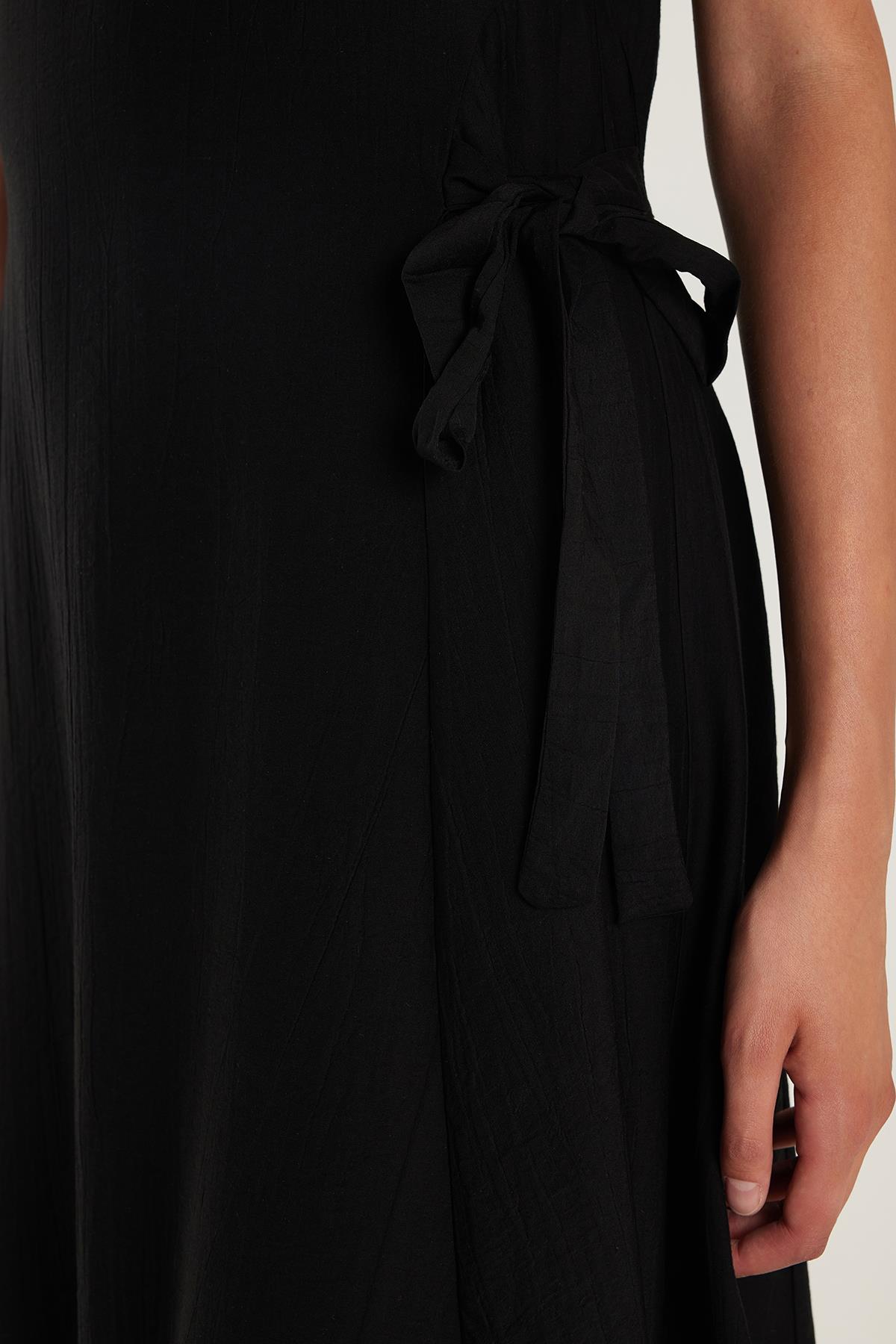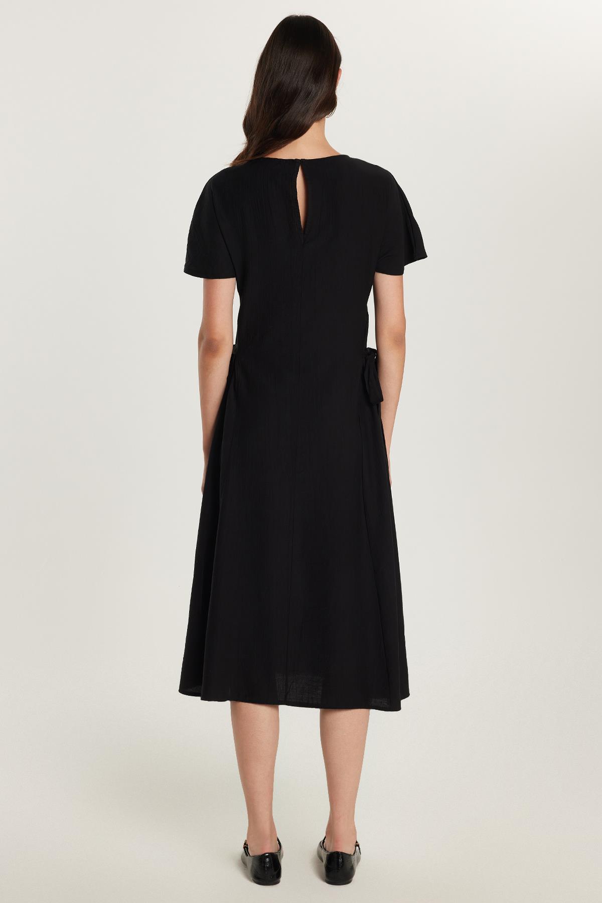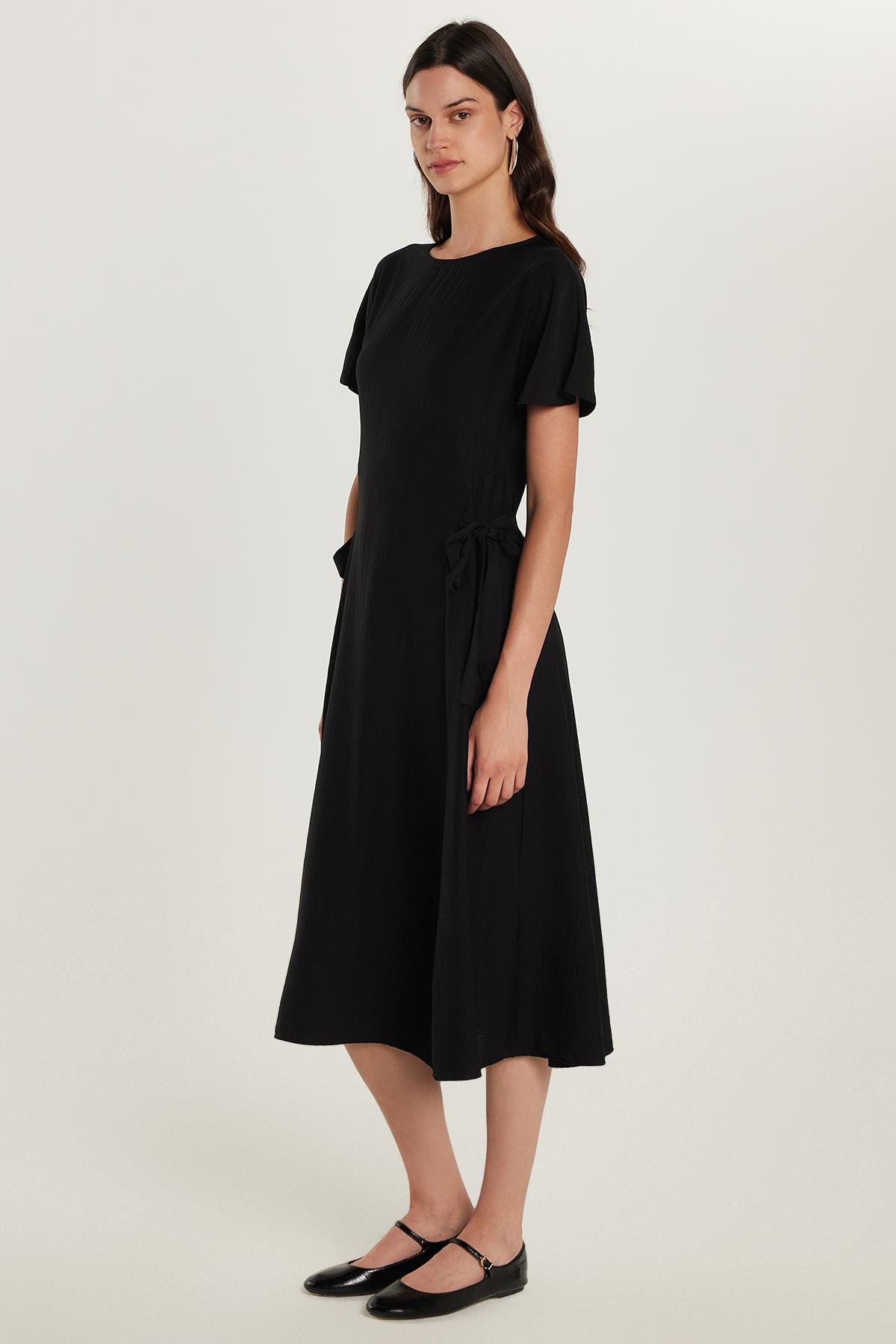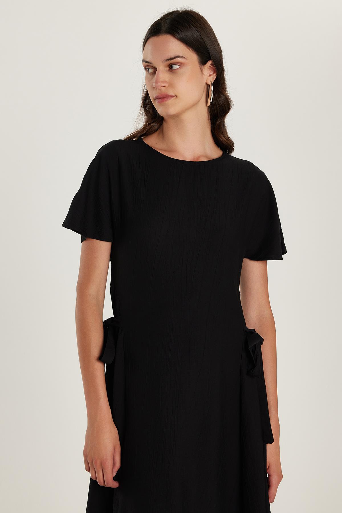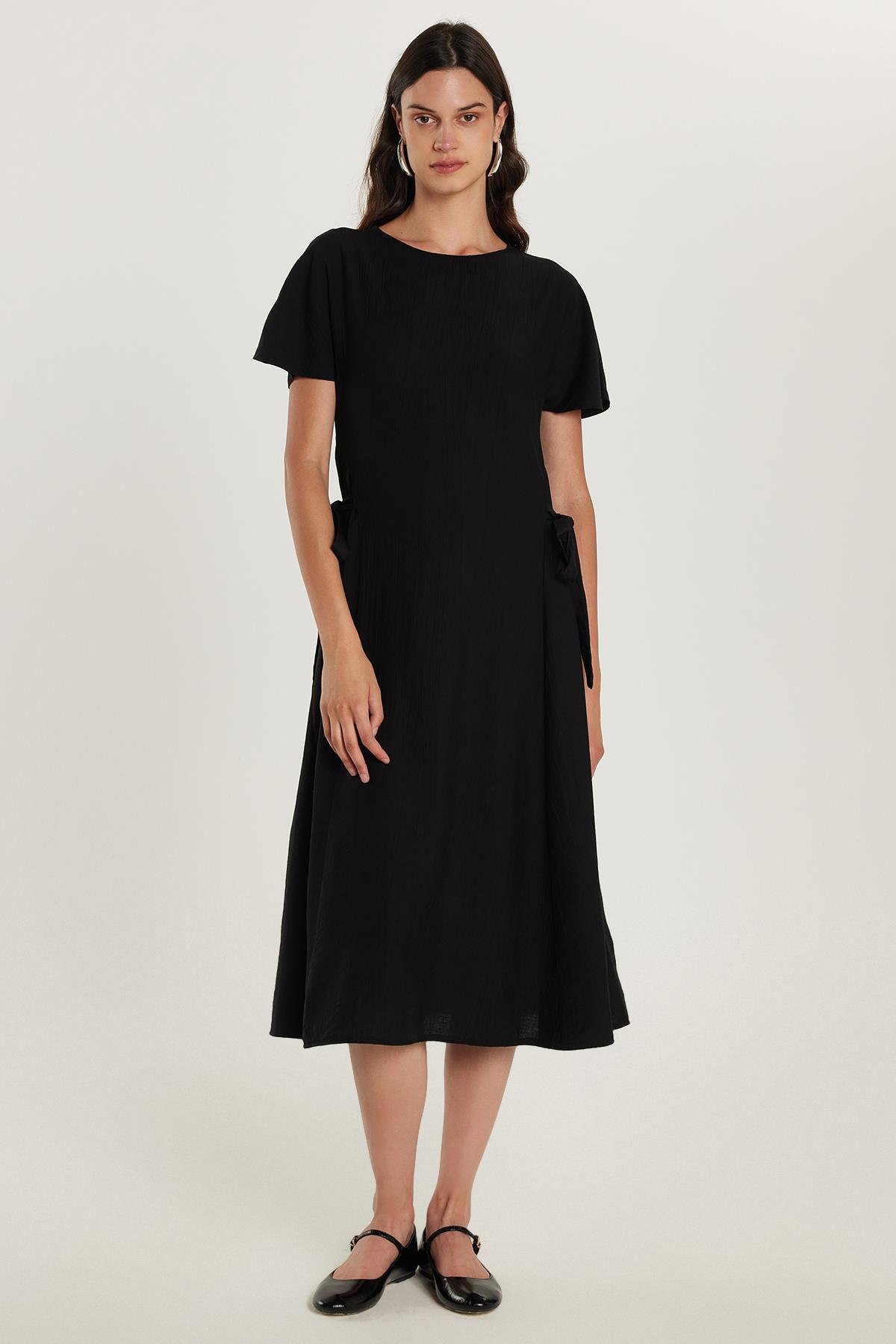 Kadın Standart Fit Yandan Fiyonk Bağlama Detaylı Kısa Kollu Bisiklet Yaka Siyah Midi Boy Elbise