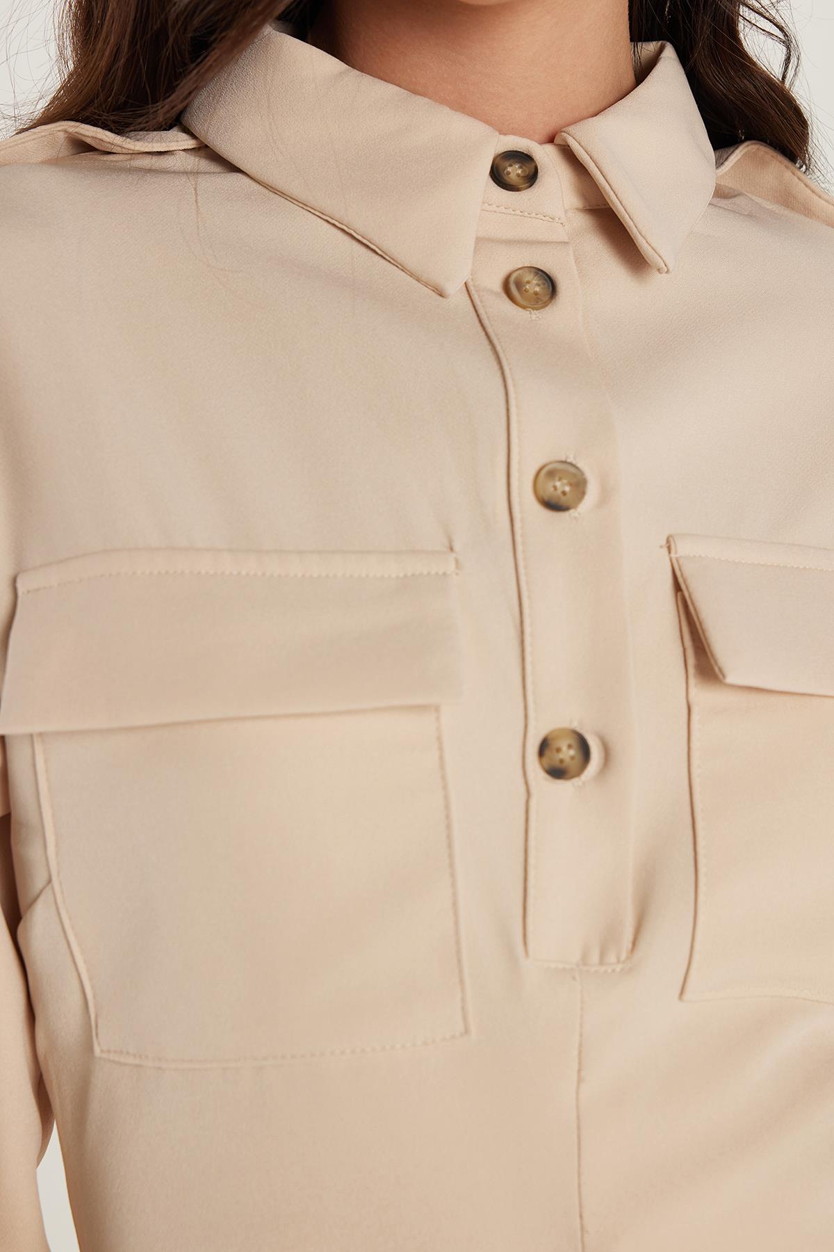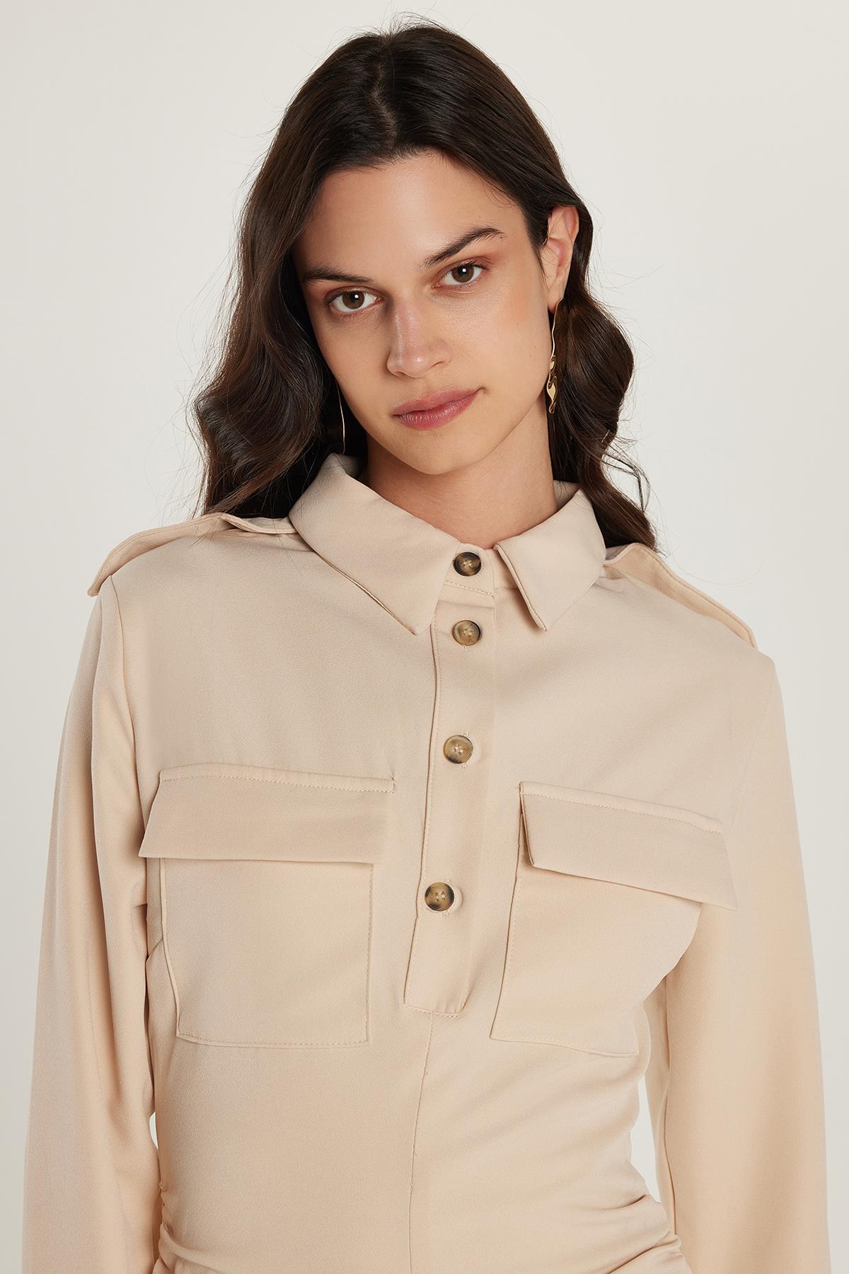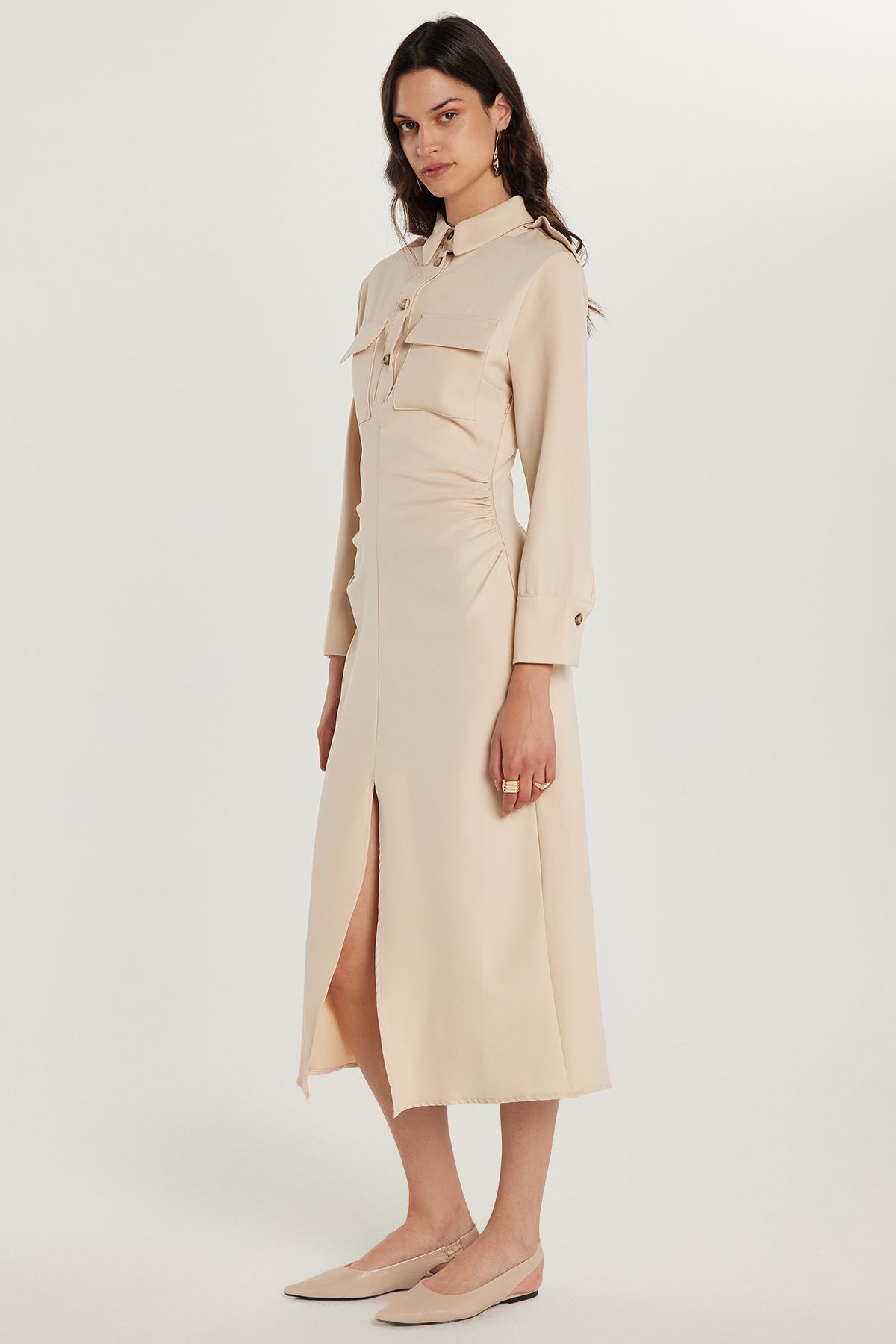 Kadın Standart Fit Düğmeli Polo Yaka Uzun Kollu Çift Çepli Önden Yırtmaçlı Midi Boy Bej Elbise (ELB25019-71)