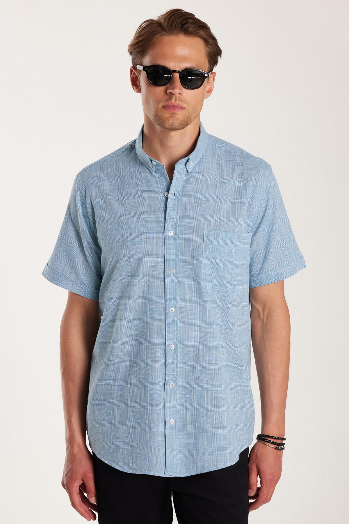 Erkek Regular Fit Klasik Kesim %100 Pamuk Keten Doku Kareli Düğmeli Yaka Yeşil Gömlek (KL230023-400)