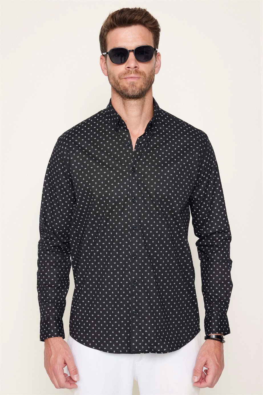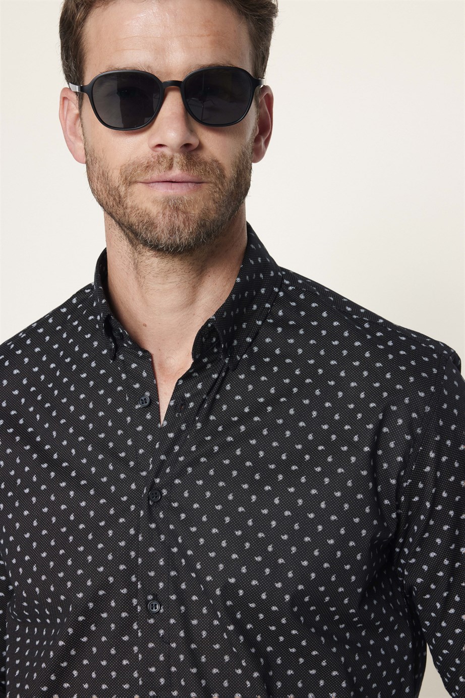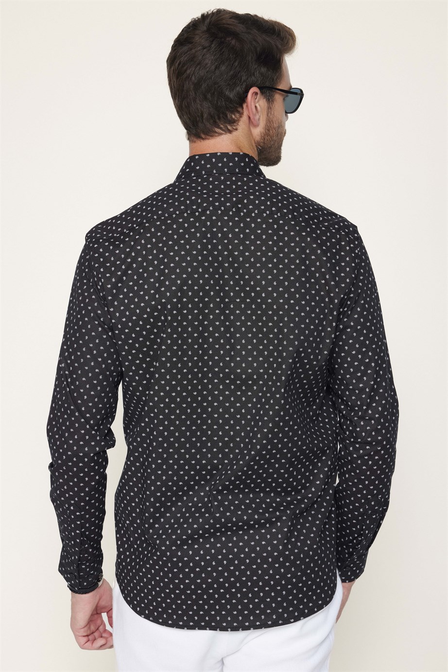 Erkek Regular Fit Klasik Kesim Likralı Baskılı Pamuklu Siyah Gömlek
