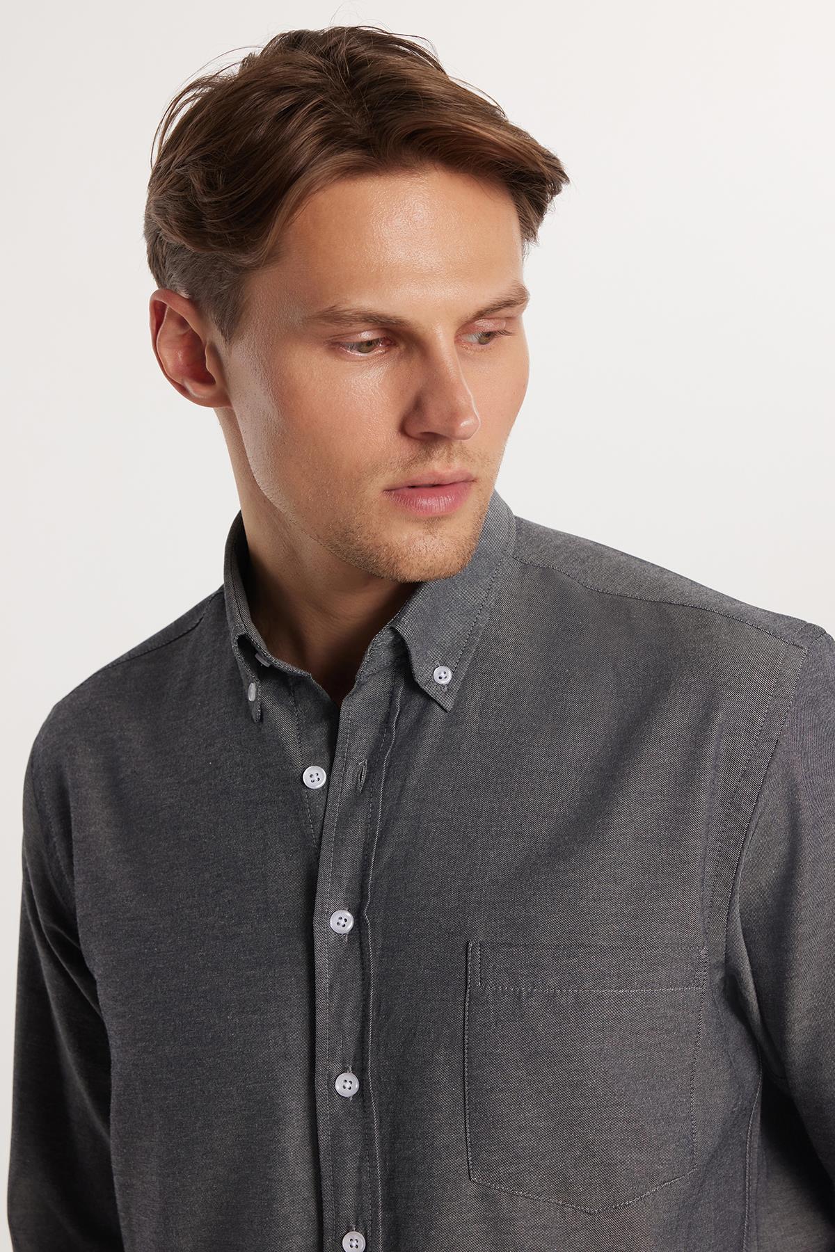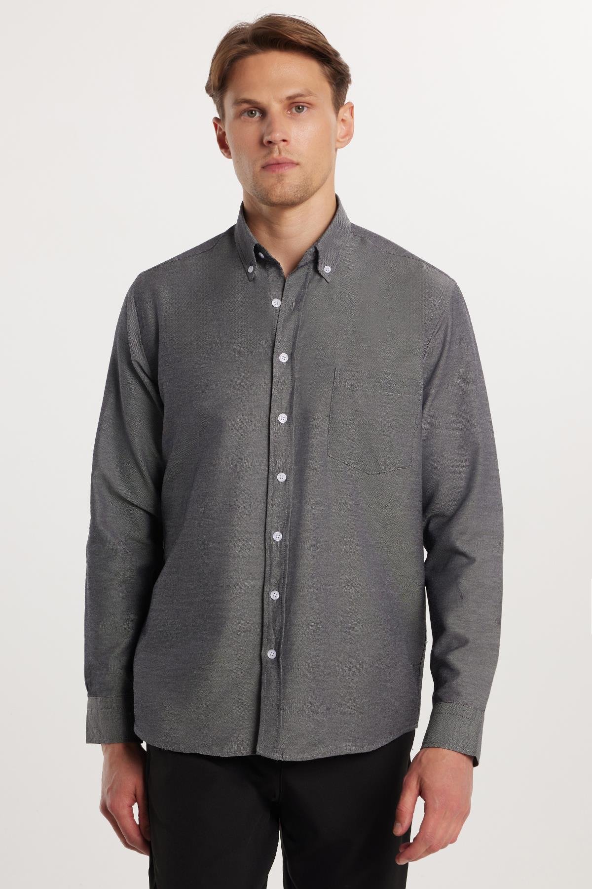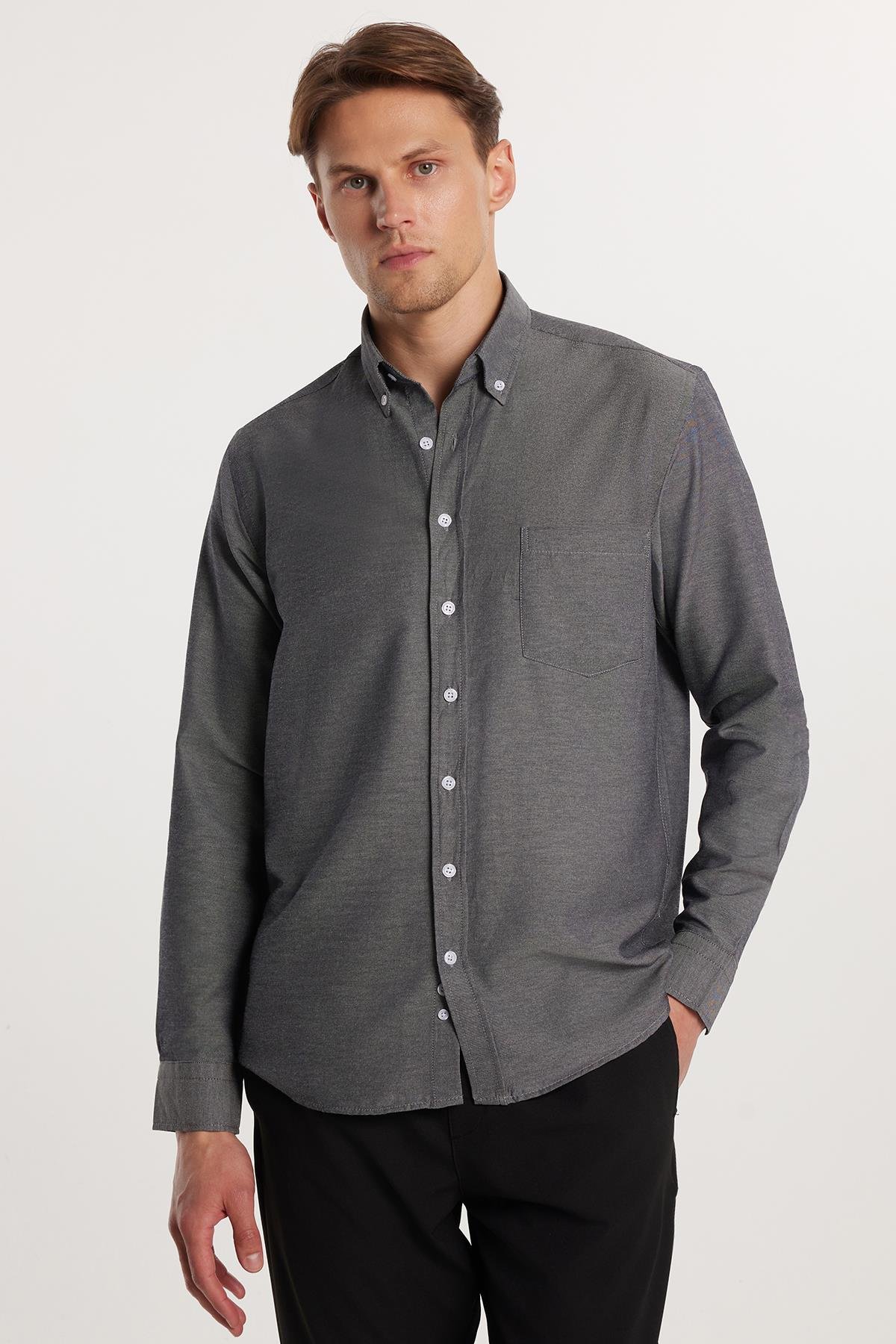 Erkek Regular Fit Klasik Kesim Düz Yaka Düğmeli Cepli Gri Gömlek