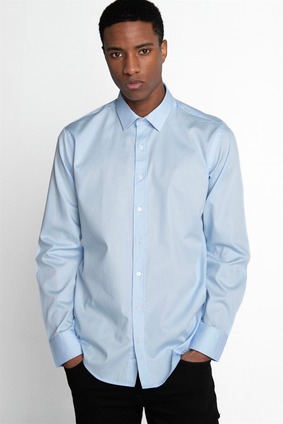 Modern Fit Uzun Kollu %100 Pamuk Armürlü Premium Erkek Mavi Gömlek