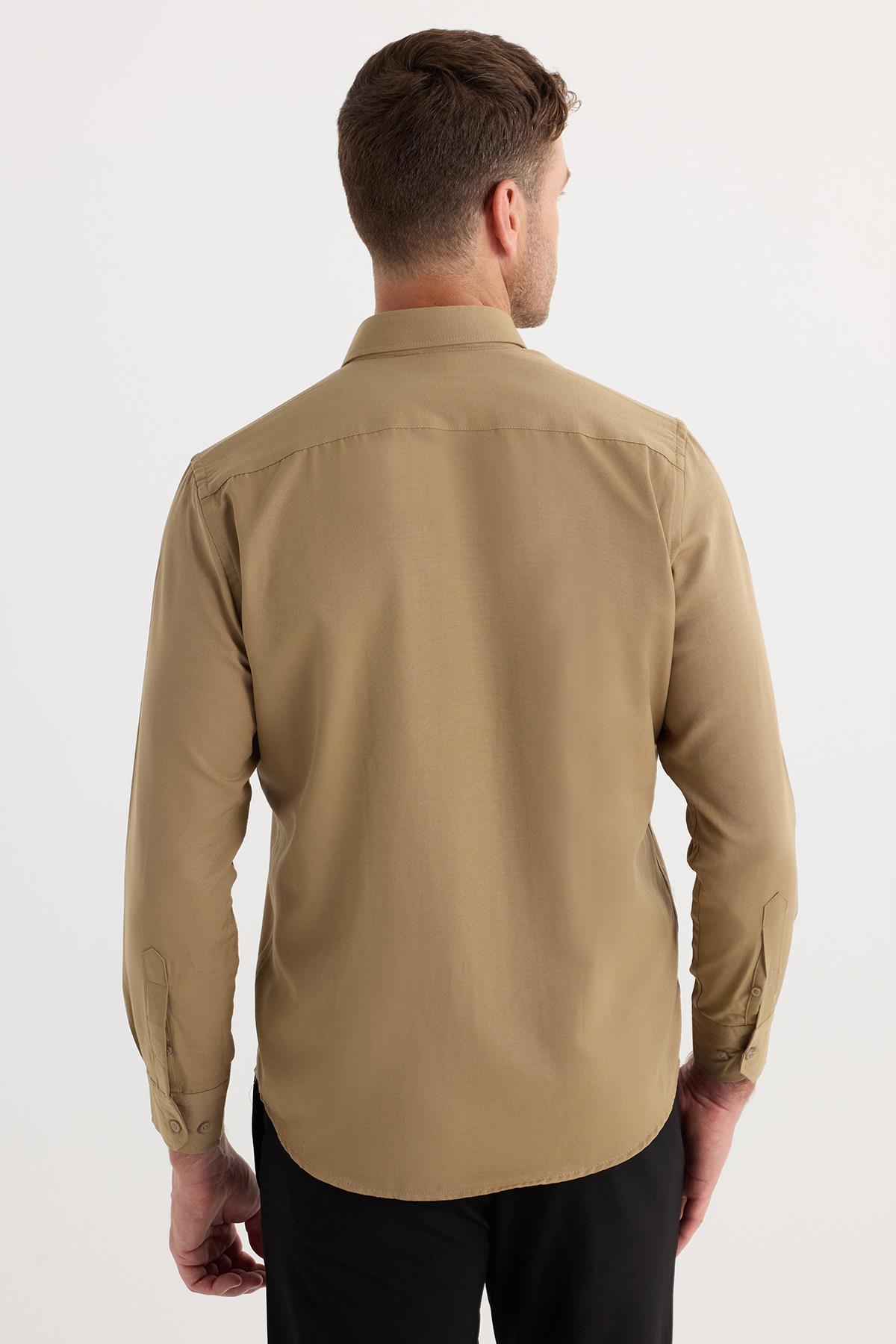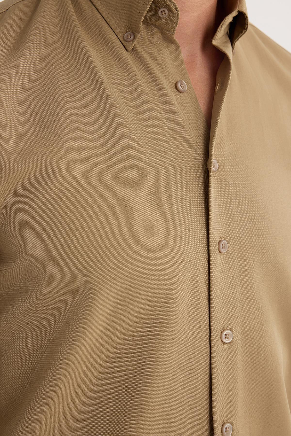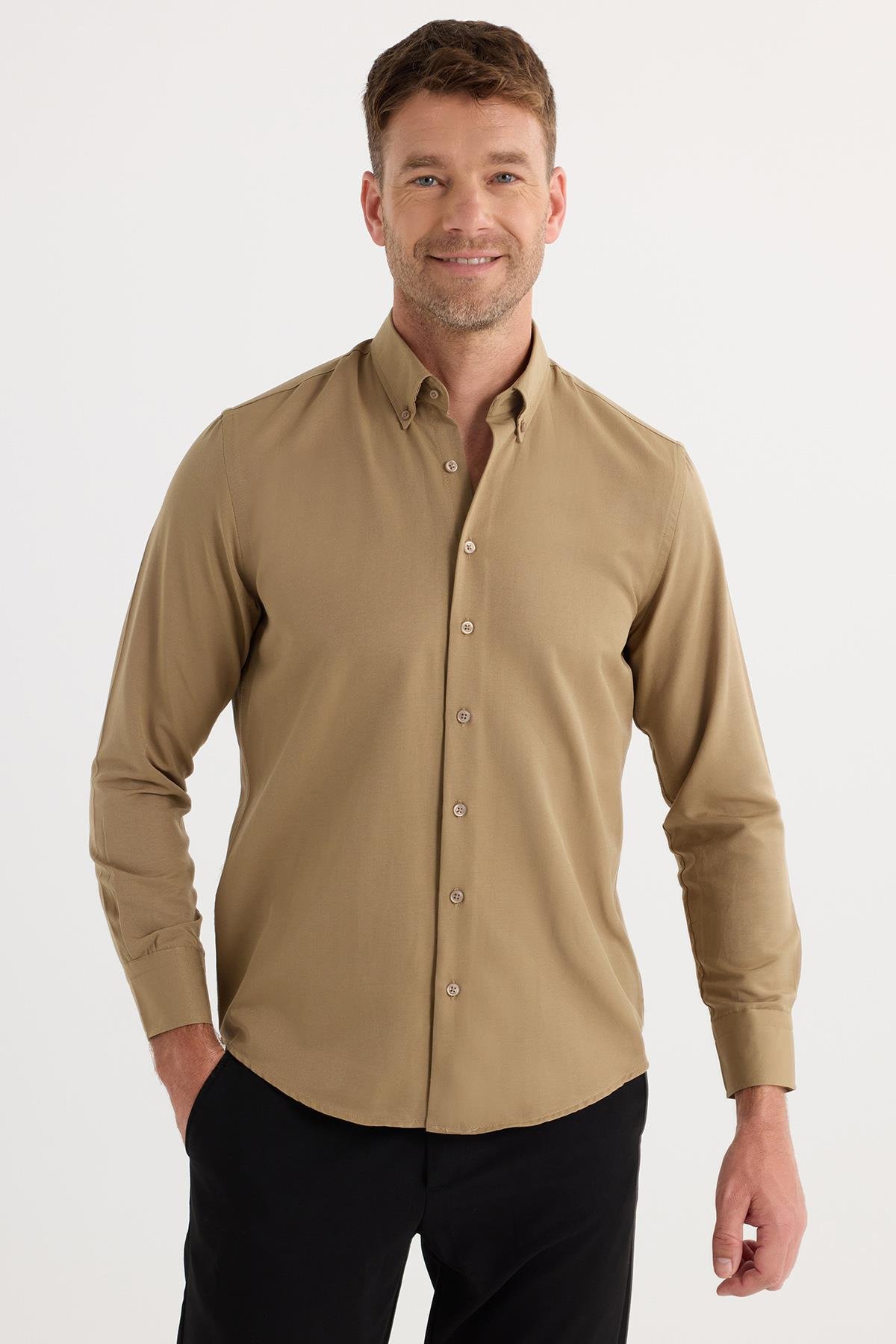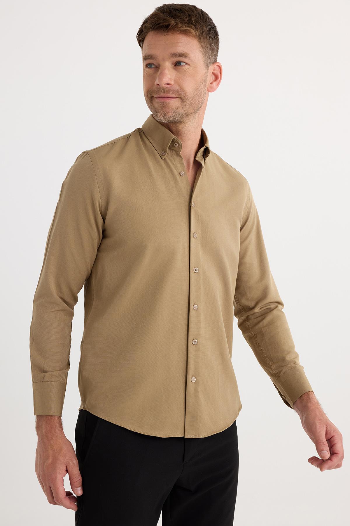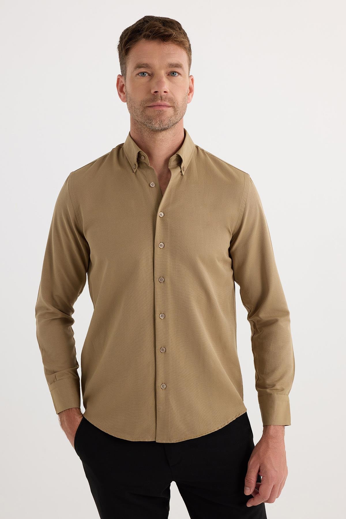 Regular Fit Düğmeli Yaka Pamuklu Kolay Ütü Oxford Düz Erkek Vizon Gömlek