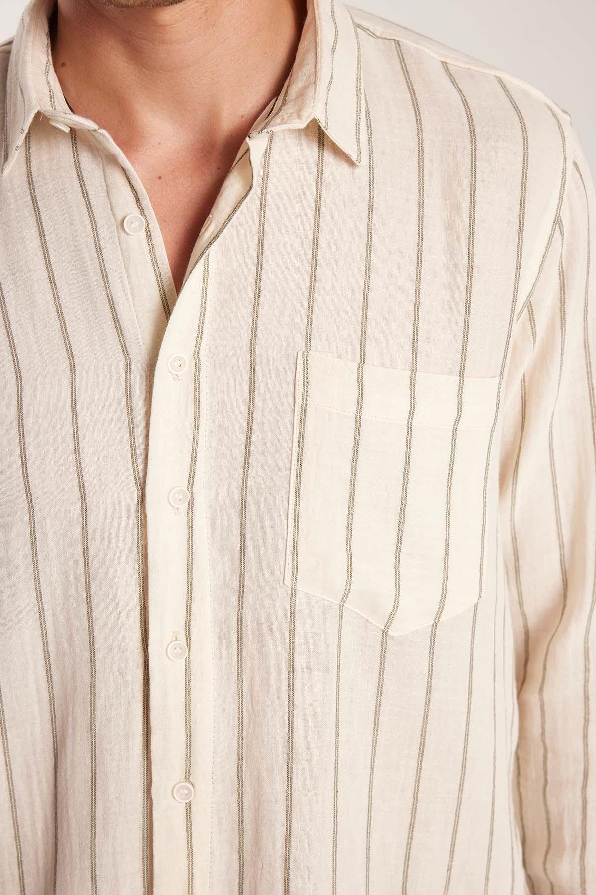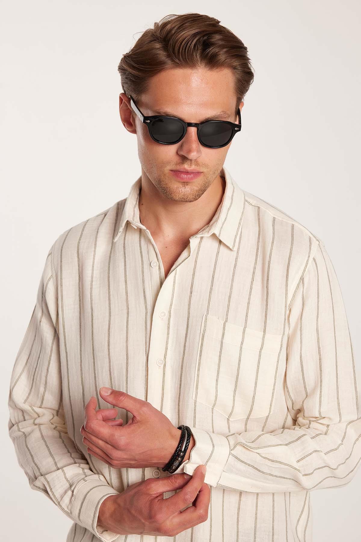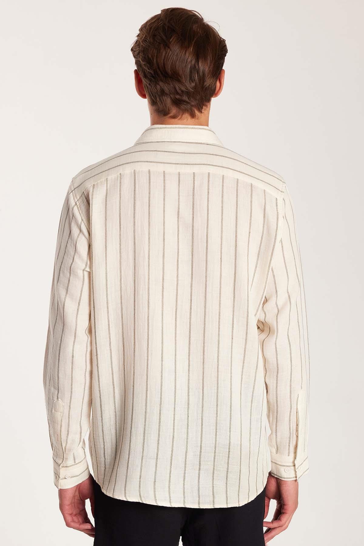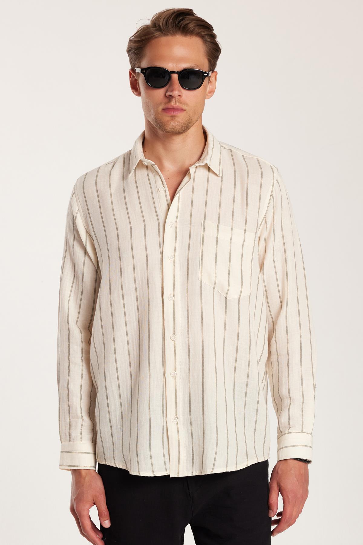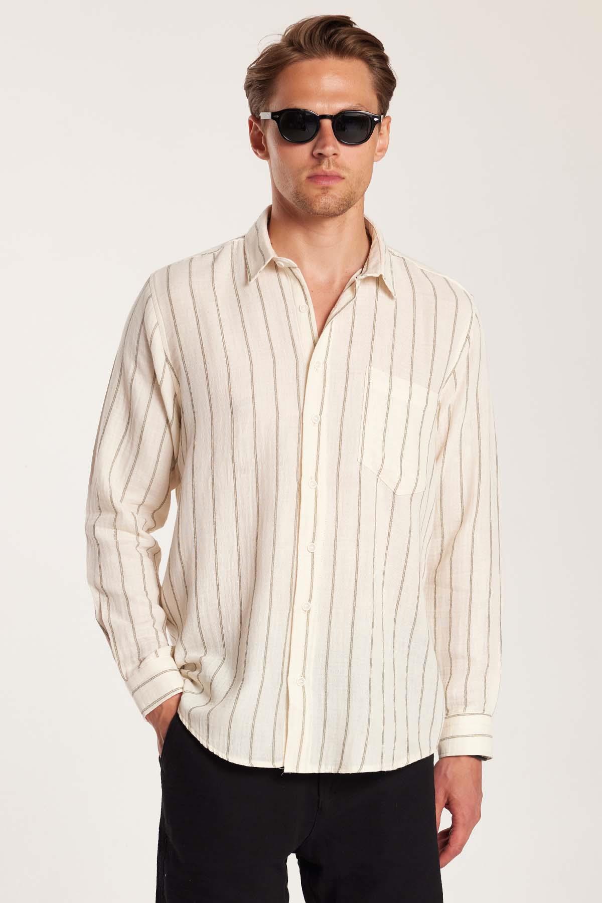 Regular Fit Keten Görünüm Pamuklu Çizgili Dökümlü Rahat Cepli Spor Gömlek