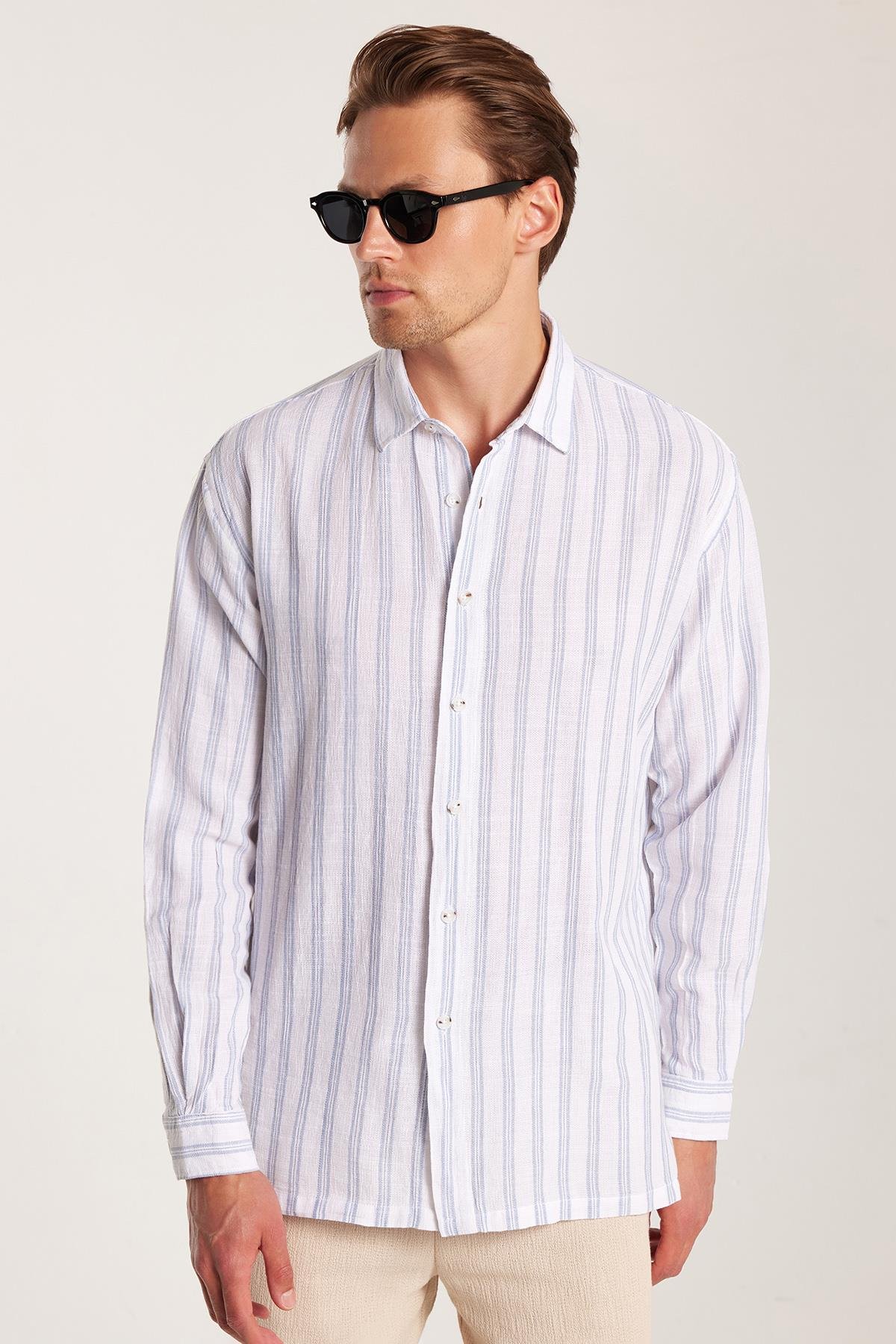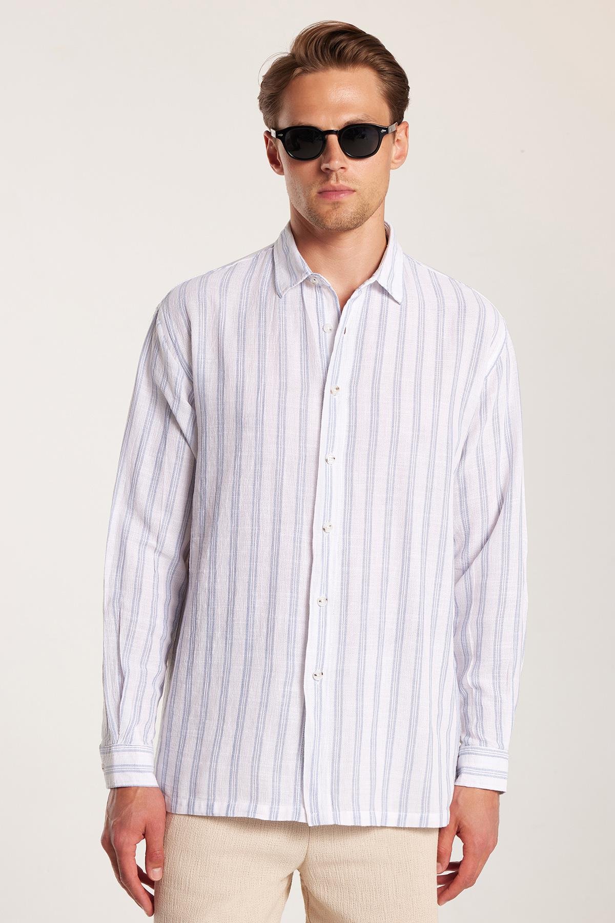 Relax Fit Oversize Dökümlü Rahat Kesim Çizgili Keten Spor Erkek Gömlek