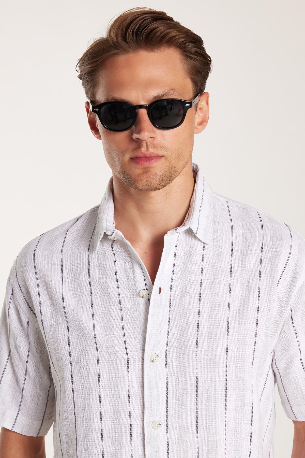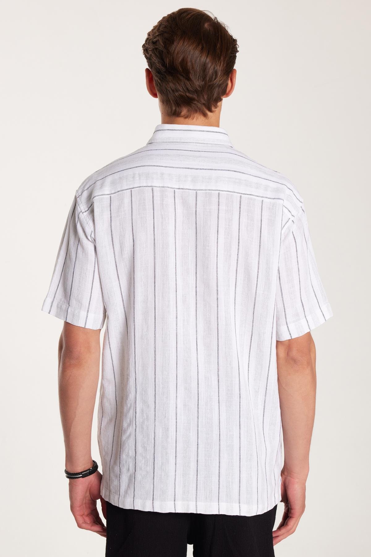 Relax Fit Oversıze Pamuklu Keten Efekt Çizgili Özel Tasarım Erkek Gömlek