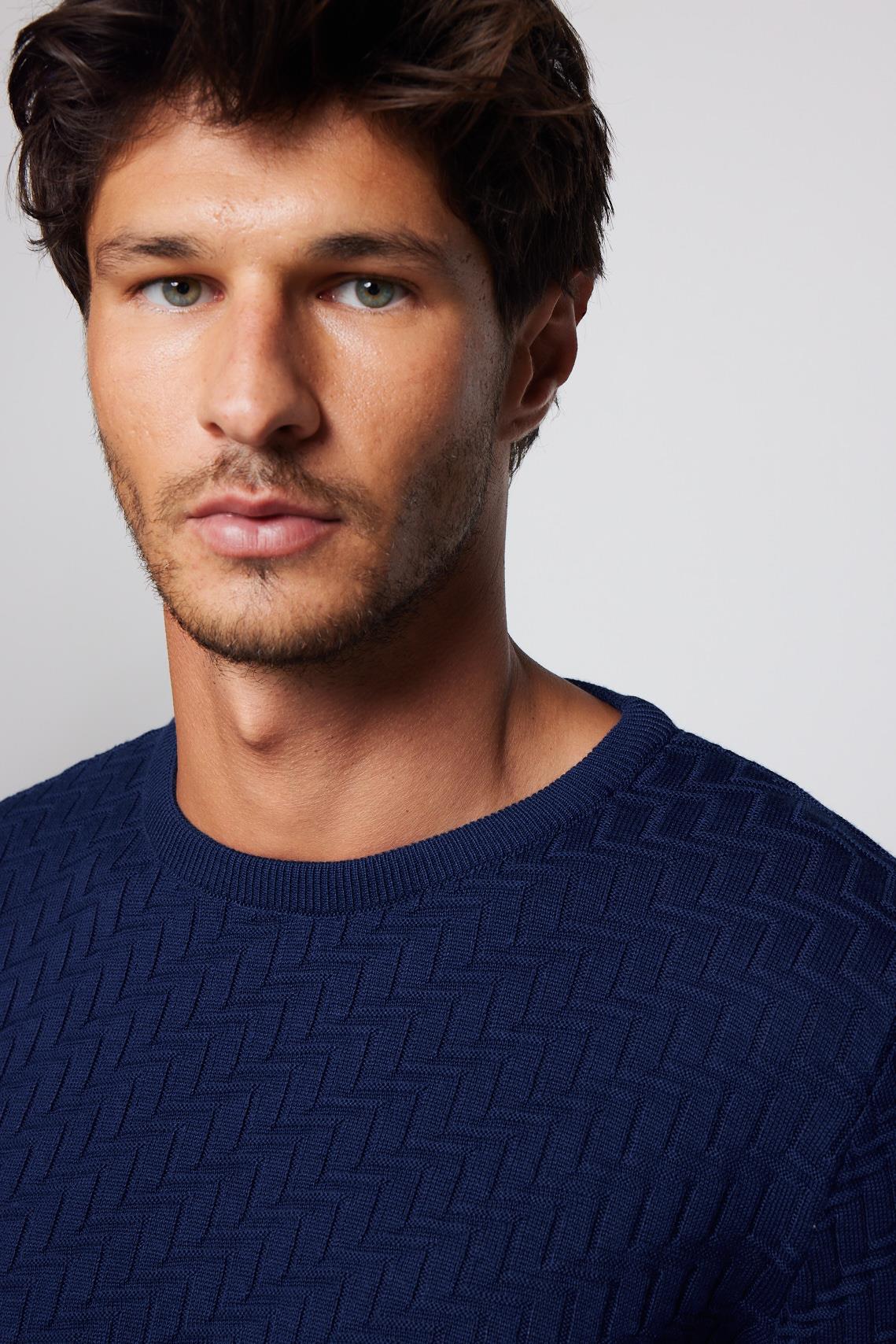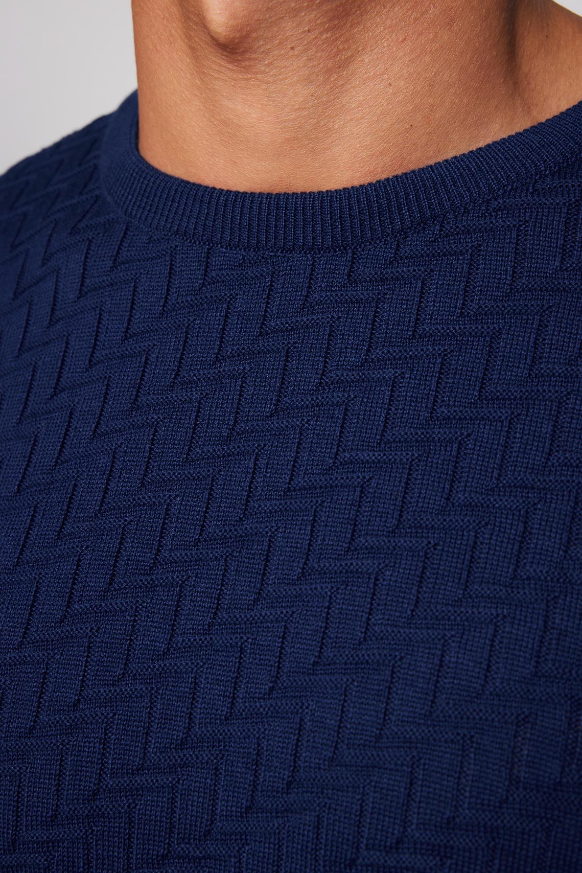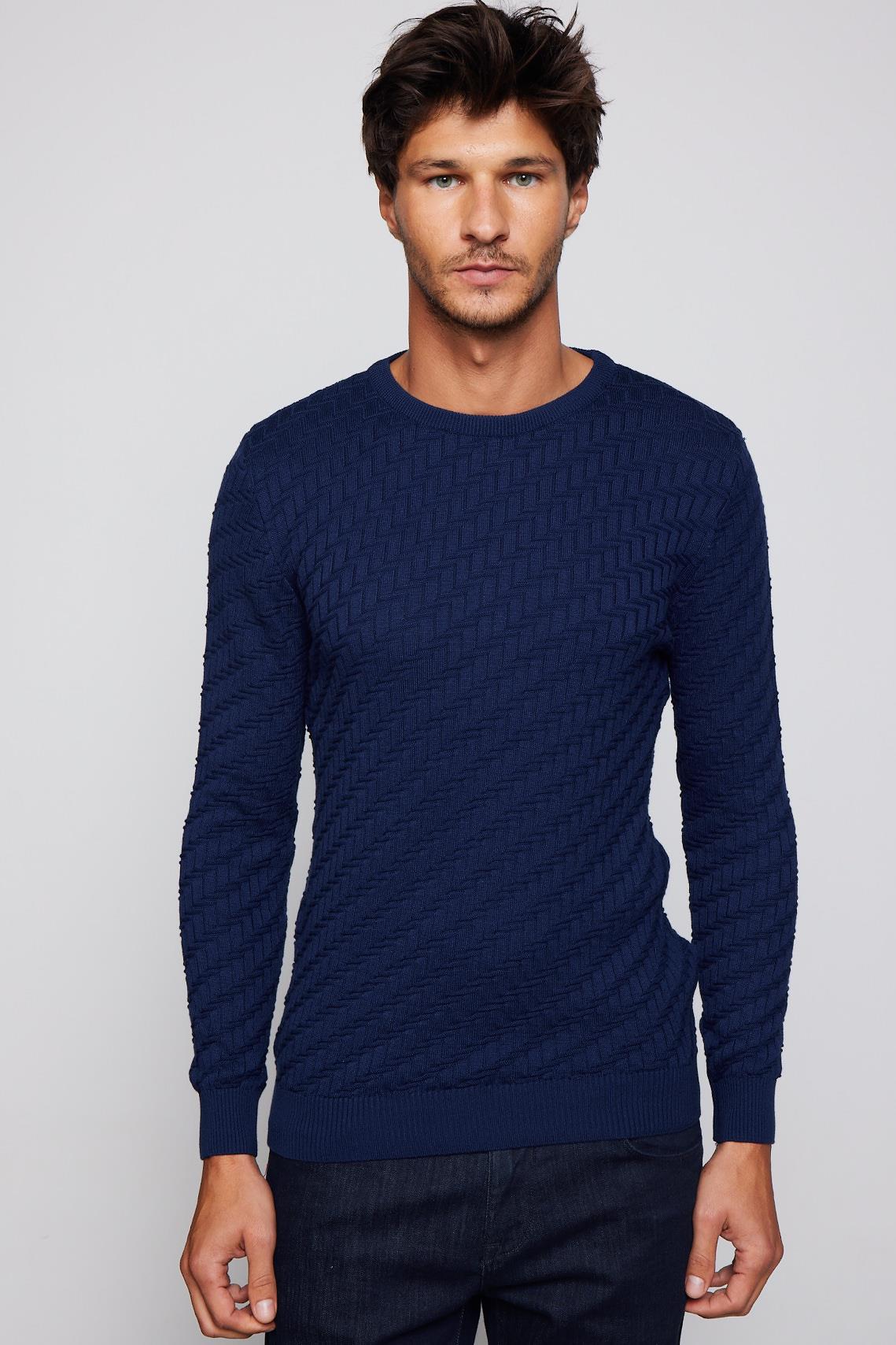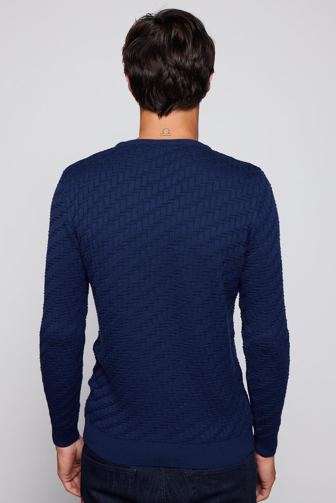 Erkek Slim Fit Dar Kesim Bisiklet Yaka Desenli Sax Mavi Triko Kazak (KZ240009-K18)