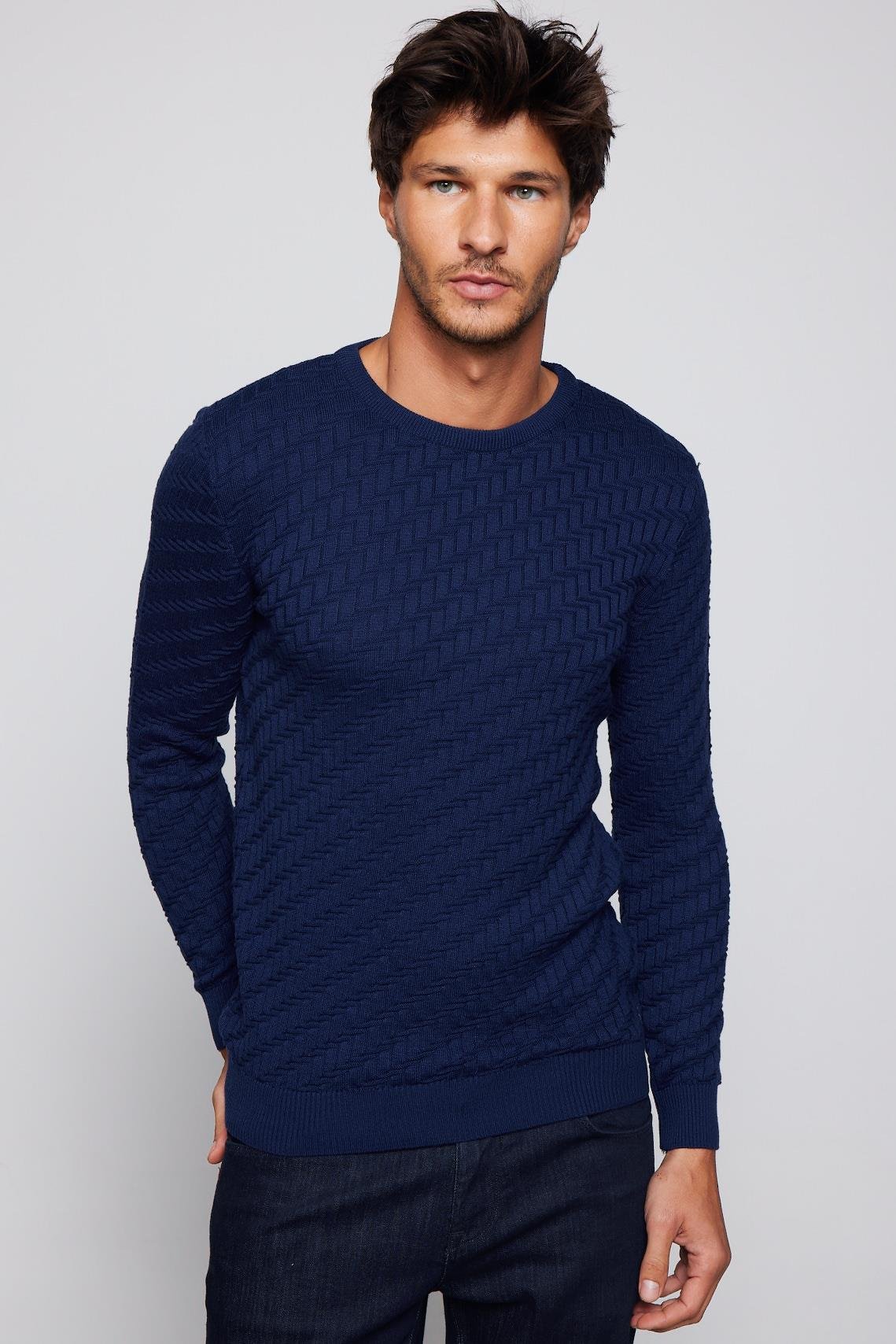 Erkek Slim Fit Dar Kesim Bisiklet Yaka Desenli Sax Mavi Triko Kazak