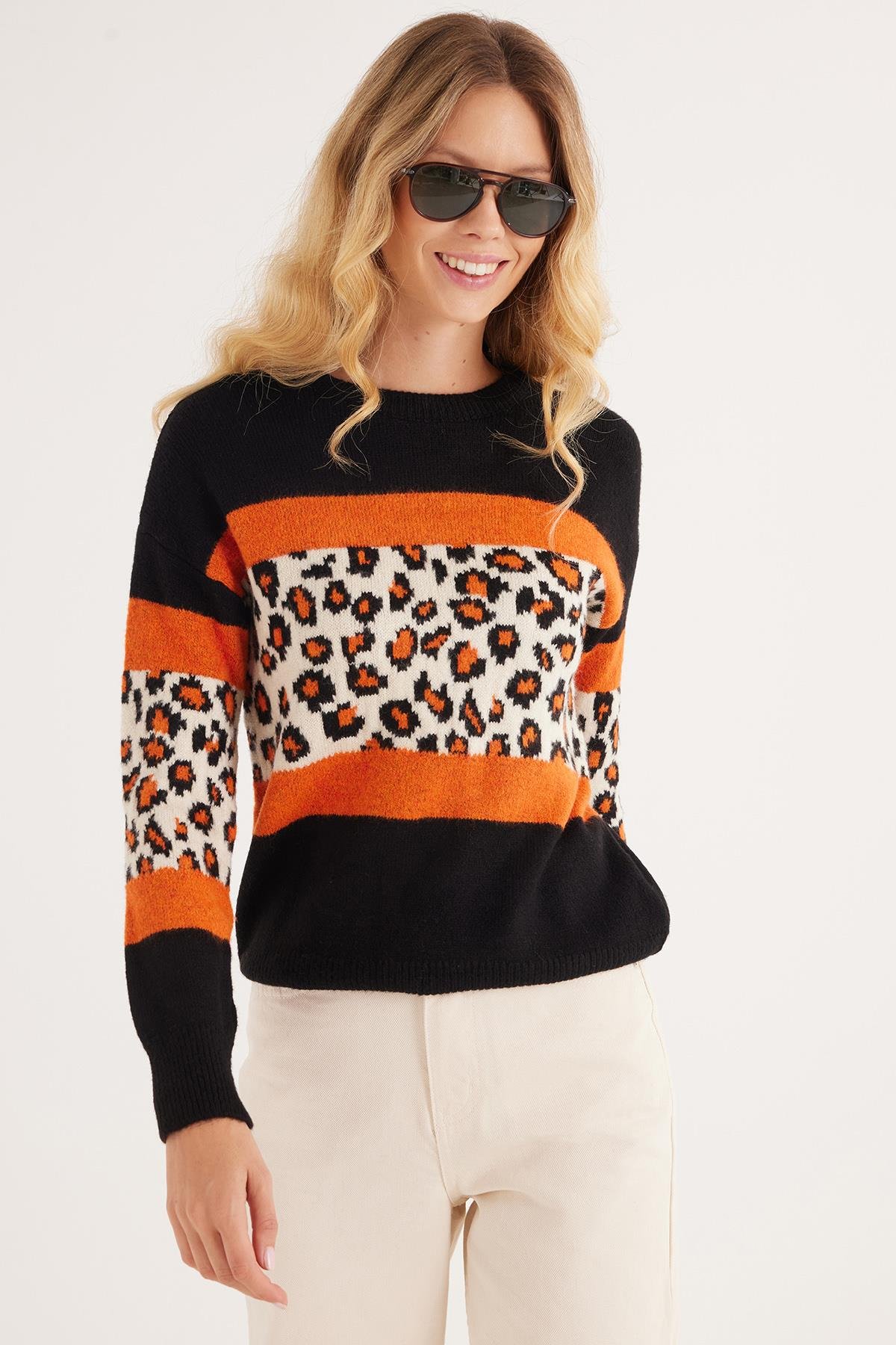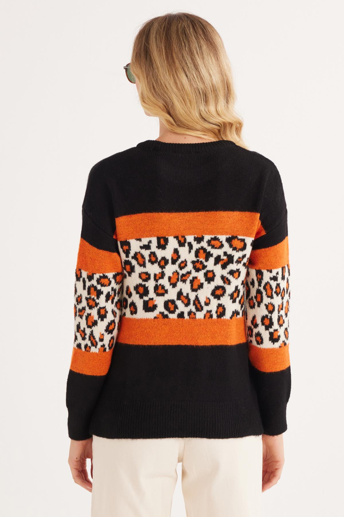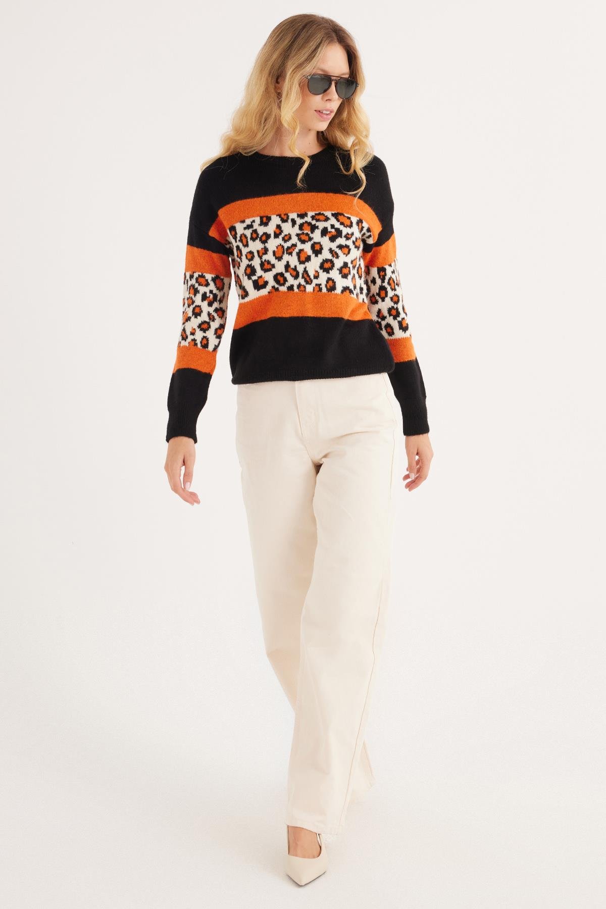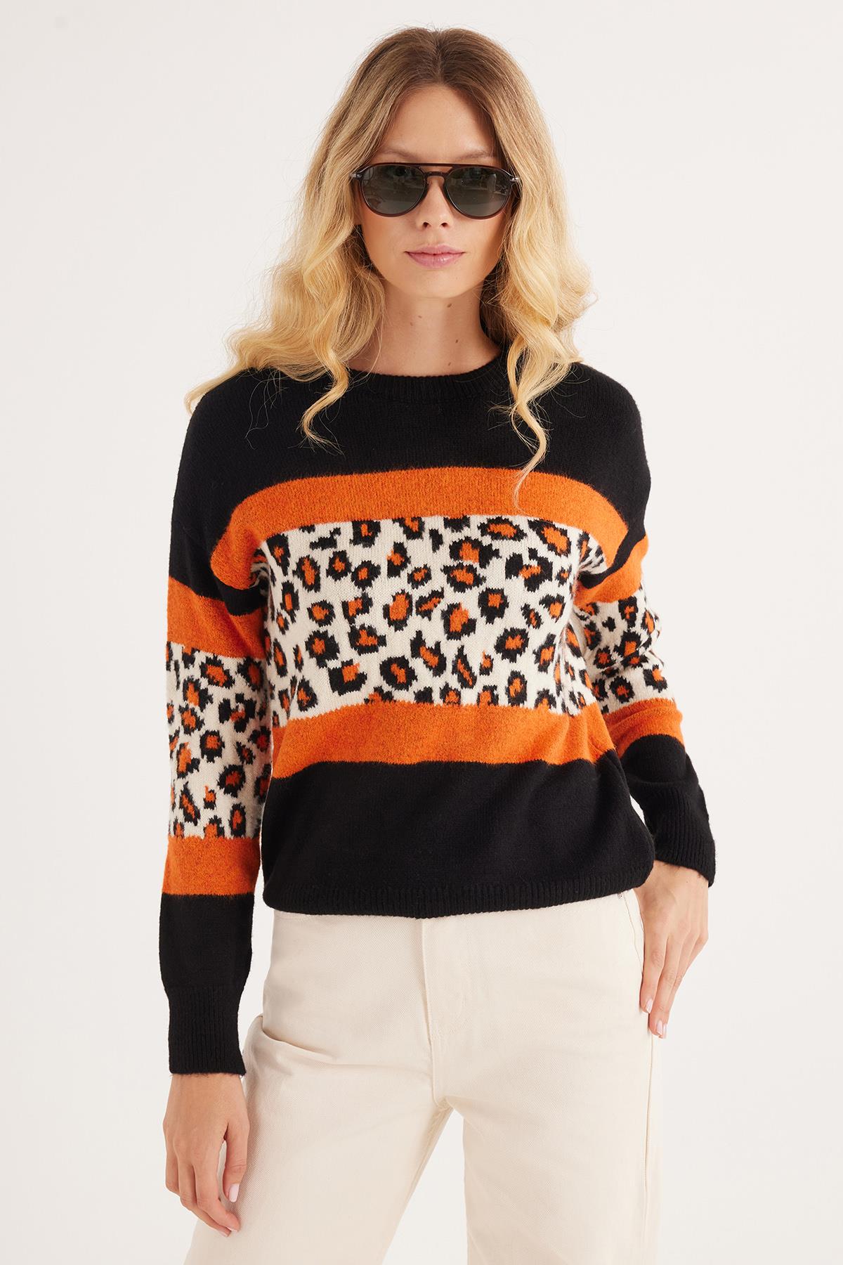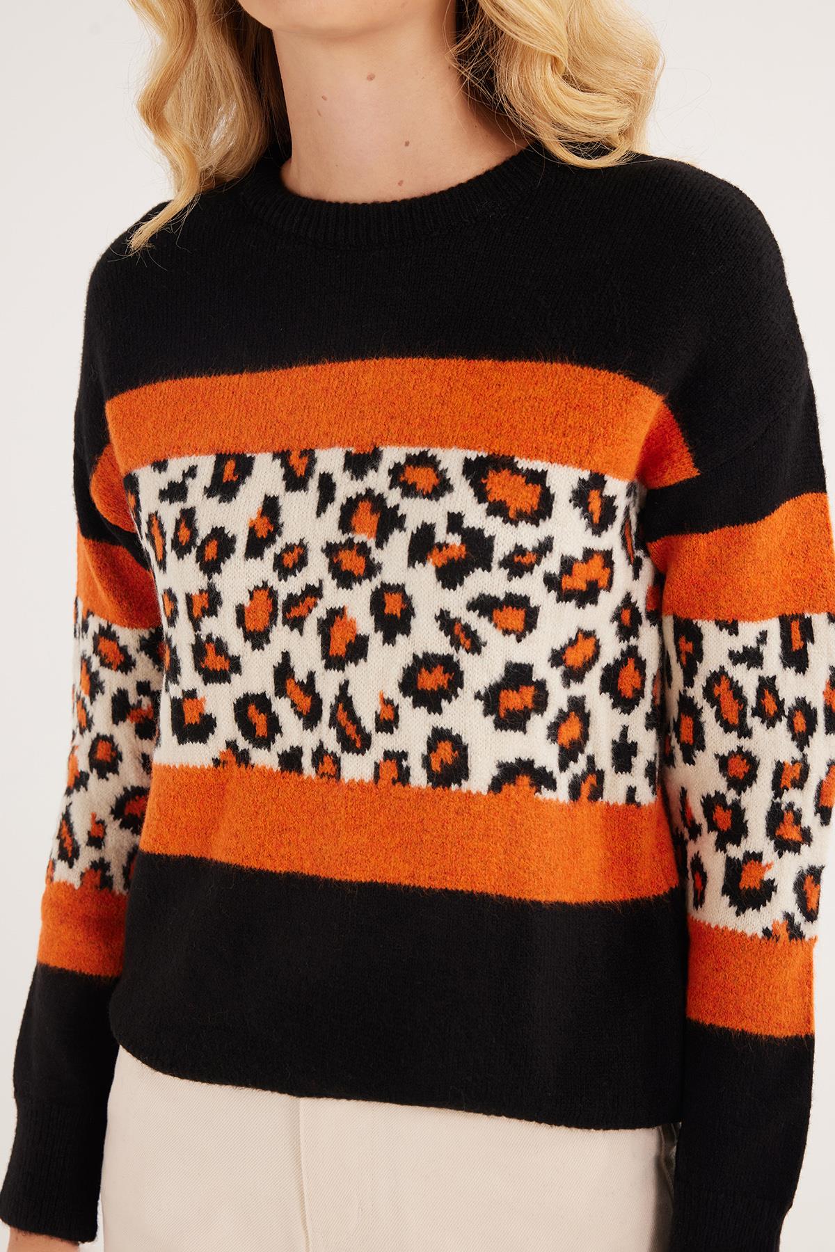 Slim Fit Dar Kesim Bisiklet Yaka Leopar Desenli Siyah Kazak (BYKZ2511-02)