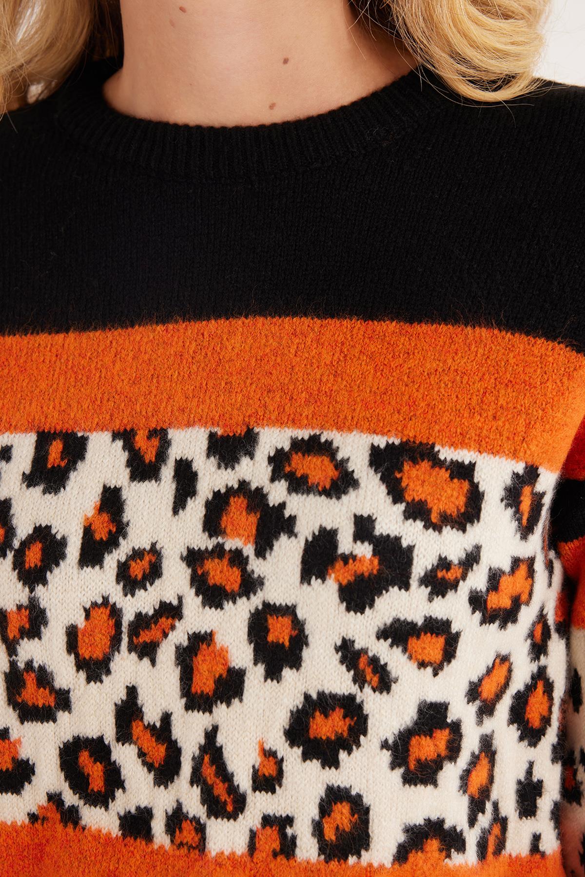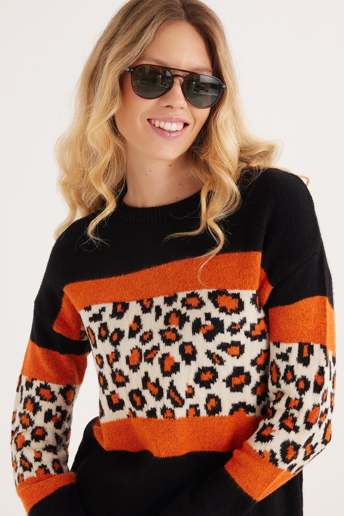 Slim Fit Dar Kesim Bisiklet Yaka Leopar Desenli Siyah Kazak