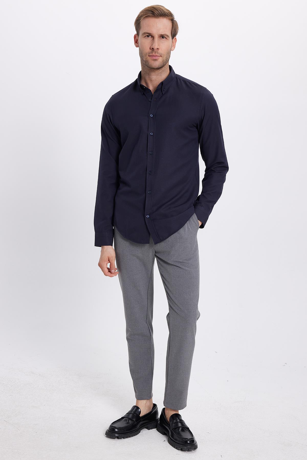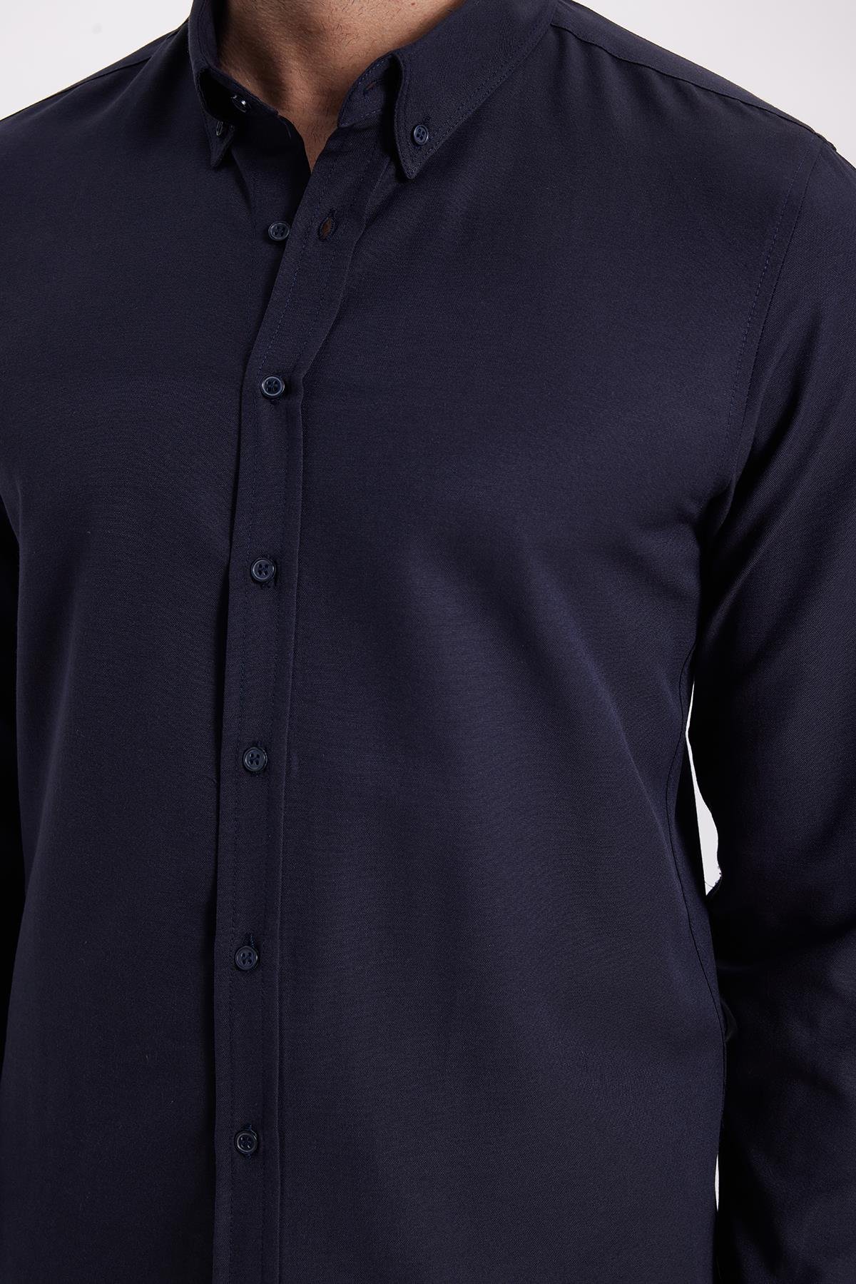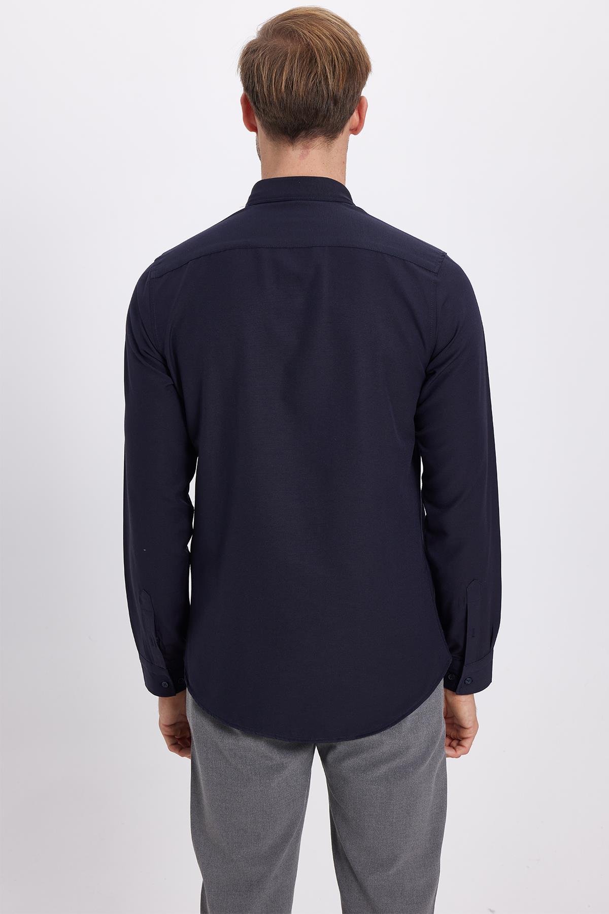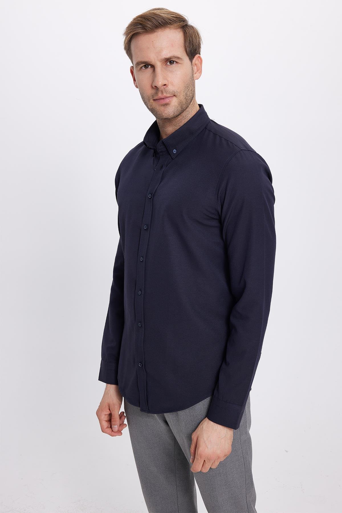 Erkek Slim Fit Dar Kesim Uzun Kollu Pamuklu Oxford Doku Kolay Ütü Lacivert Düğmeli Yaka Gömlek (DR240053-5010)