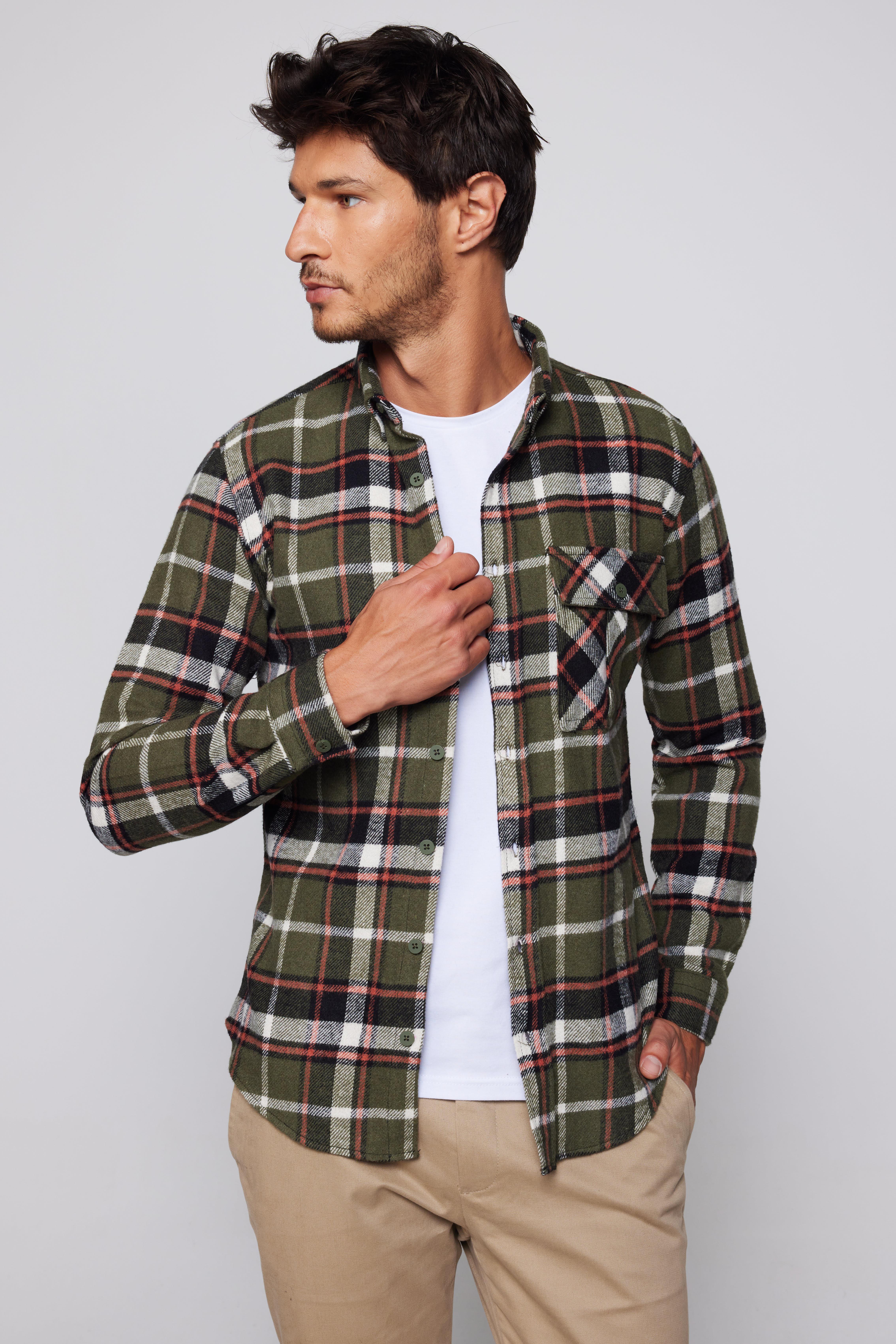 Erkek Slim Fit Dar Kesim Uzun Kollu Kareli Tek Cepli Kışlık Oduncu Yeşil Düğmeli Yaka Gömlek