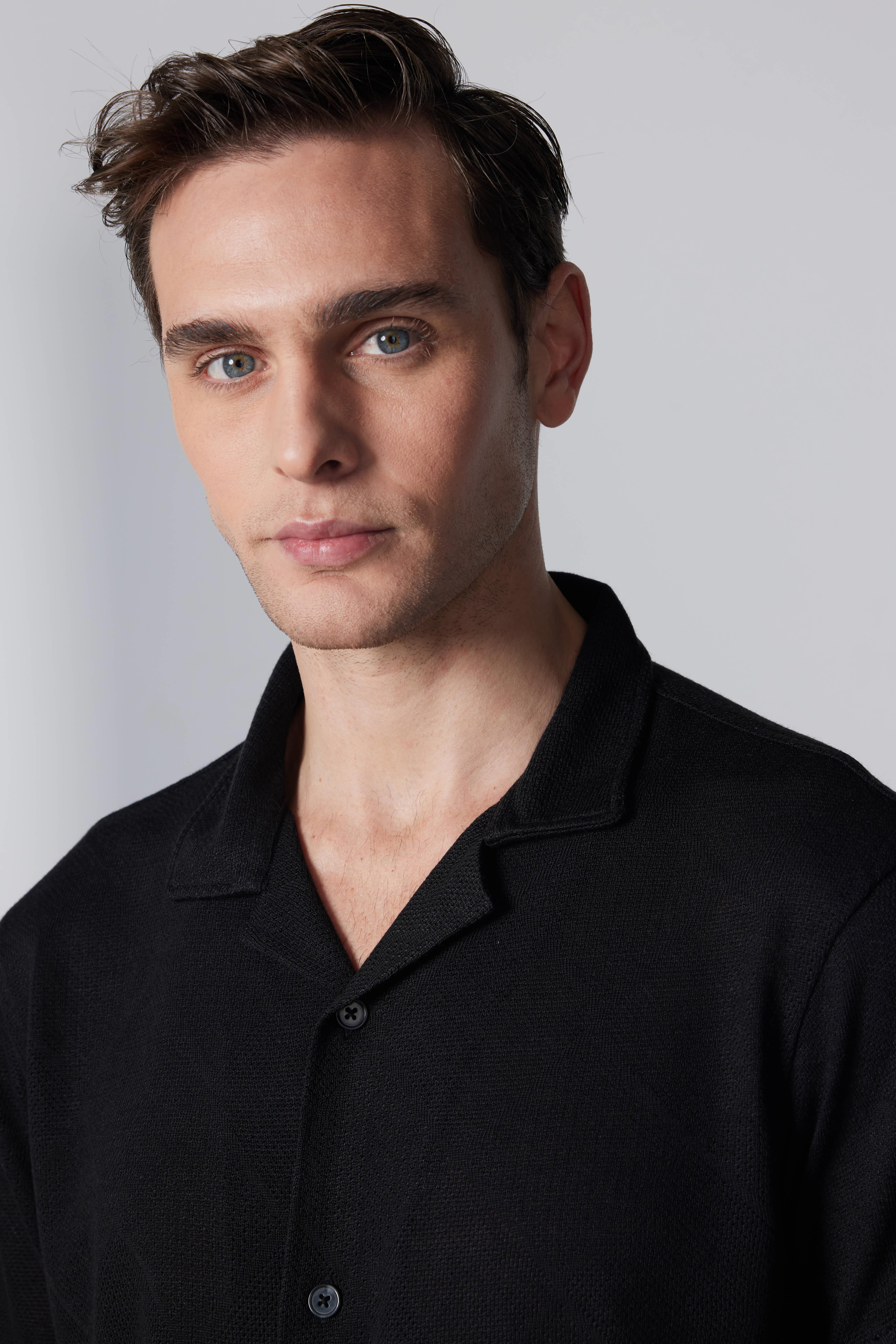 Erkek Slim Fit Dar Kesim Kısa Kollu Nefes Alan Örme Doku Kare Desenli Siyah Apaş Yaka Gömlek