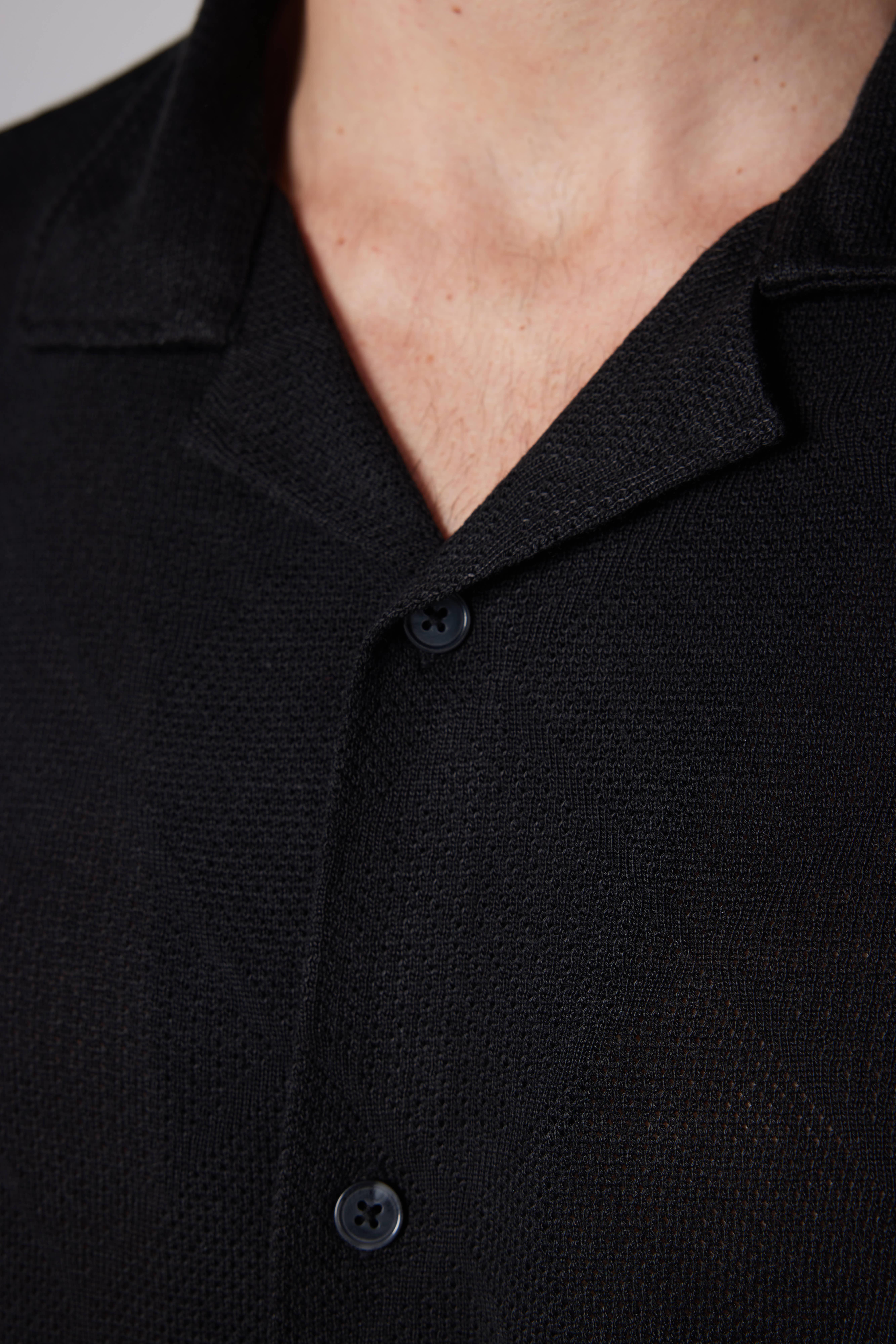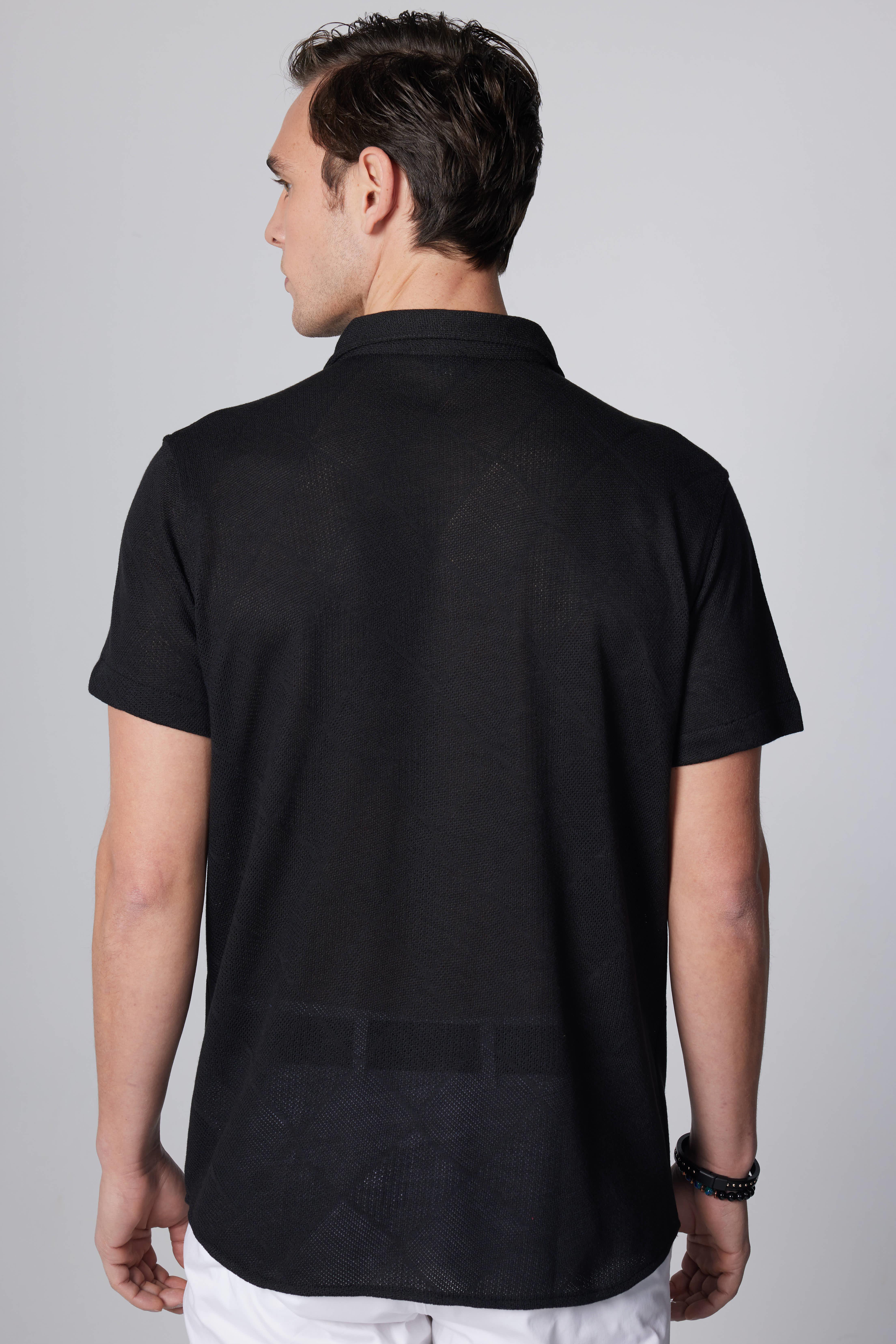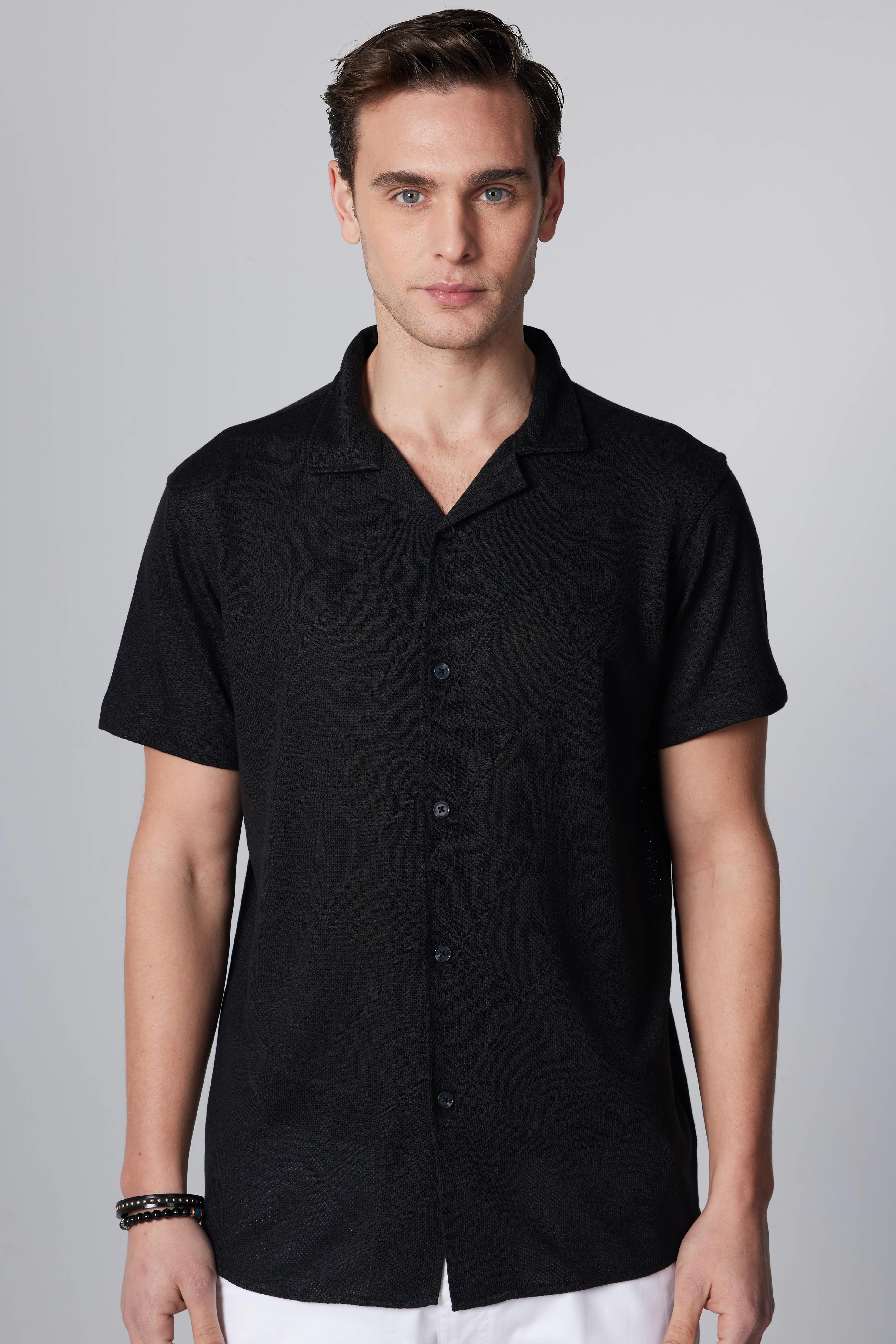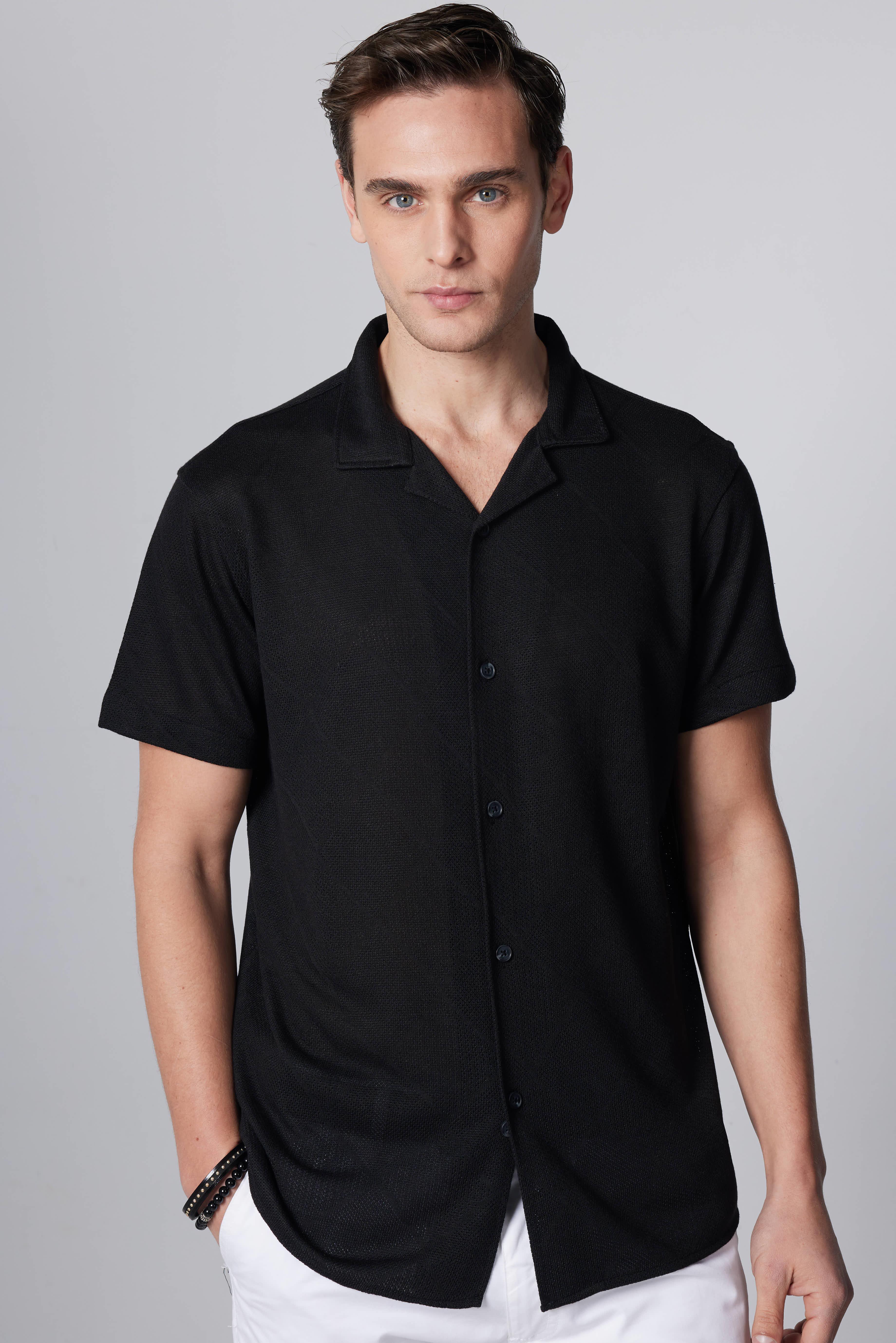 Erkek Slim Fit Dar Kesim Kısa Kollu Nefes Alan Örme Doku Kare Desenli Siyah Apaş Yaka Gömlek (DR240058-9702)