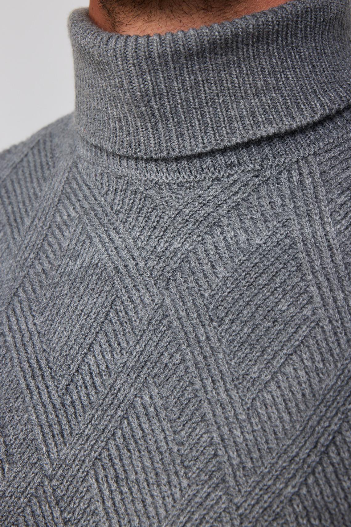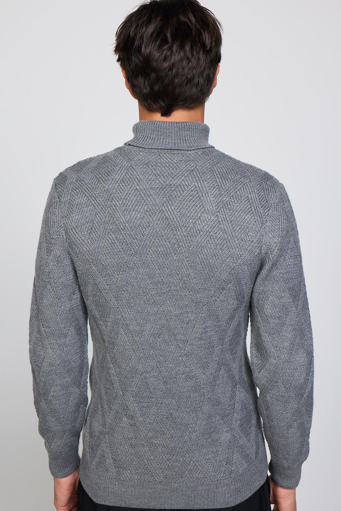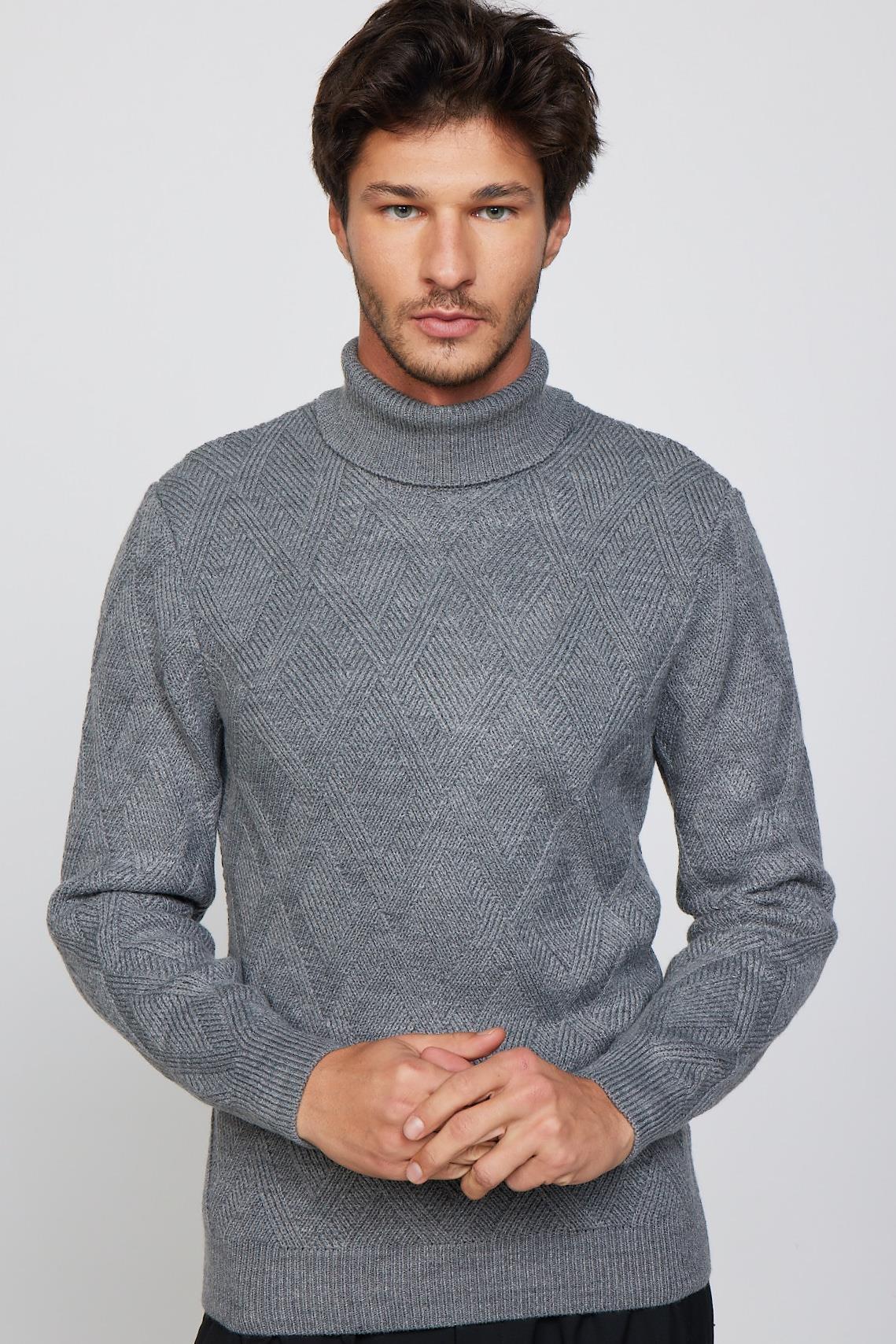 Slim Fit Dar Kesim Tam Balıkçı Yaka Desenli Gri Erkek Triko Kazak (KZ240004-79)