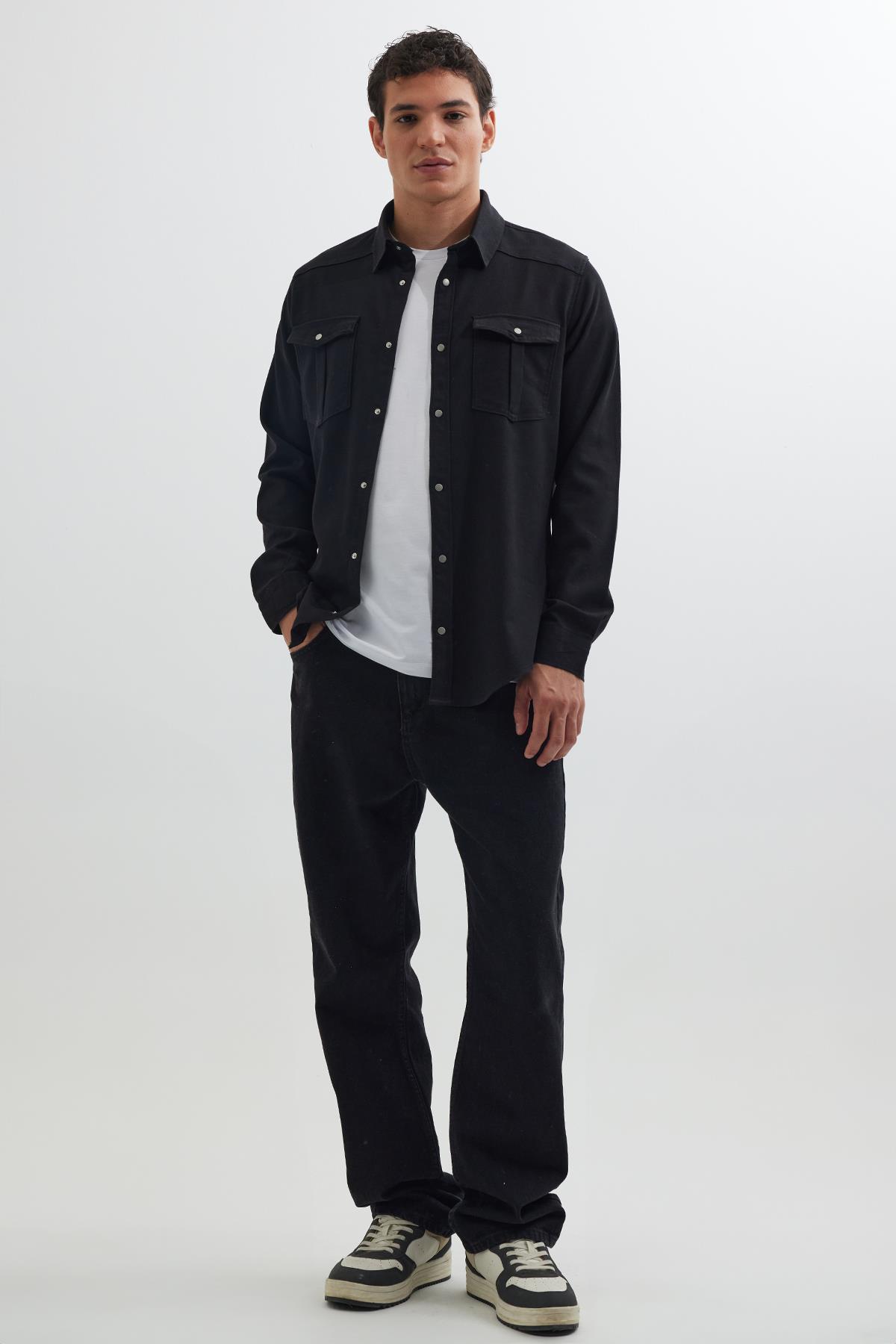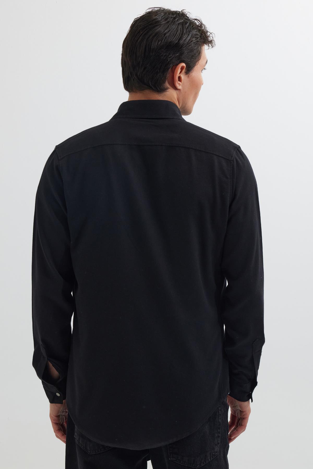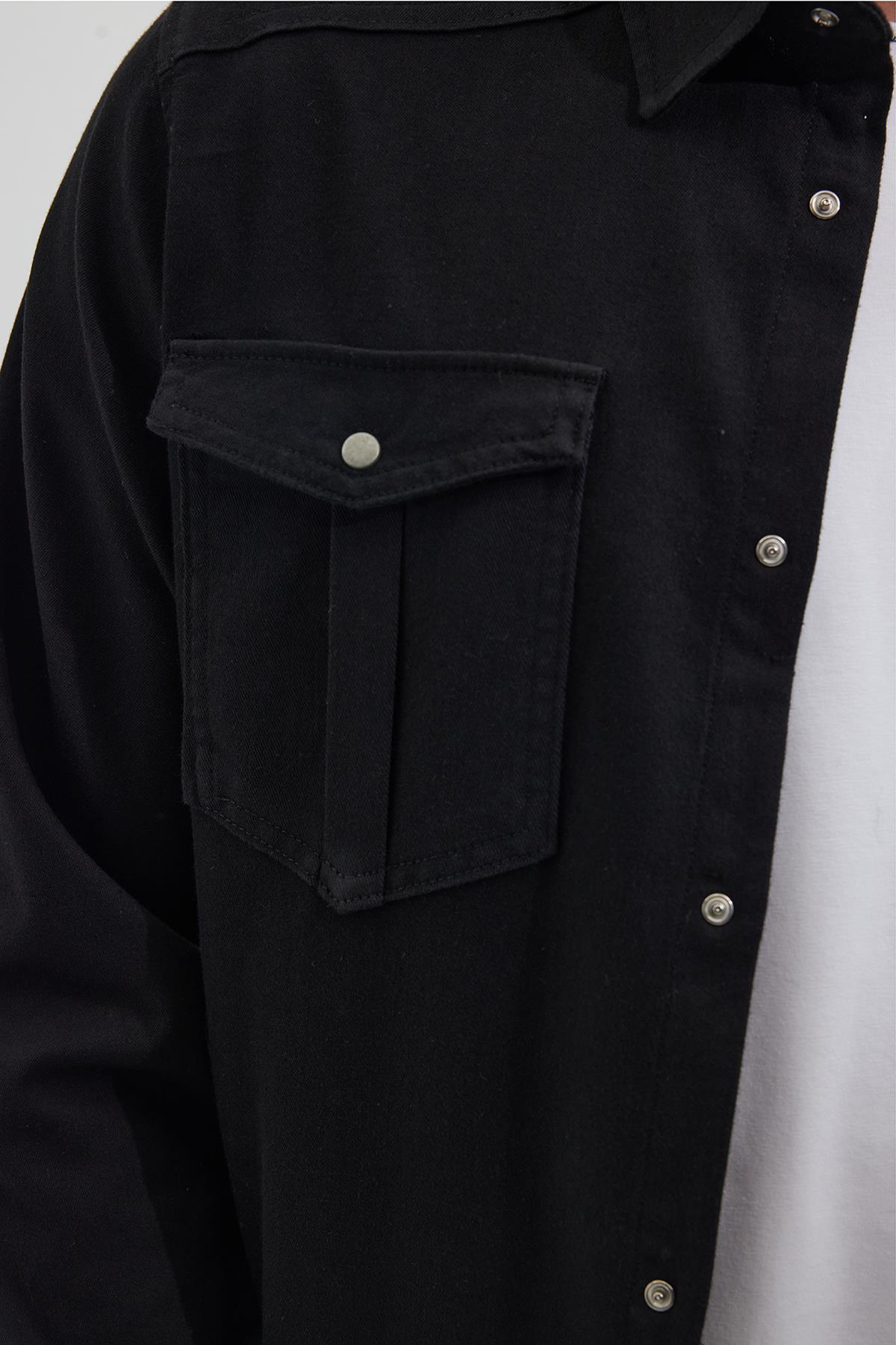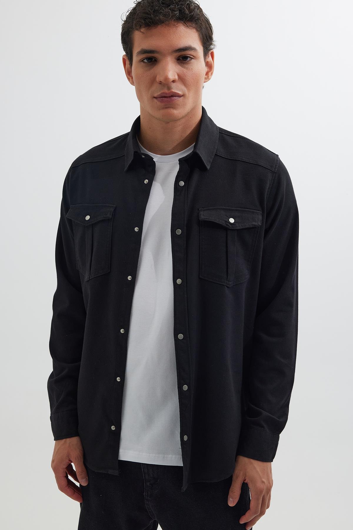 Slim Fit Uzun Kollu Dar Kesim Denim Kot Çift Cepli Spor Yaka Erkek Siyah Gömlek (DR210033-701)