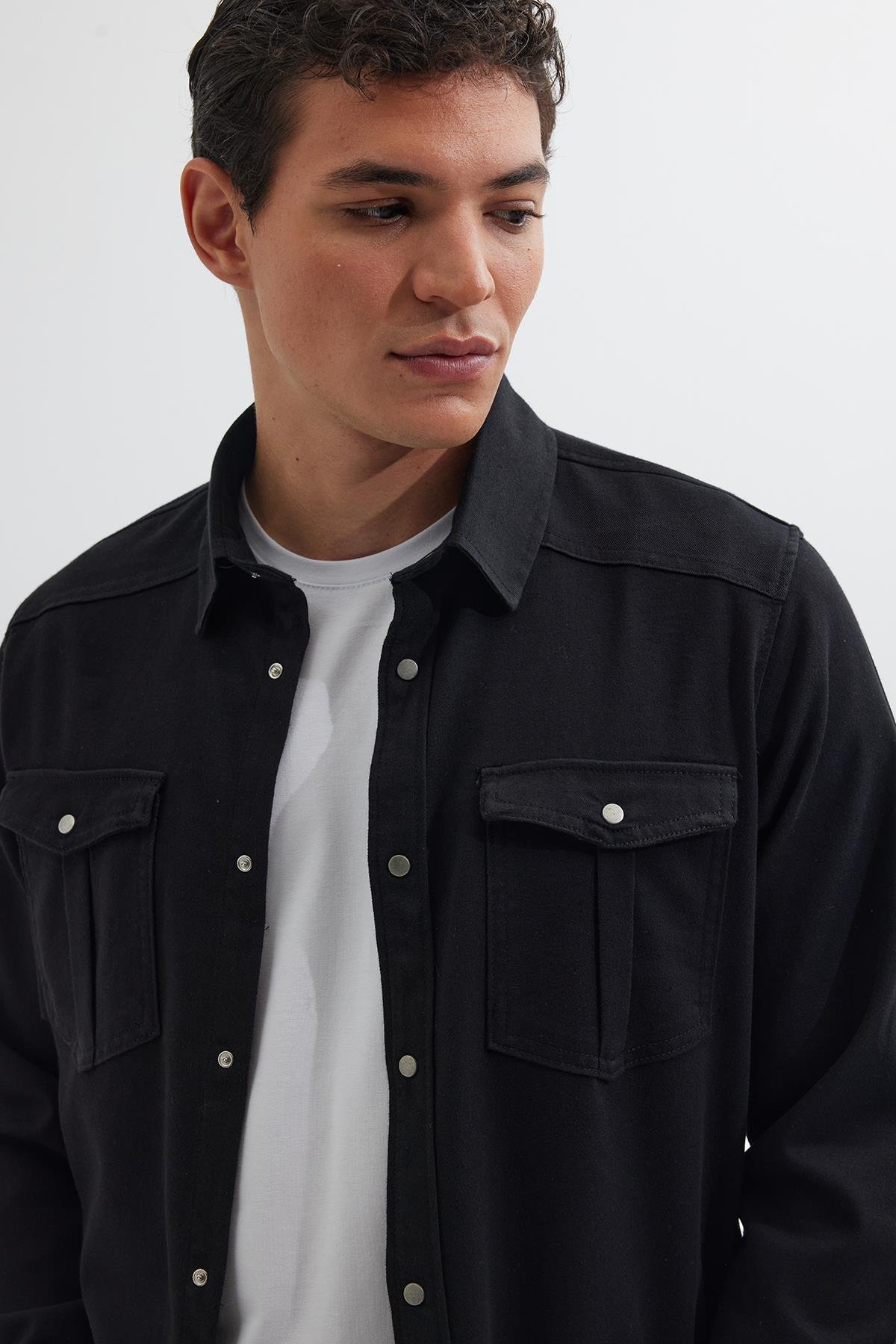 Slim Fit Uzun Kollu Dar Kesim Denim Kot Çift Cepli Spor Yaka Erkek Siyah Gömlek