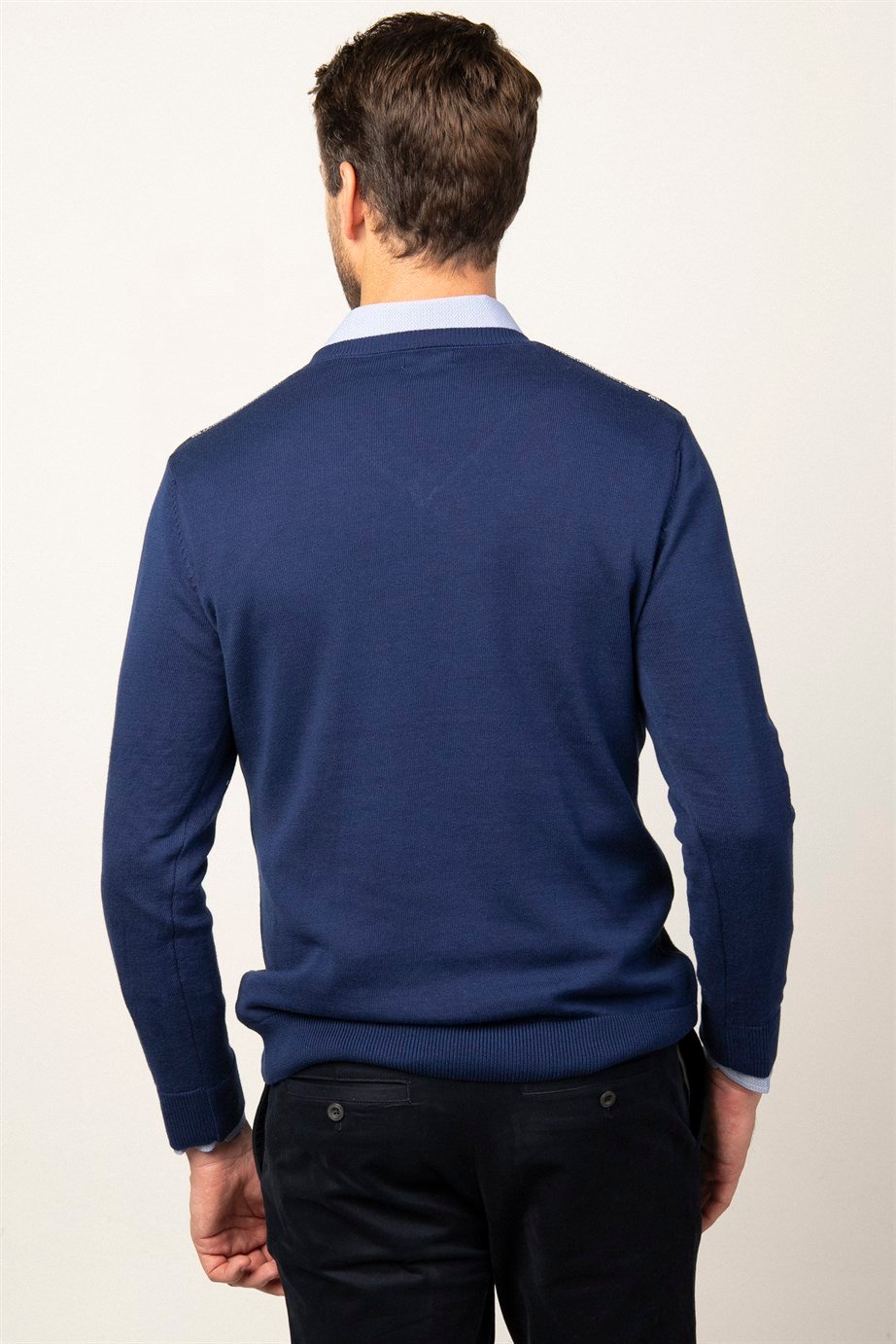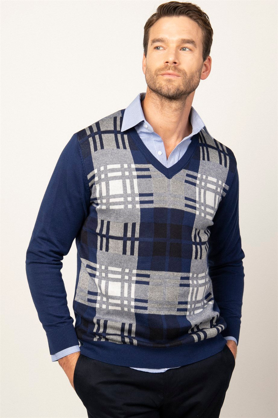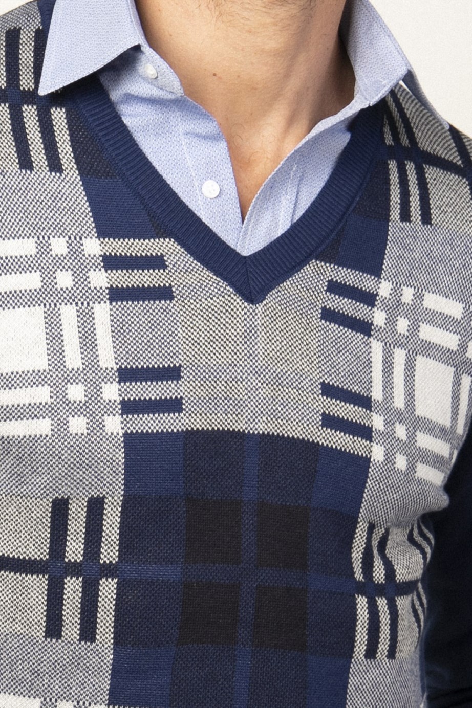 Erkek Slim Fit V Yaka Kareli Sax Mavi Triko Kazak