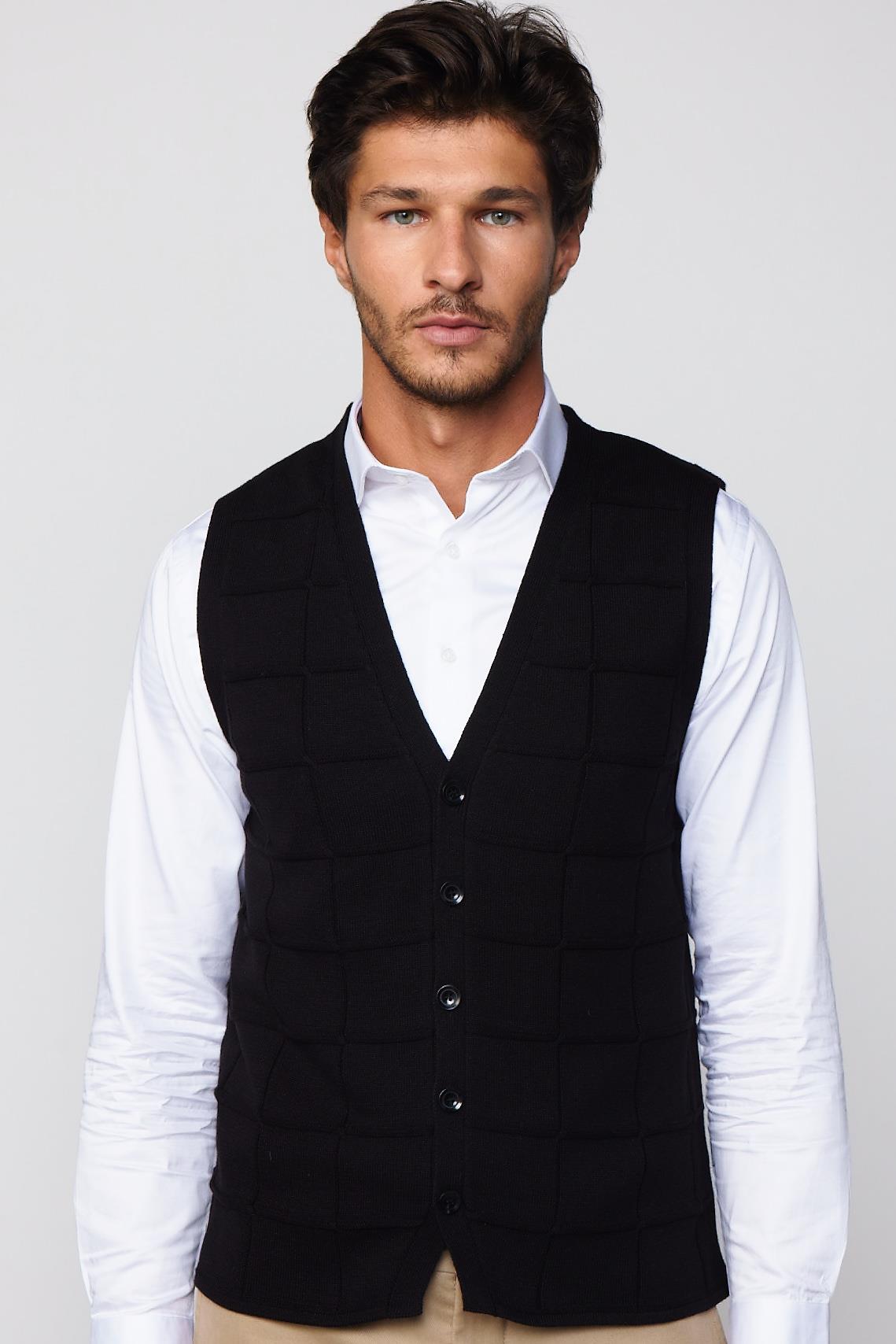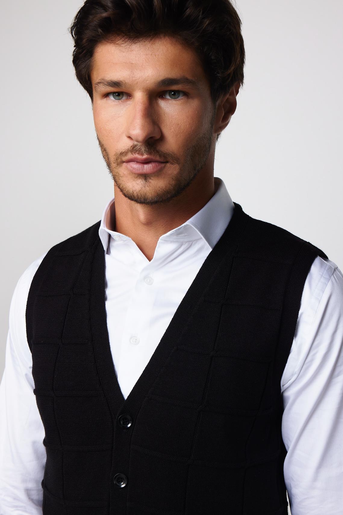 Slim Fit Kare Desenli Siyah Erkek Yelek (YL240001-02)