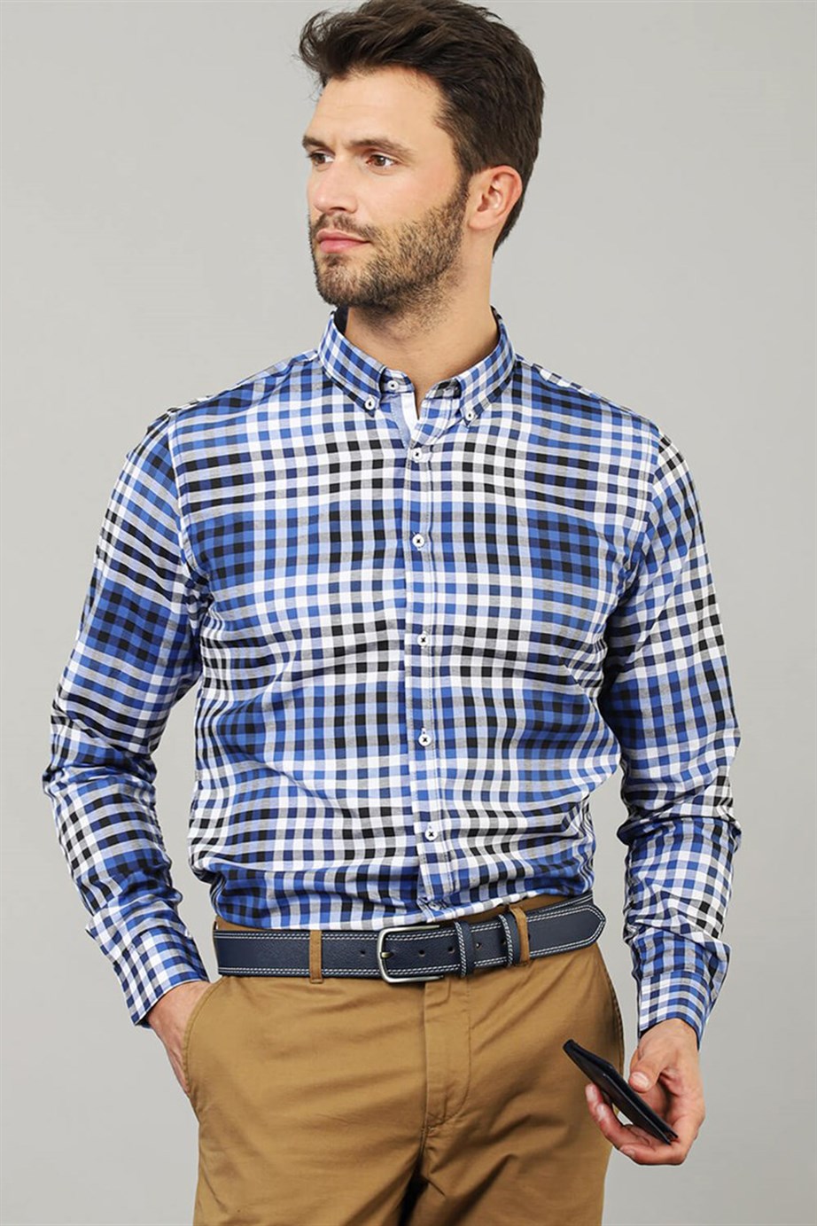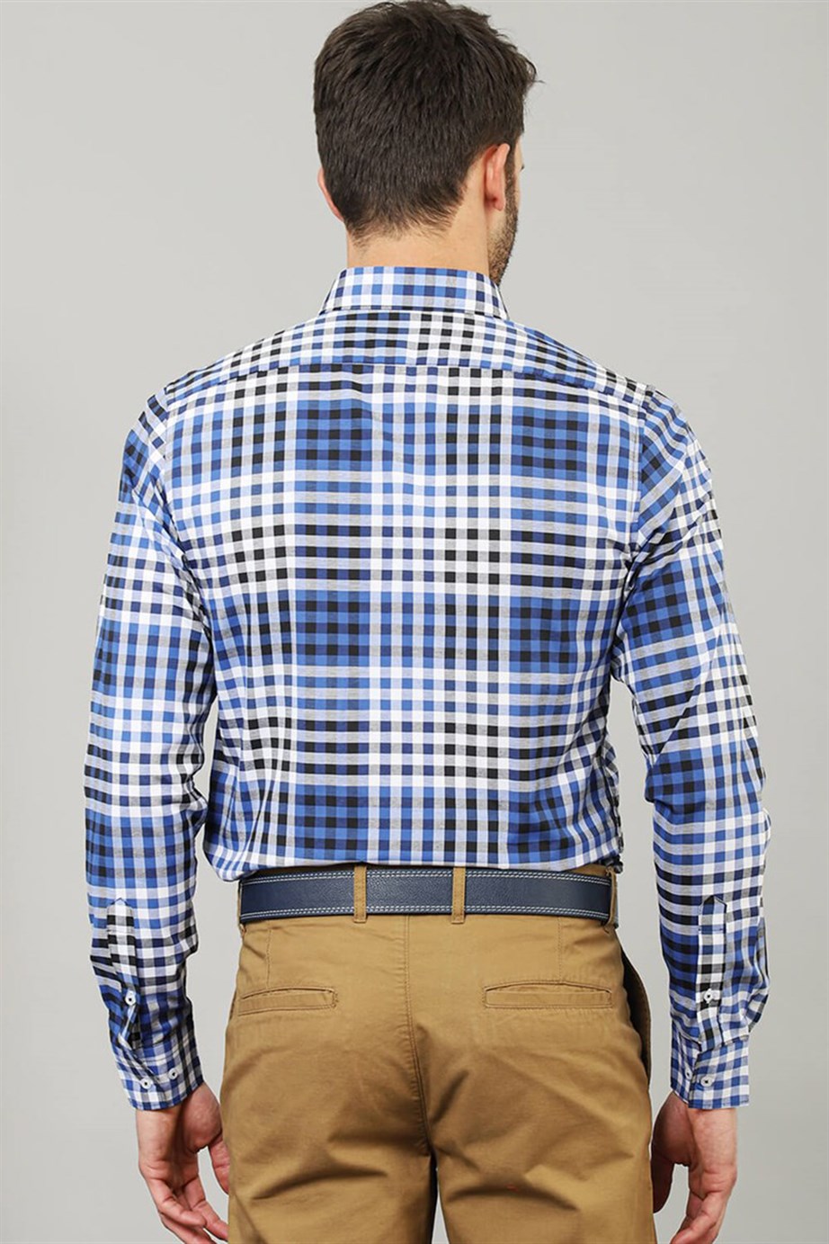 Slim Fit Uzun Kollu Düğmeli Yaka Kareli Pamuklu Kolay Ütü Erkek Gömlek (DR190028-502)
