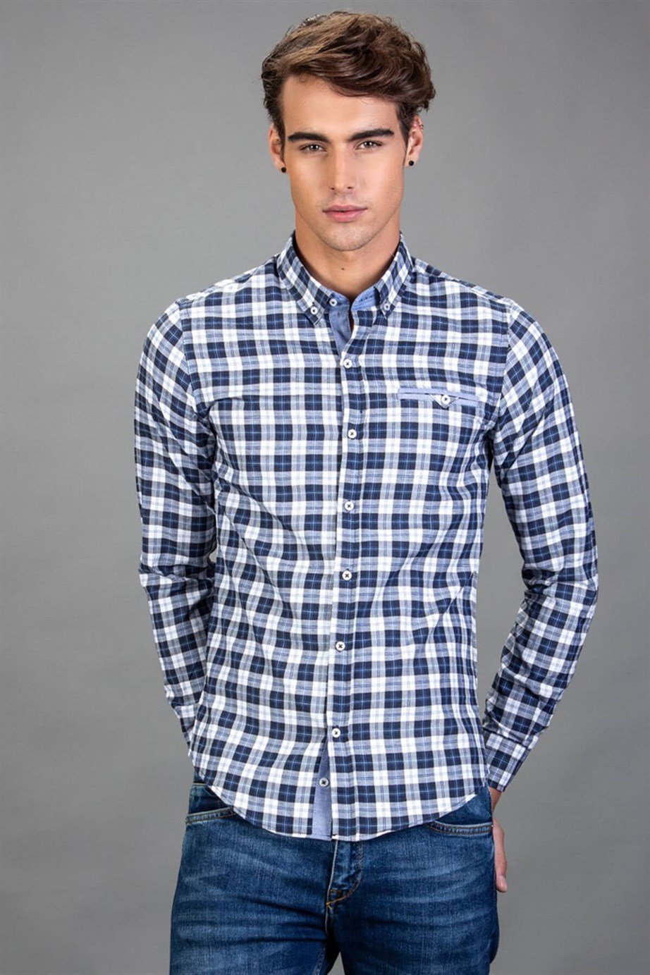Slim Fit Uzun Kollu Kareli Pamuklu Kolay Ütü Erkek Renkli Beyaz Gömlek (DR15109-221)