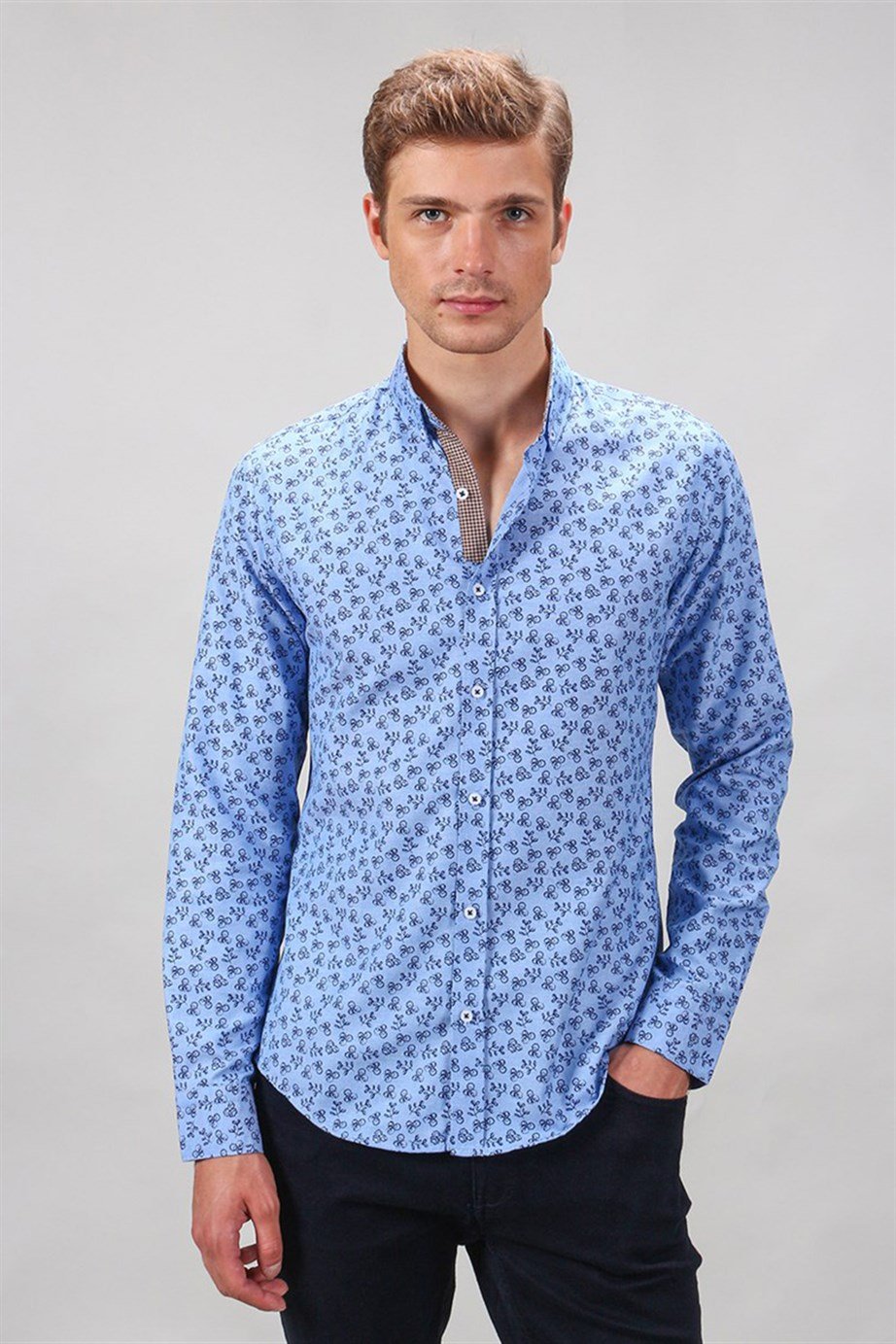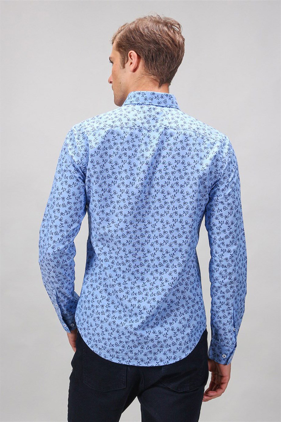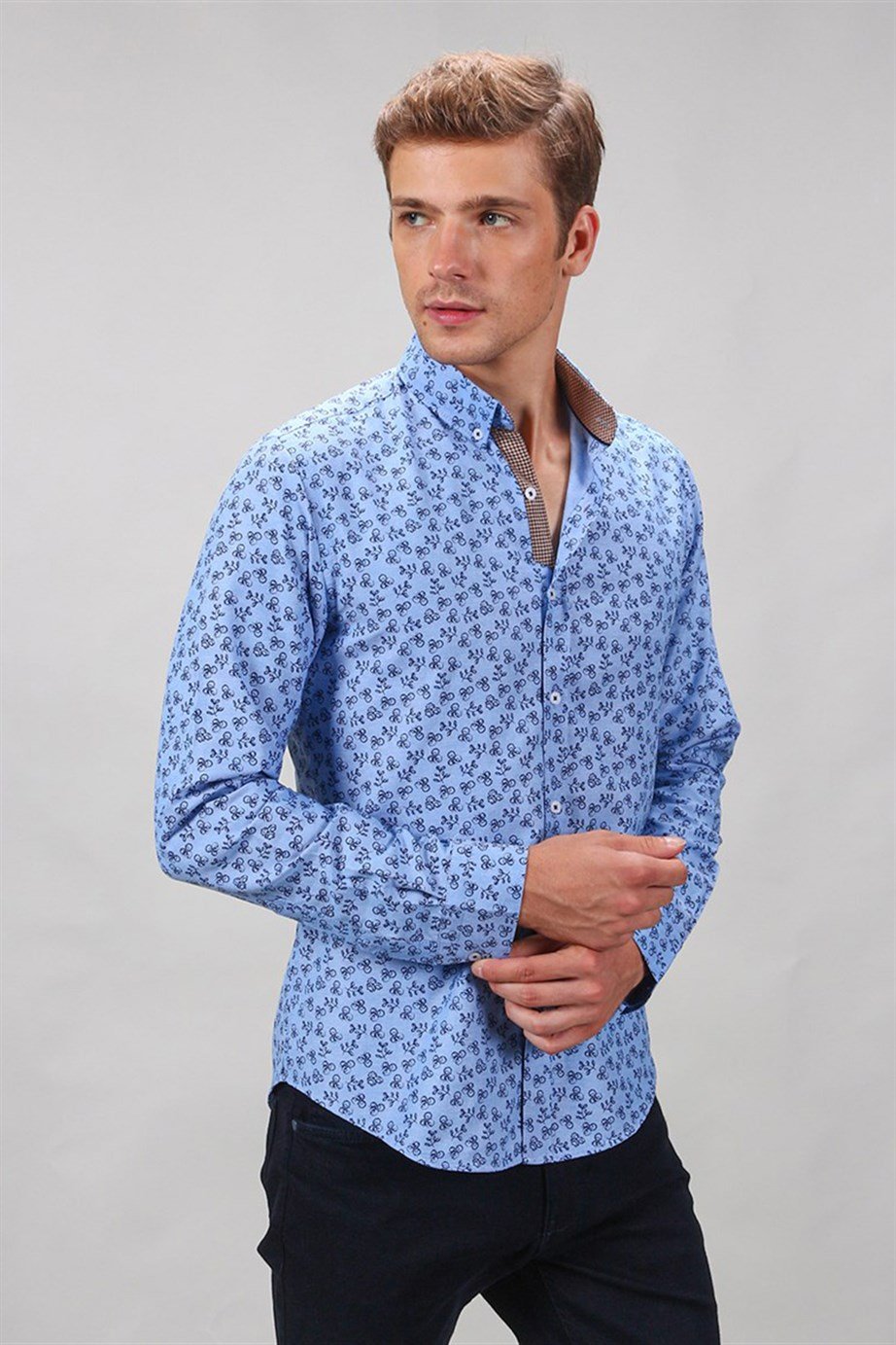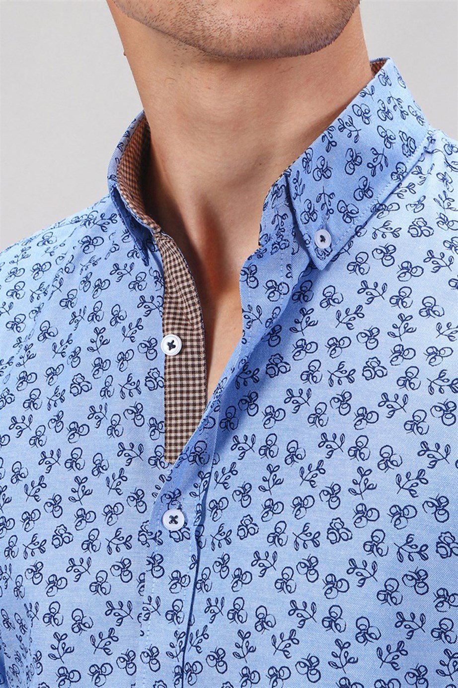 Slim Fit Uzun Kollu Pamuklu Kolay Ütü Desenli Erkek Mavi Gömlek (DR190057-361)