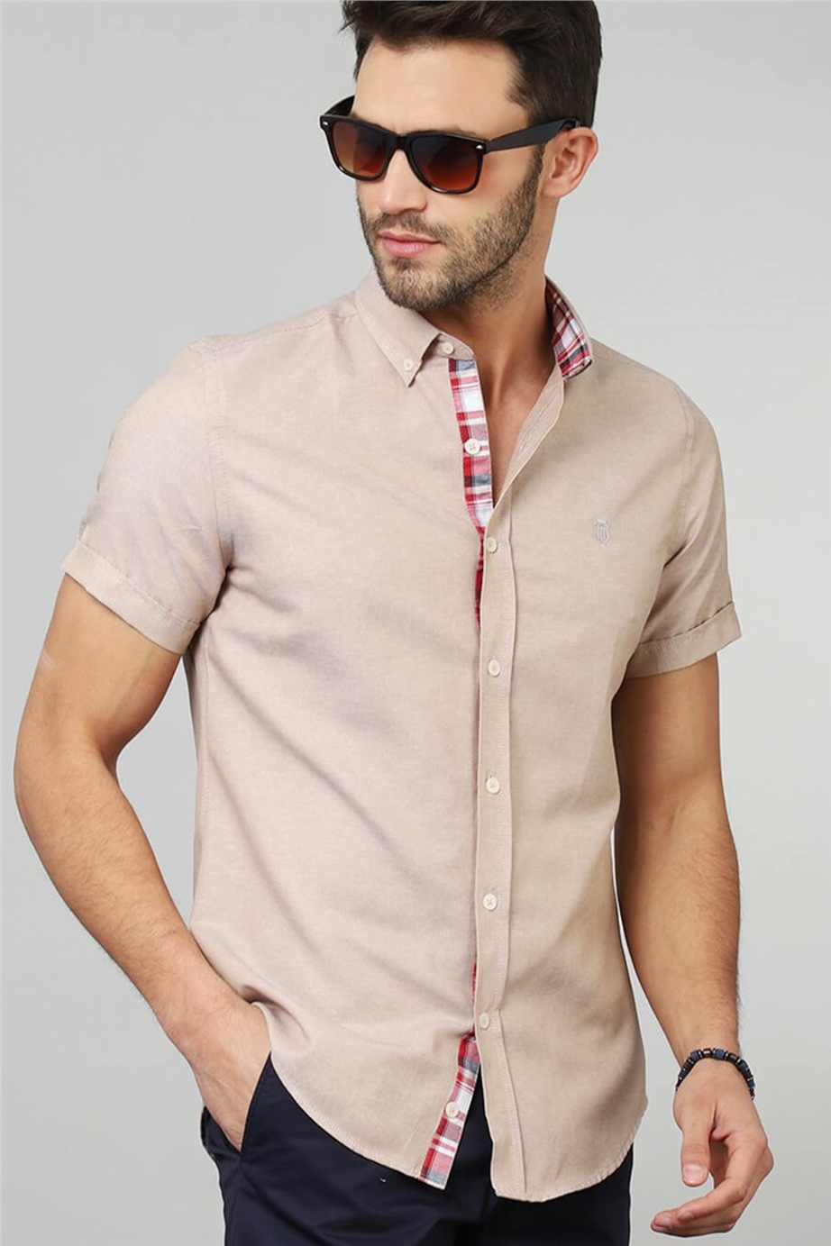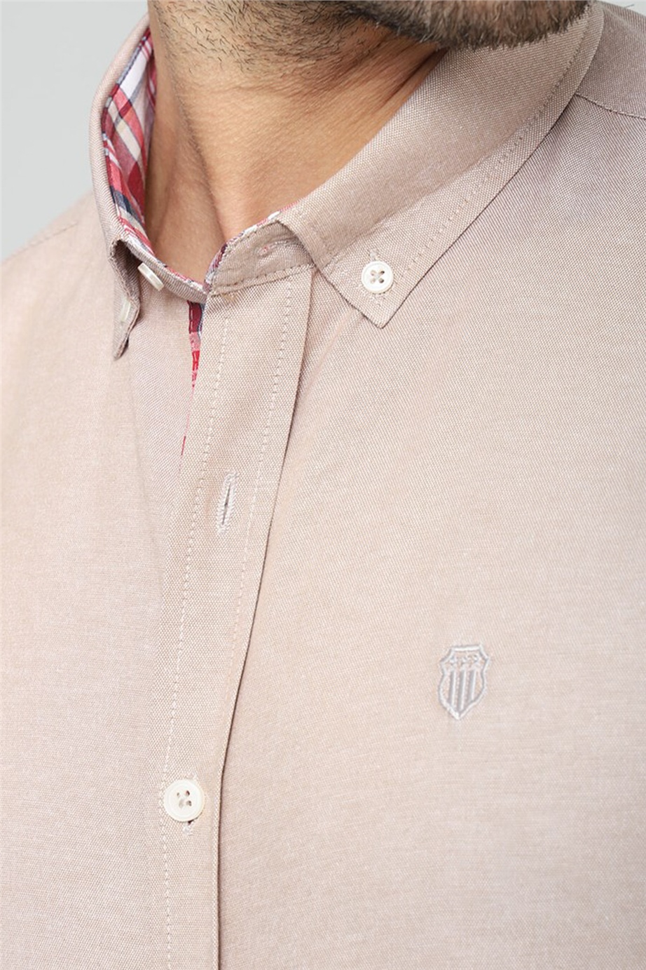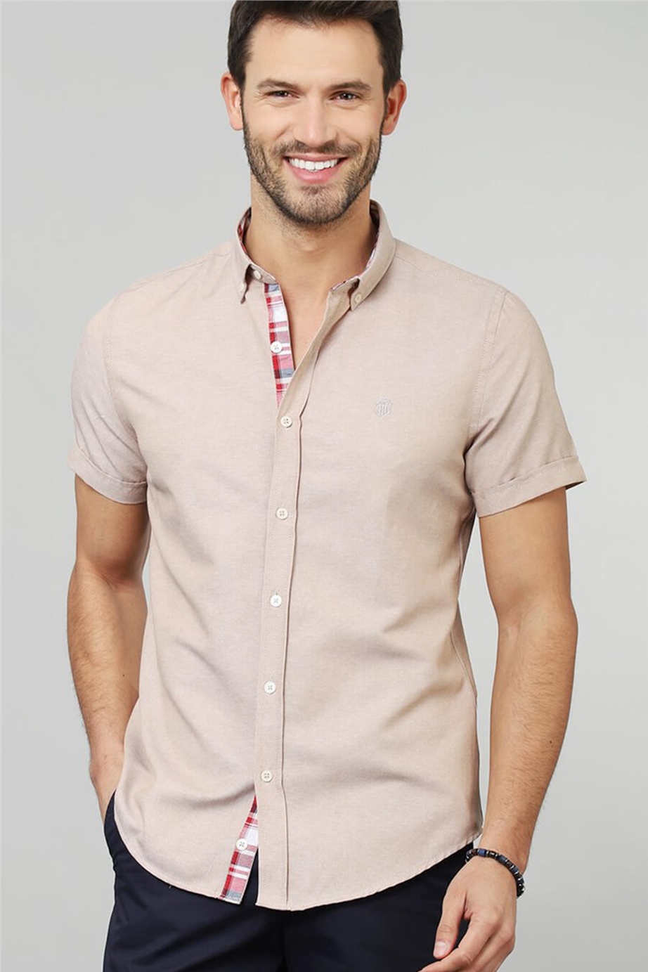 Erkek Slim Fit Dar Kesim Kısa Kollu Pamuklu Oxford Doku Taş Renk Düğmeli Yaka Gömlek (DR200041-402)