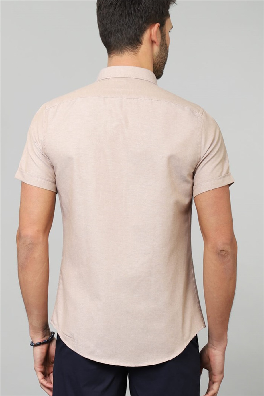 Erkek Slim Fit Dar Kesim Kısa Kollu Pamuklu Oxford Doku Taş Renk Düğmeli Yaka Gömlek