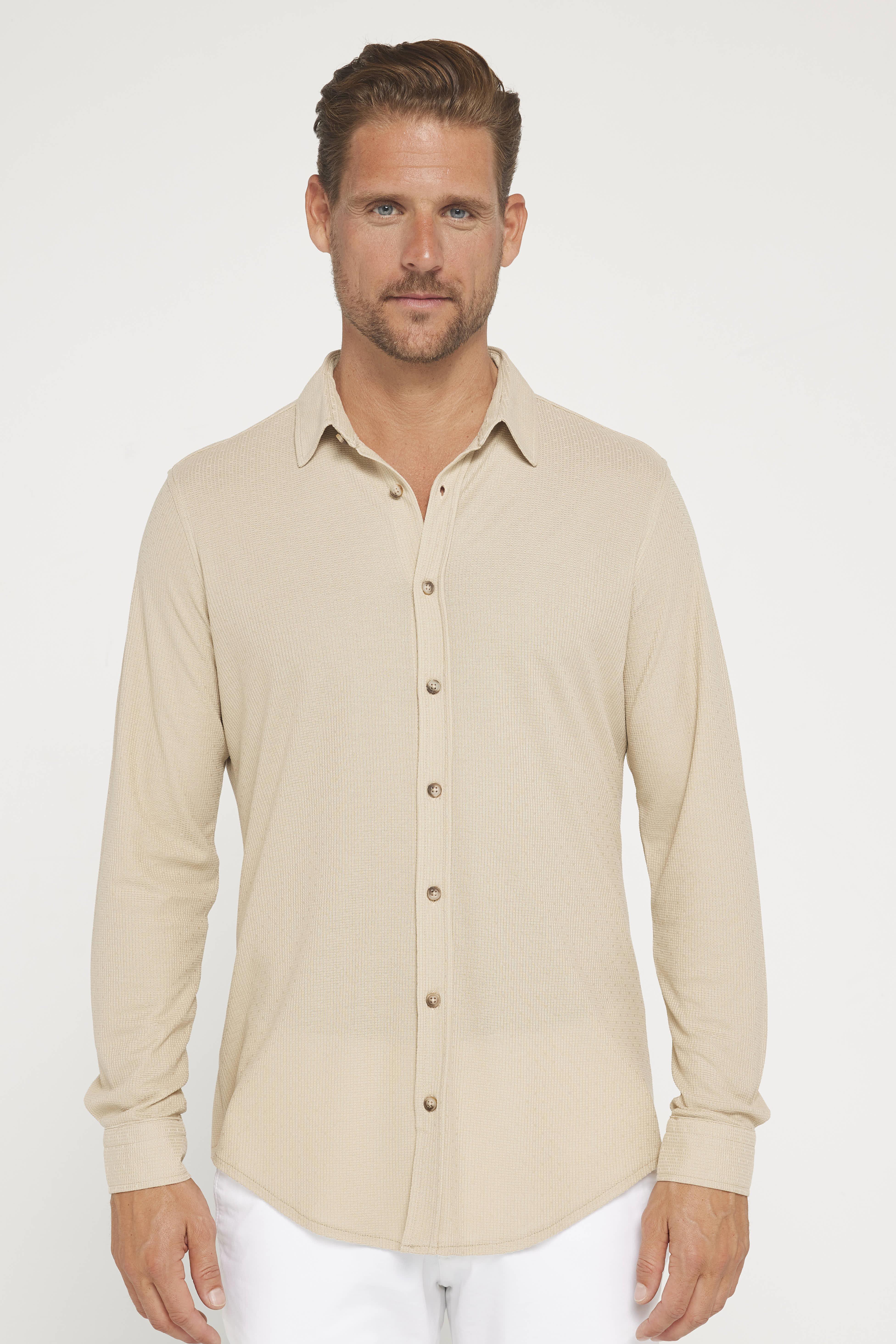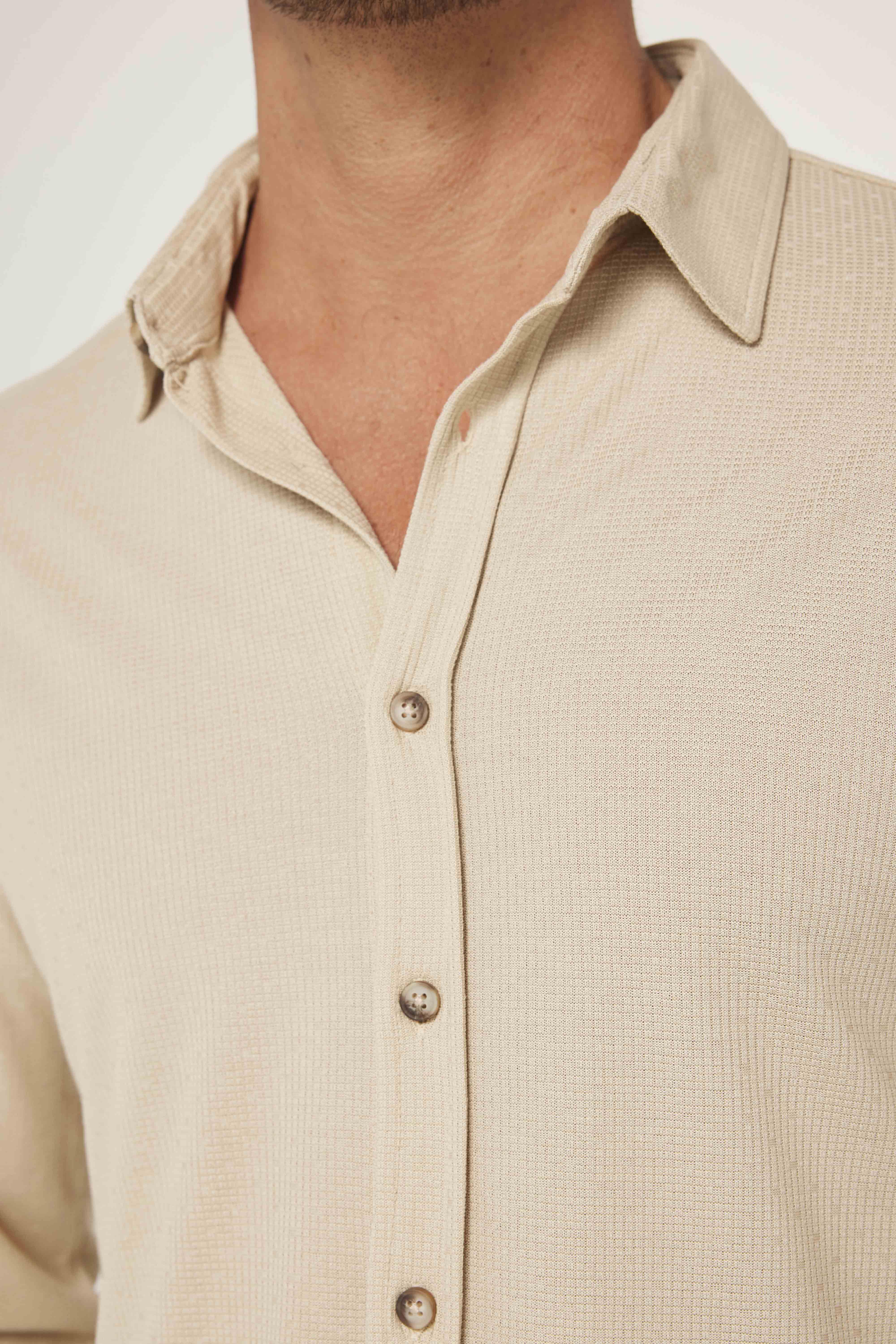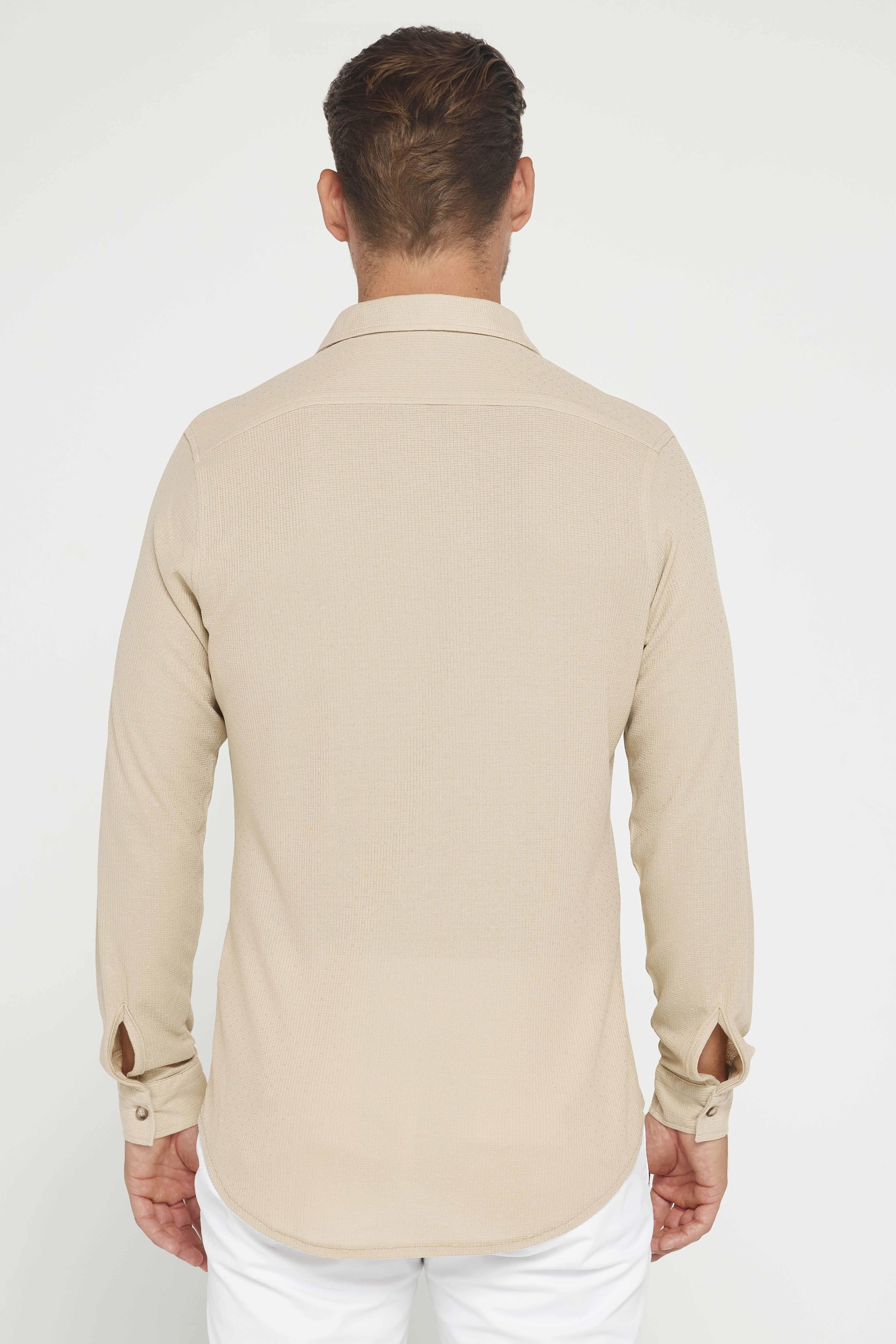 Erkek Slim Fit Dar Kesim Uzun Kollu Örme Kumaş Yazlık Bej Spor Yaka Gömlek (DR240063-2001)