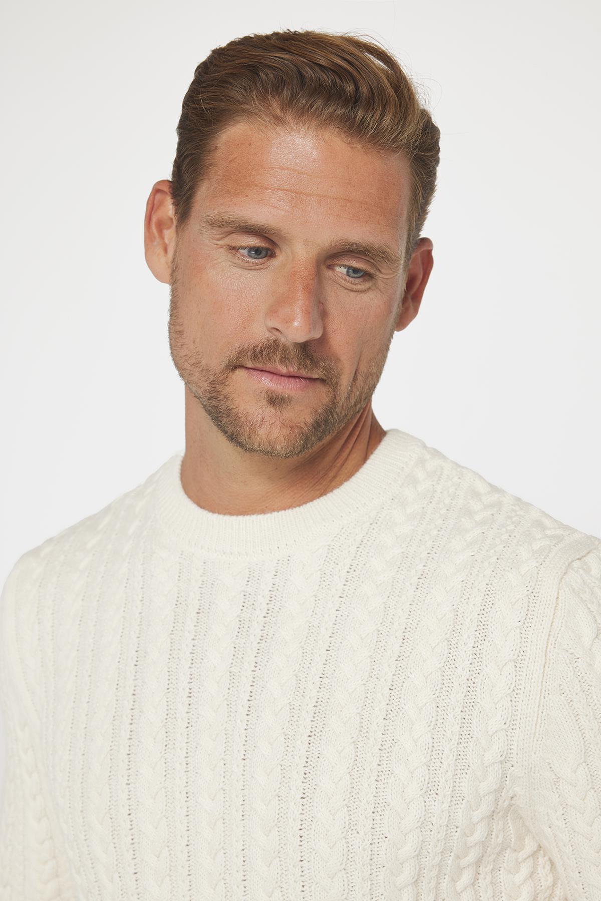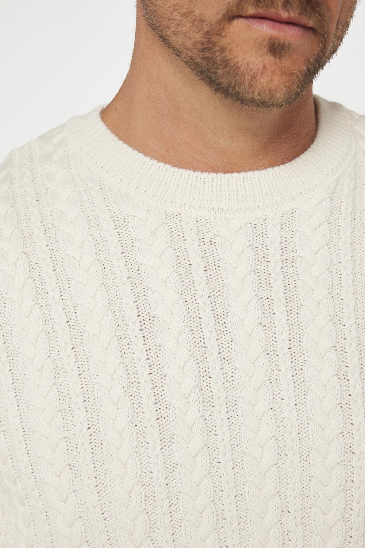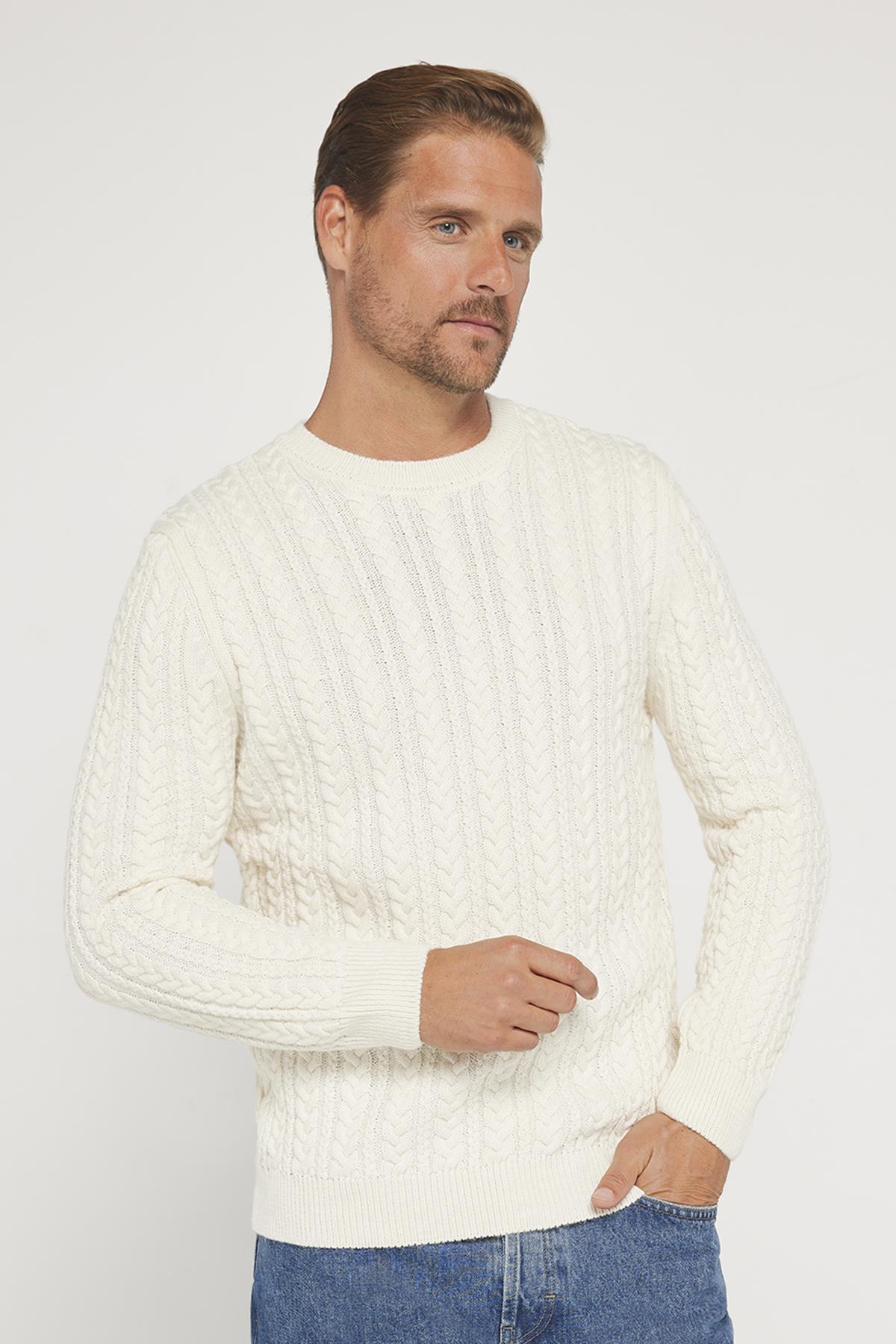 Erkek Bisiklet Yaka Saç Örgü Desenli Ekru Triko Kazak