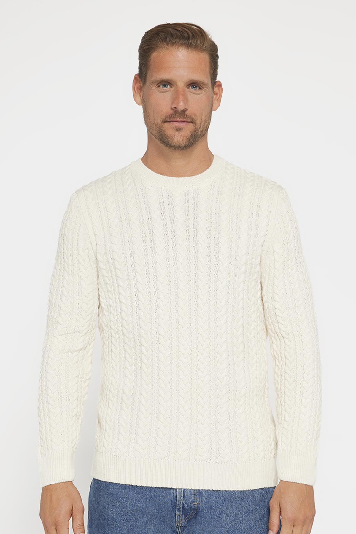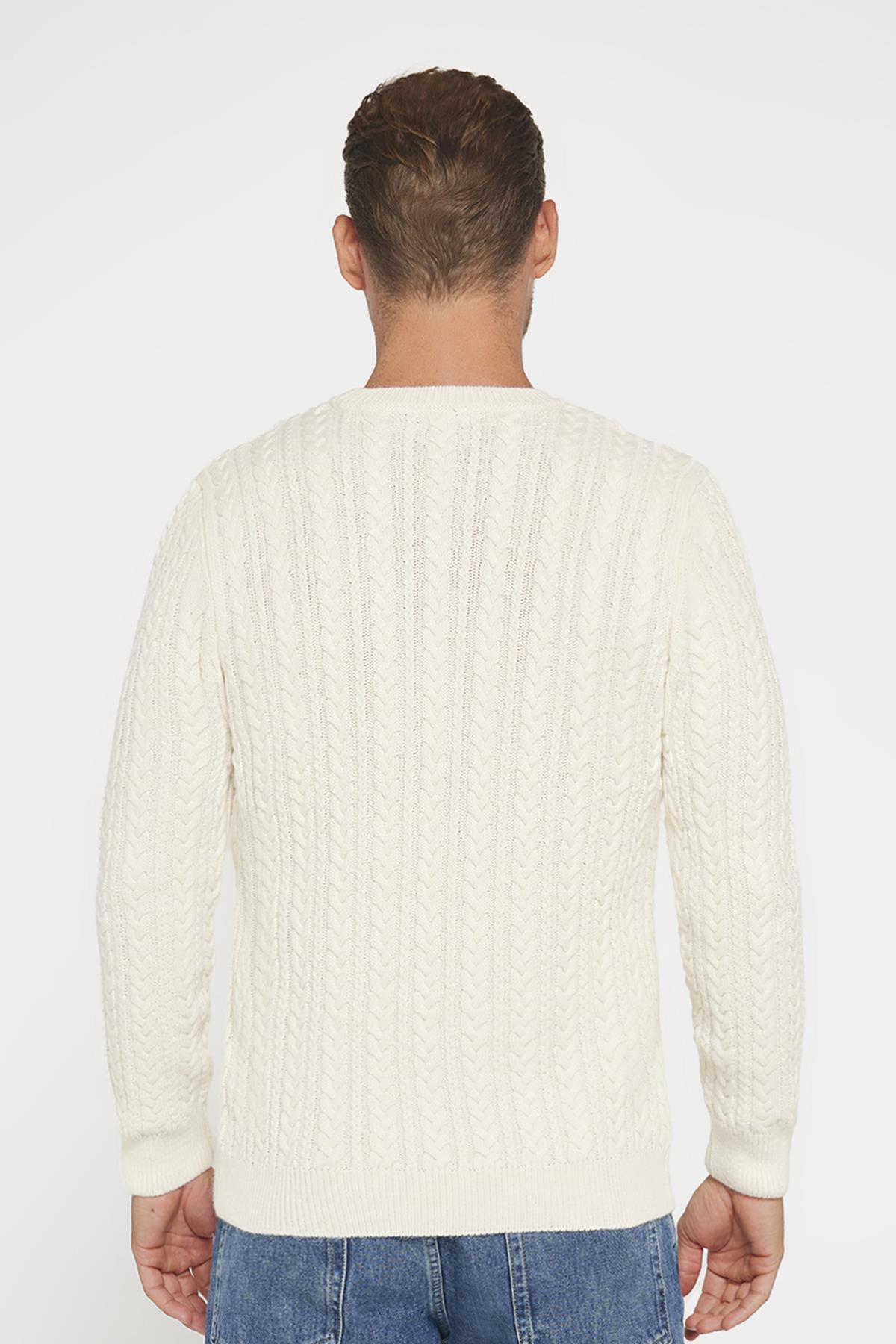 Erkek Bisiklet Yaka Saç Örgü Desenli Ekru Triko Kazak (KZ240003-84)