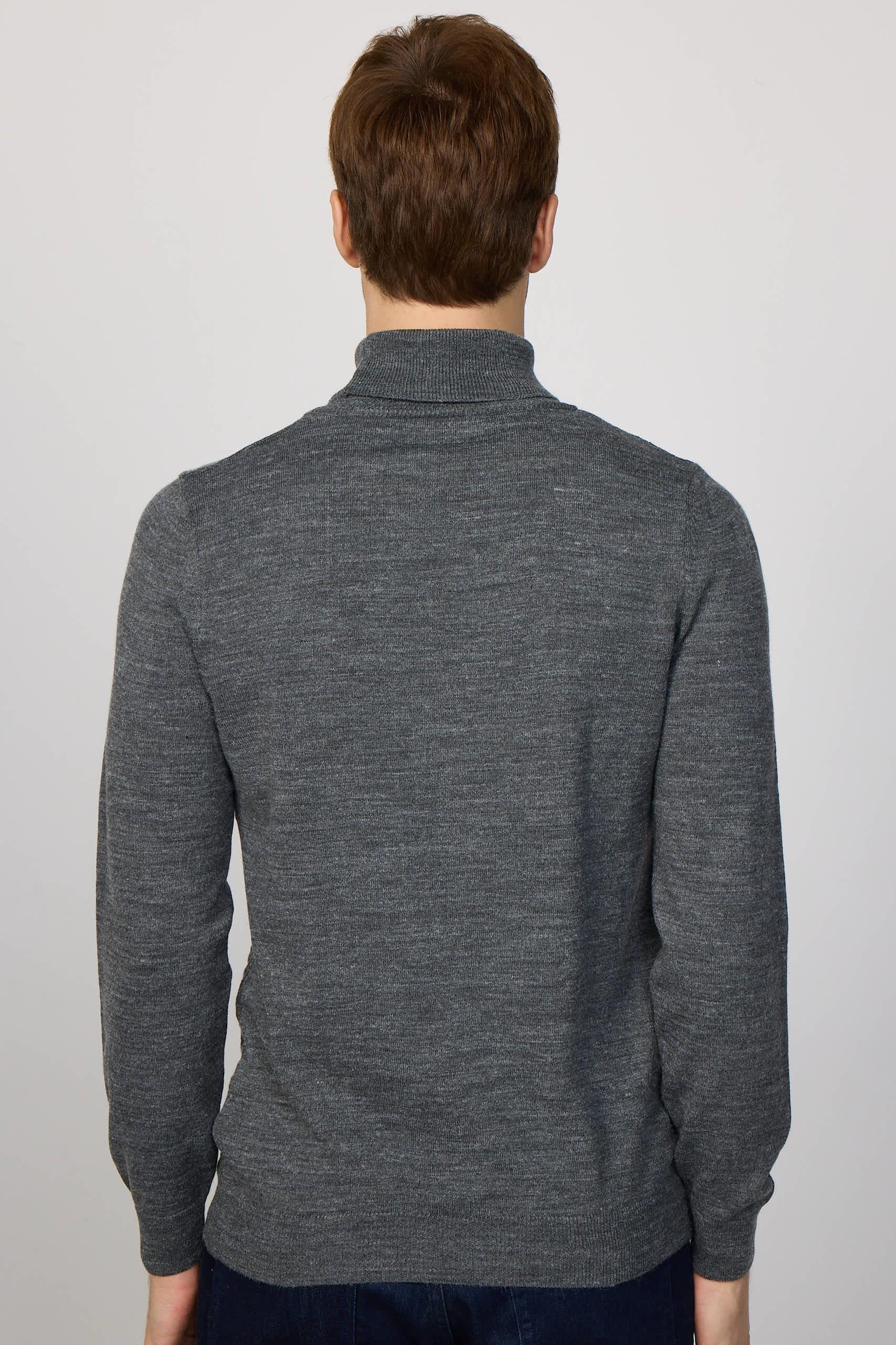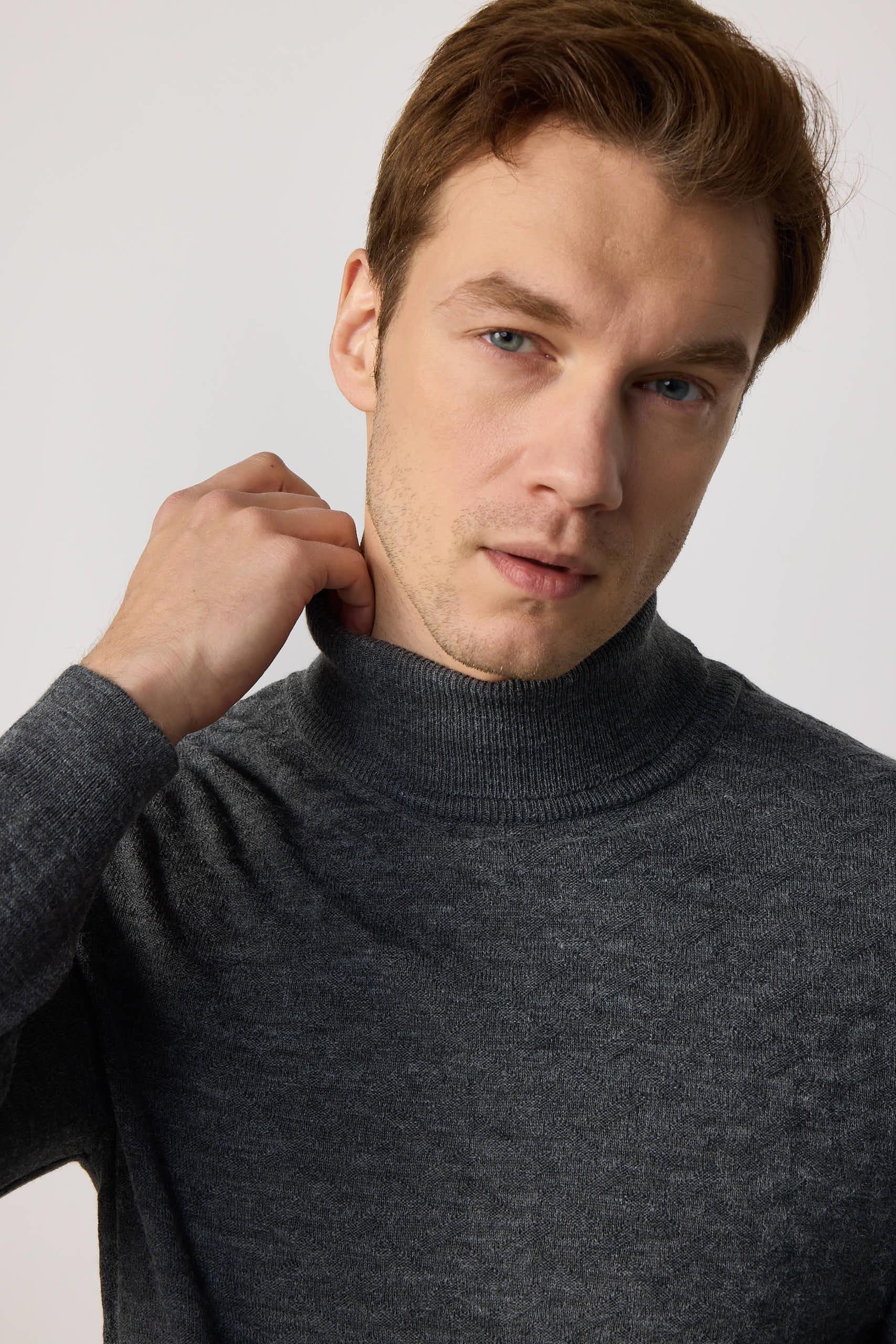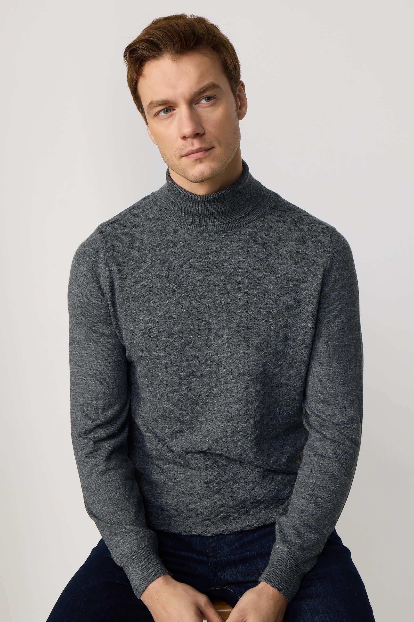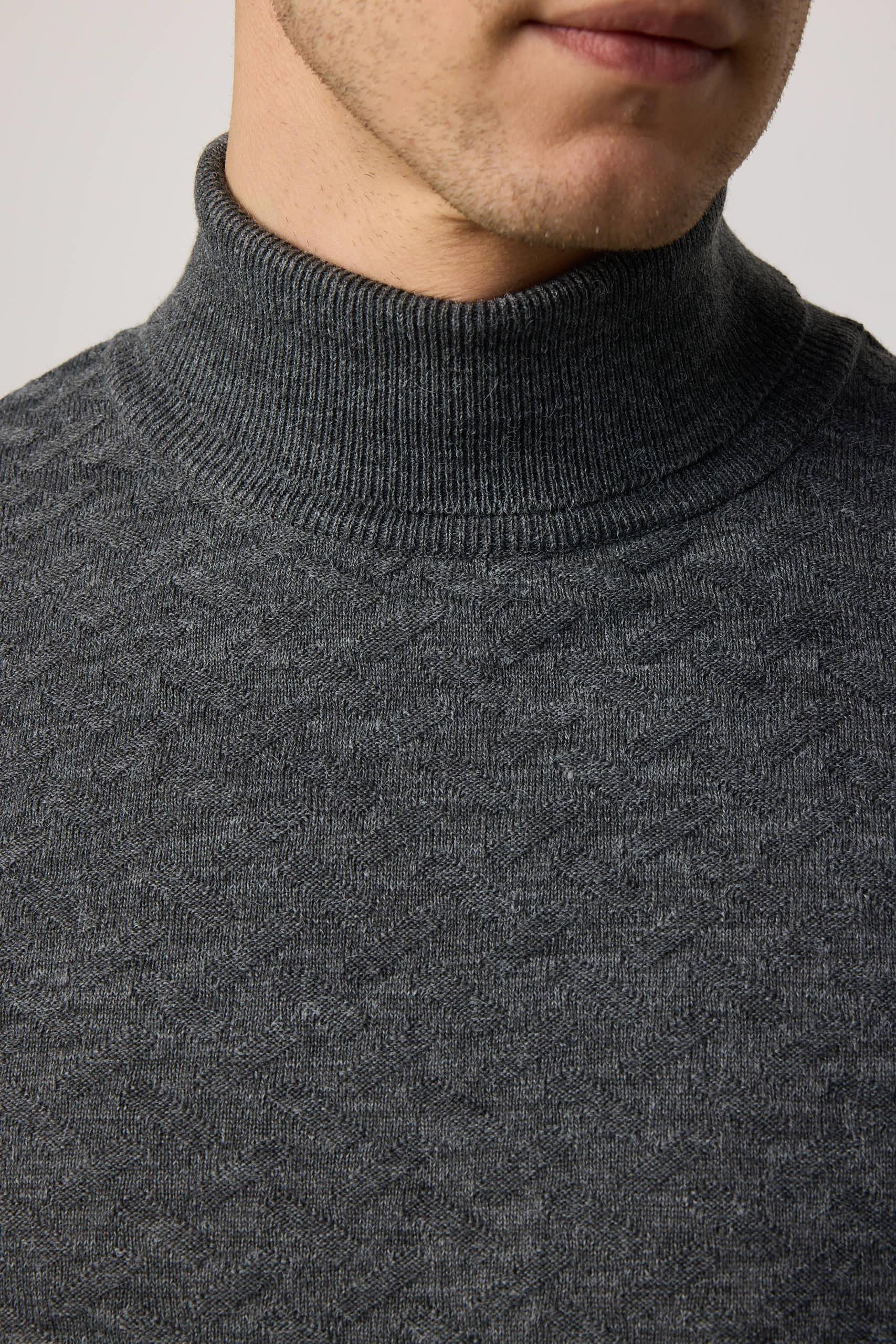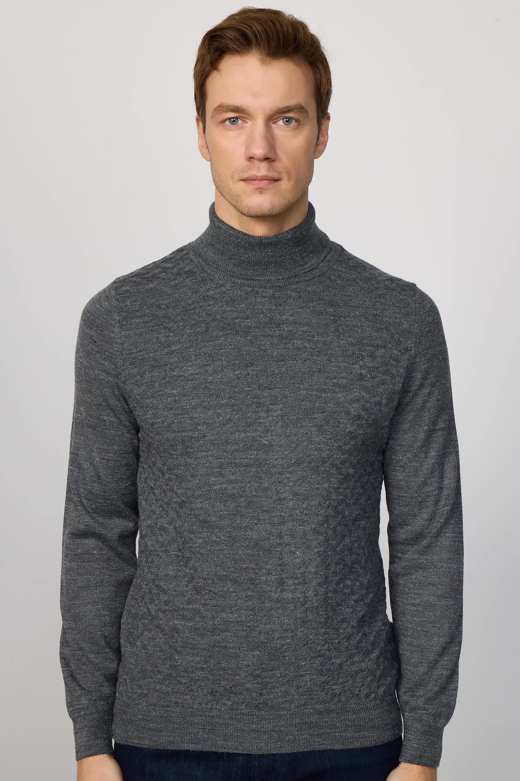 Tam Balıkçı Yaka Önü Desenli Gri Erkek Triko Kazak