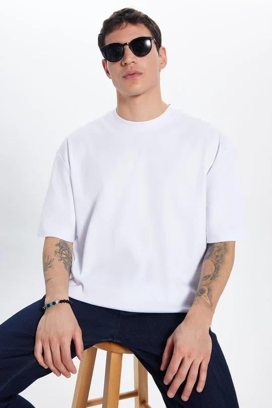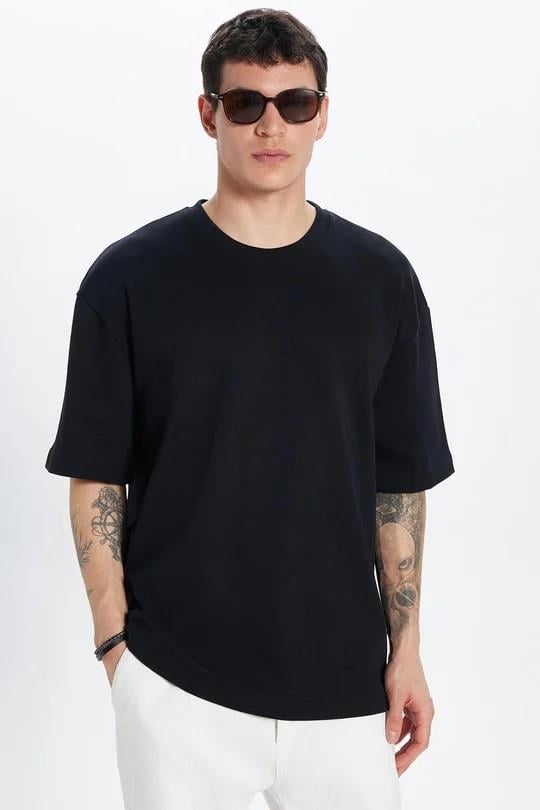 Unisex 3'lü Paket Lacivert-Beyaz-Siyah Oversize Geniş Kesim %100 Pamuk Basic Bisiklet Yaka Tişört (TS250035-4000)