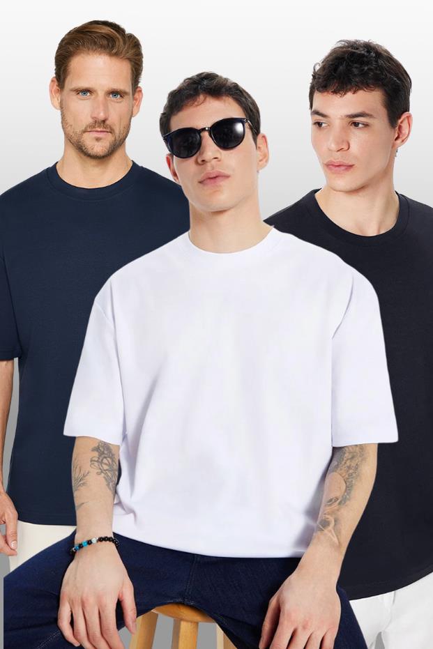Unisex 3'lü Paket Lacivert-Beyaz-Siyah Oversize Geniş Kesim %100 Pamuk Basic Bisiklet Yaka Tişört