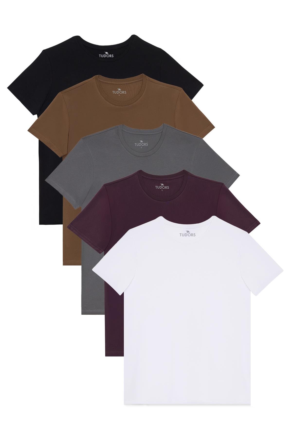 Unisex 5'li Paket Beyaz-Mor-Gri-Kahverengi-Siyah Slim Fit Dar Kesim %100 Pamuk Bisiklet Yaka Tişört