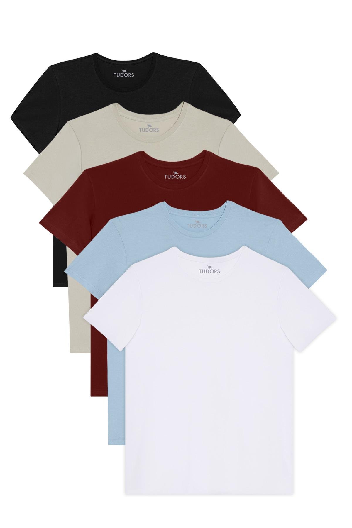 Unisex 5li Pkt Siyah-Beyaz-Bordo-Çağla-Açık Mavi Slim Fit Dar Kesim %100 Pamuk Bisiklet Yaka Tişört
