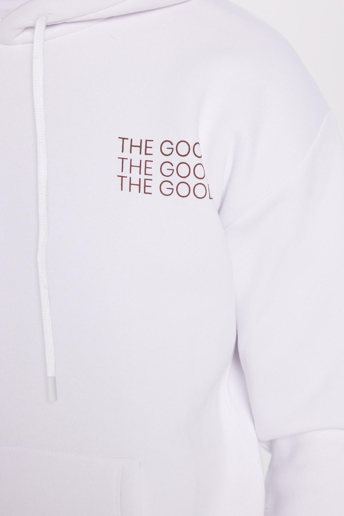 Unisex Oversize Geniş Kesim Pamuklu Yumuşak Dokulu İçi Polarlı Baskılı Beyaz Kapüşonlu Sweatshirt