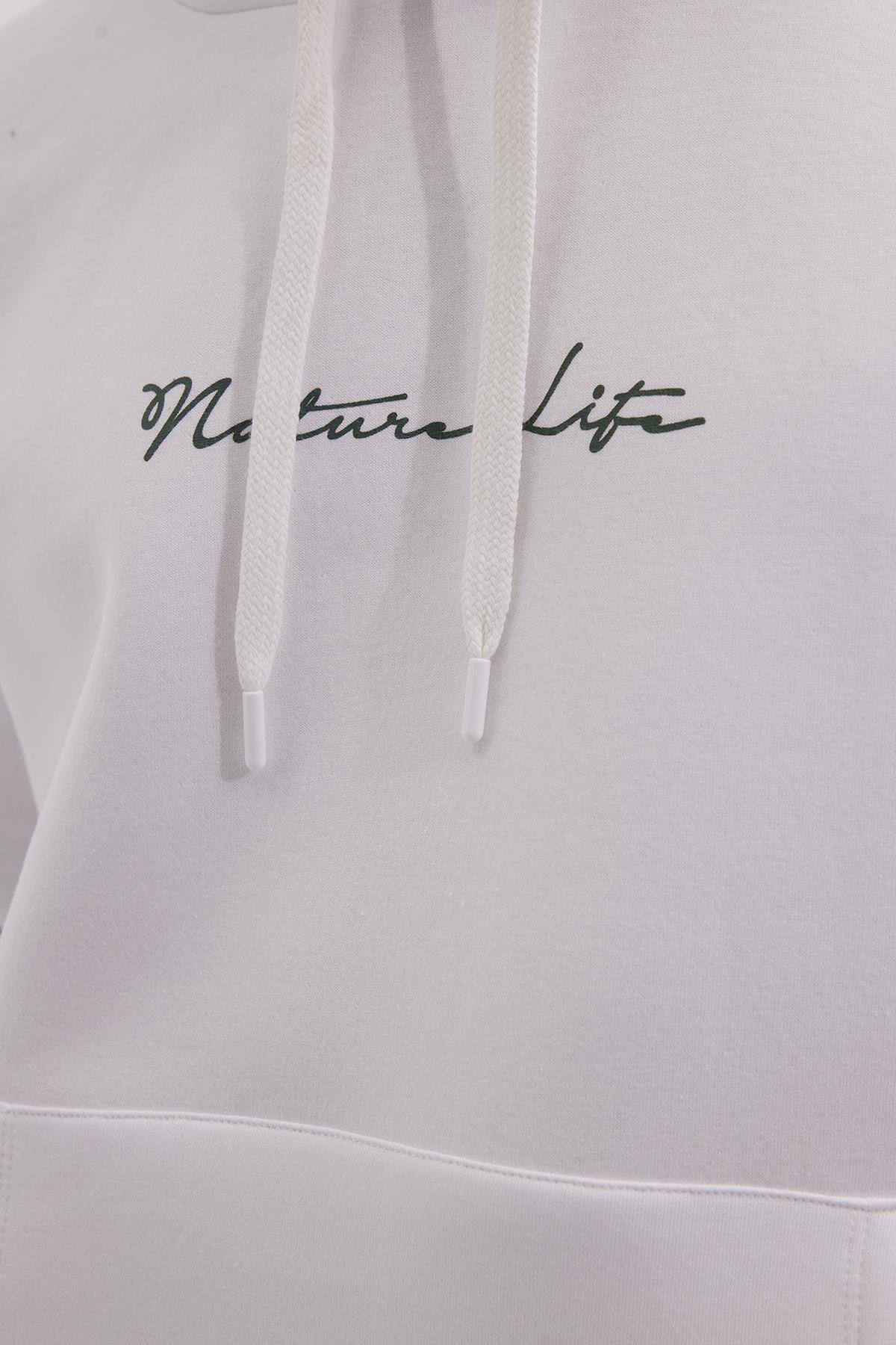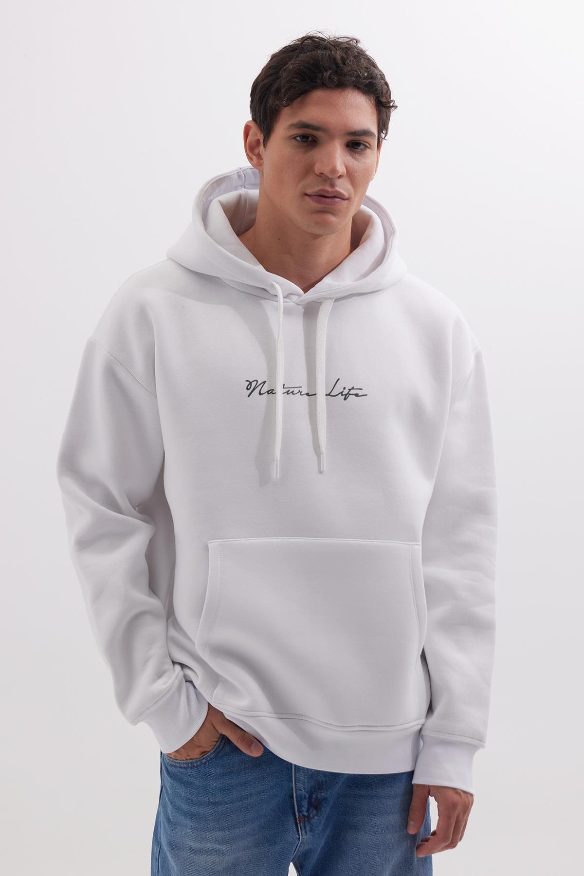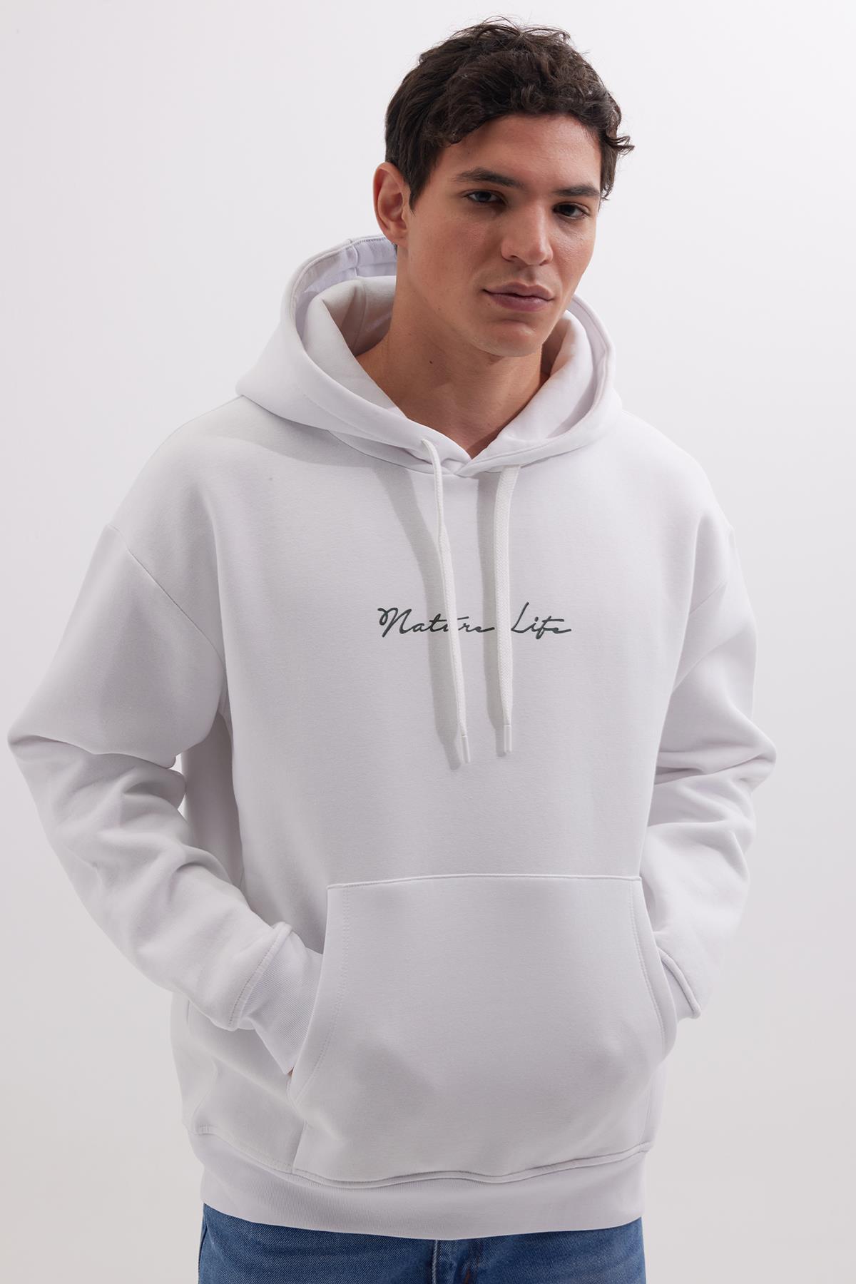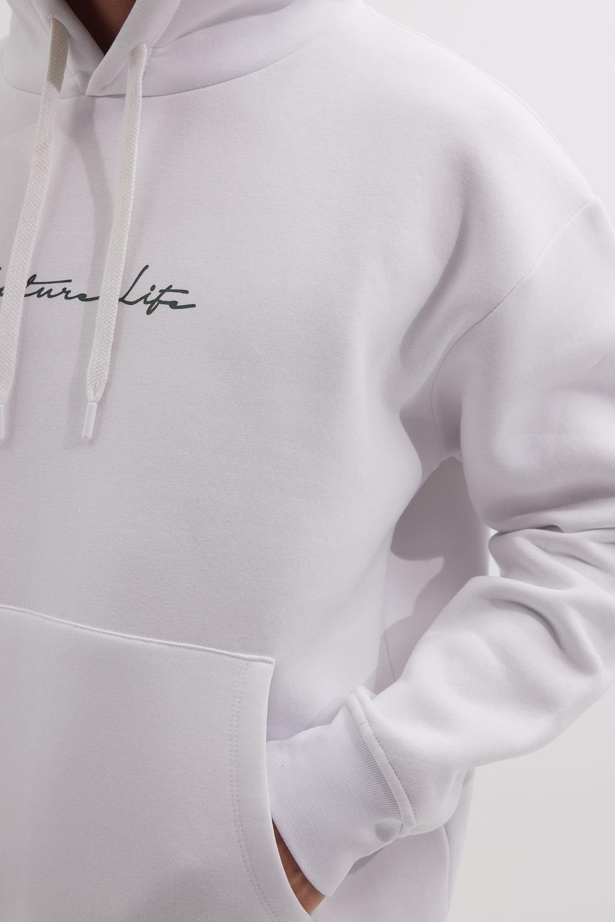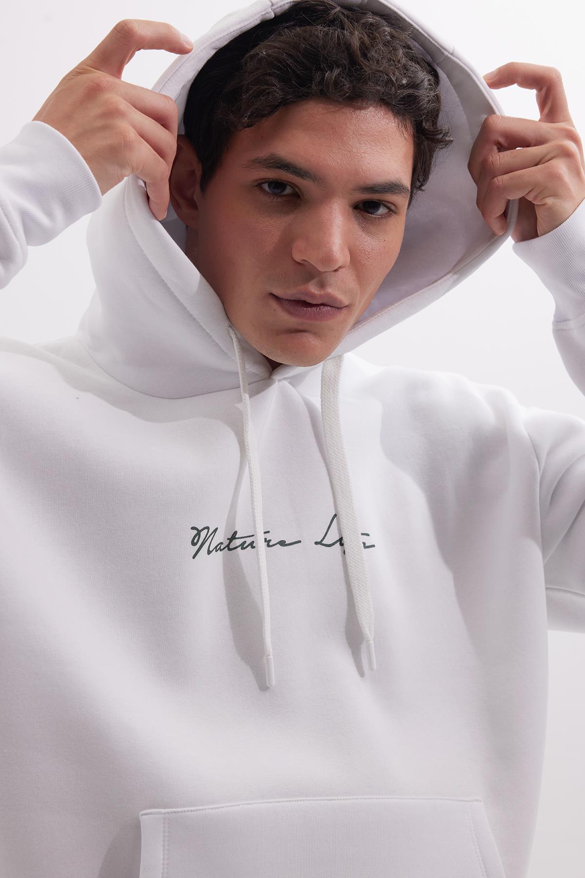 Unisex Oversize Geniş Kesim Pamuklu Yumuşak Dokulu İçi Polarlı Baskılı Beyaz Kapüşonlu Sweatshirt