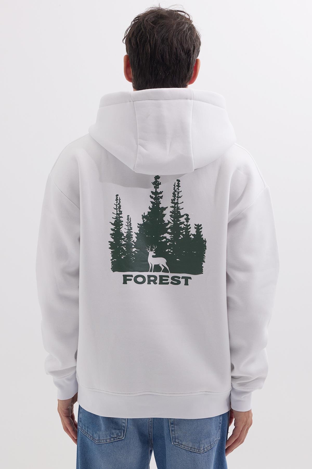 Unisex Oversize Geniş Kesim Pamuklu Yumuşak Dokulu İçi Polarlı Baskılı Beyaz Kapüşonlu Sweatshirt (SW240012-7302)