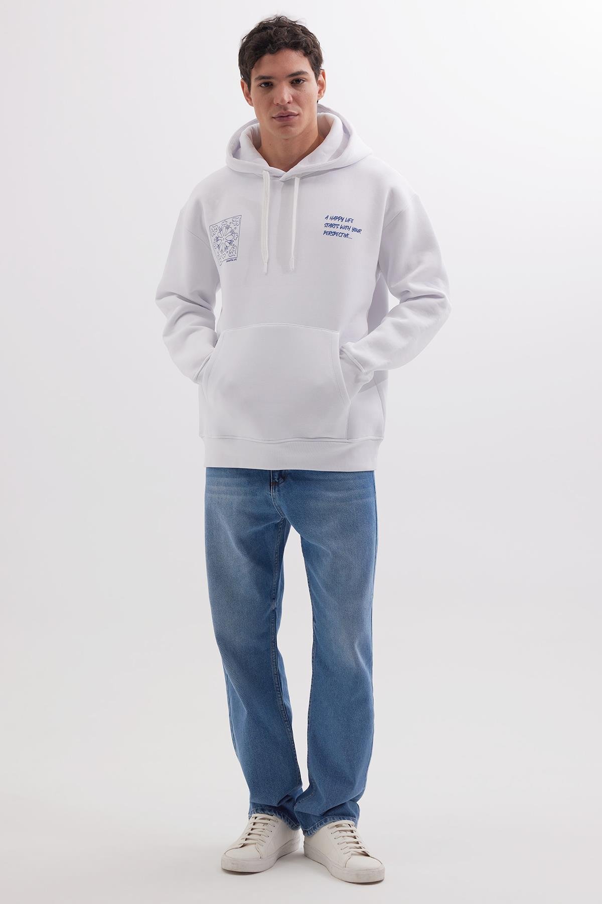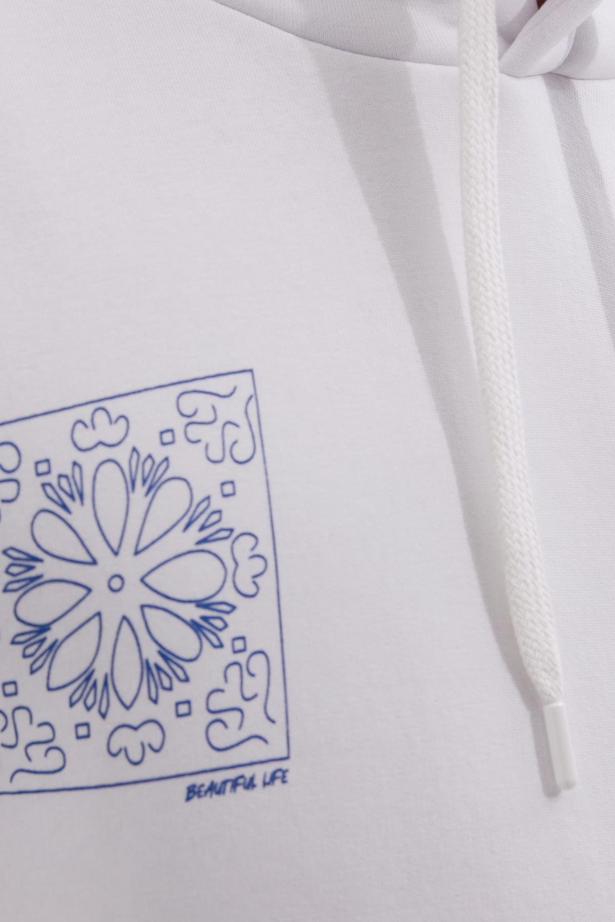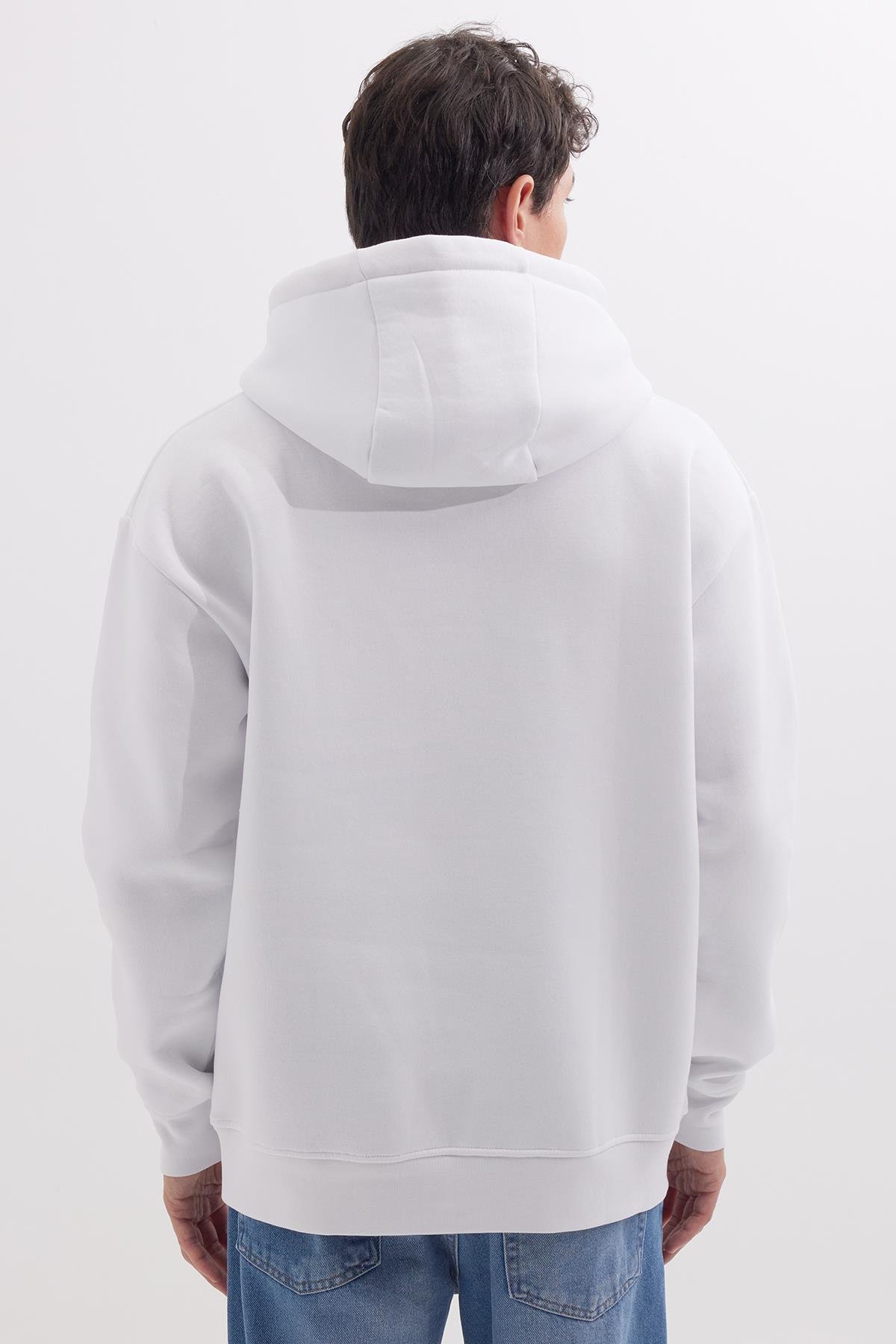 Unisex Oversize Geniş Kesim Pamuklu Yumuşak Dokulu İçi Polarlı Baskılı Beyaz Kapüşonlu Sweatshirt