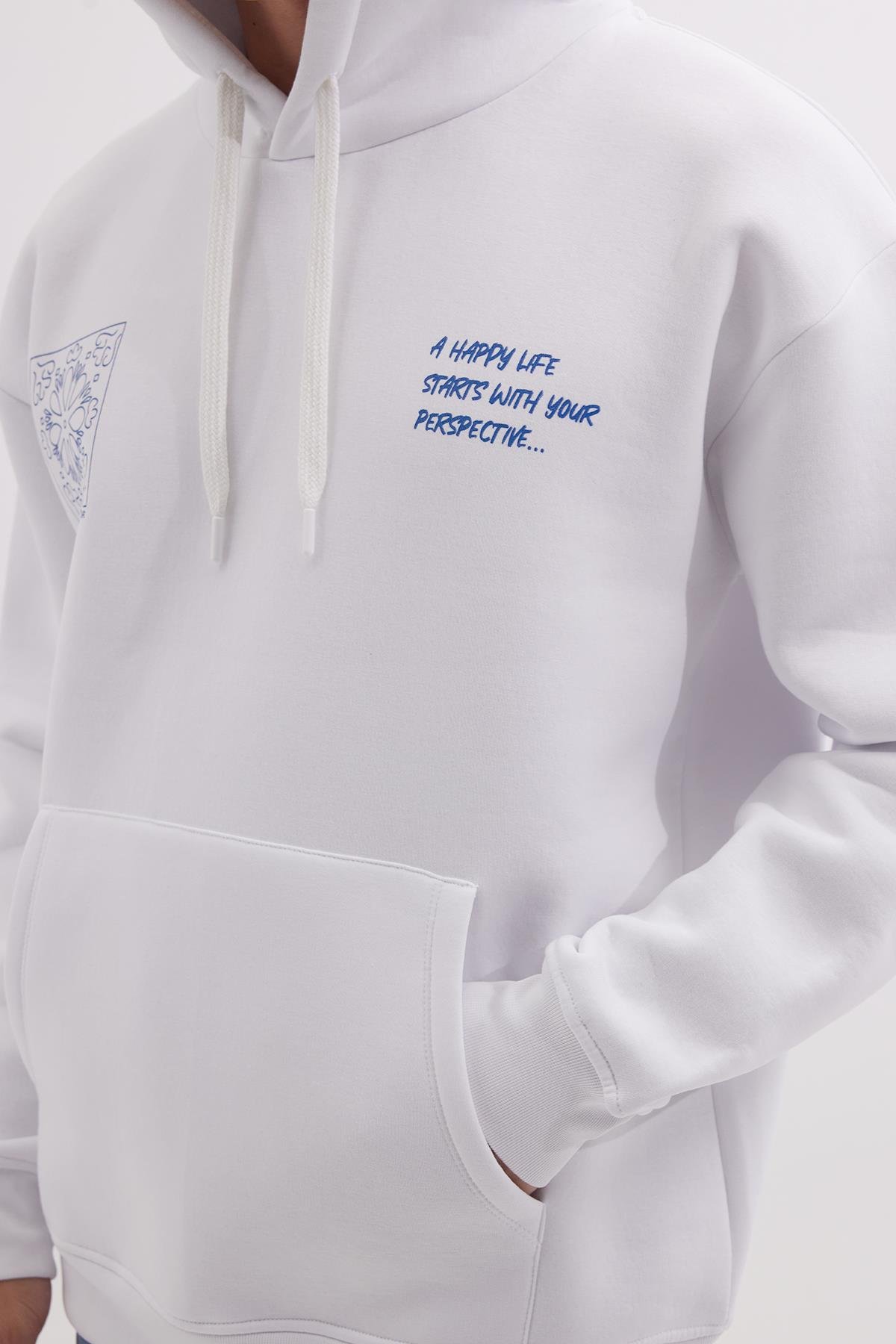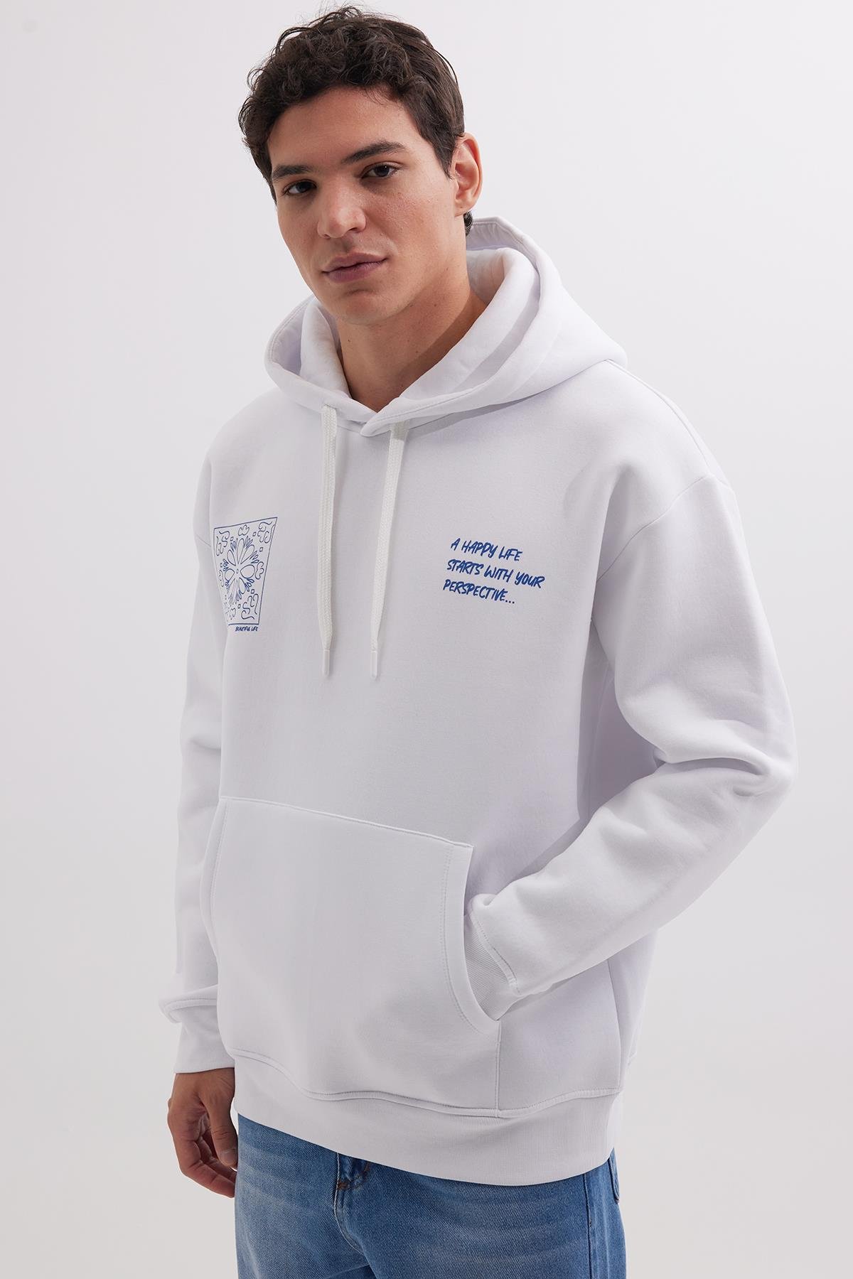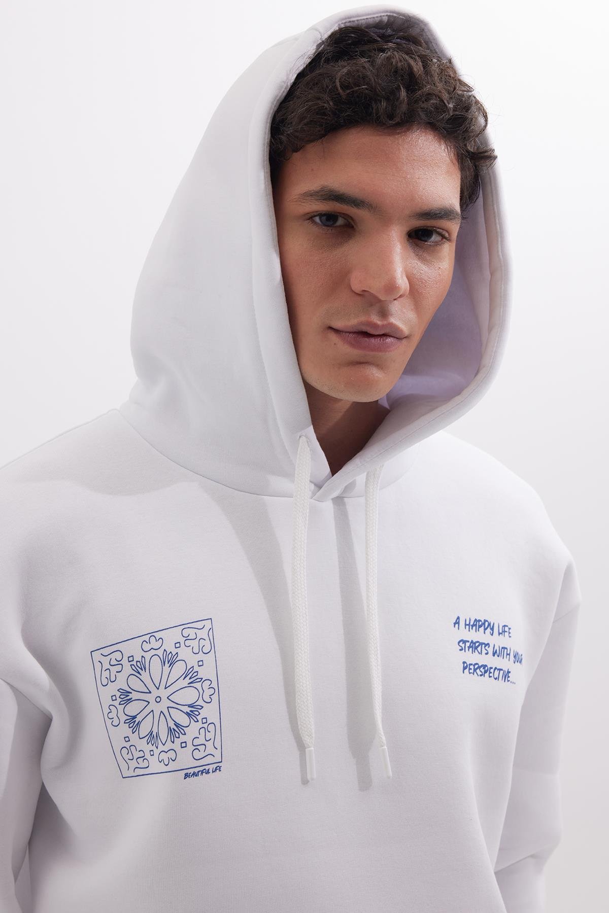 Unisex Oversize Geniş Kesim Pamuklu Yumuşak Dokulu İçi Polarlı Baskılı Beyaz Kapüşonlu Sweatshirt