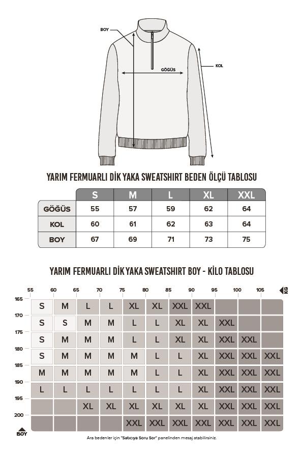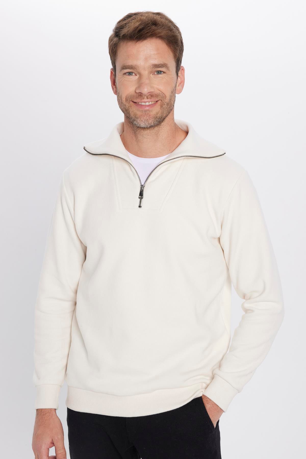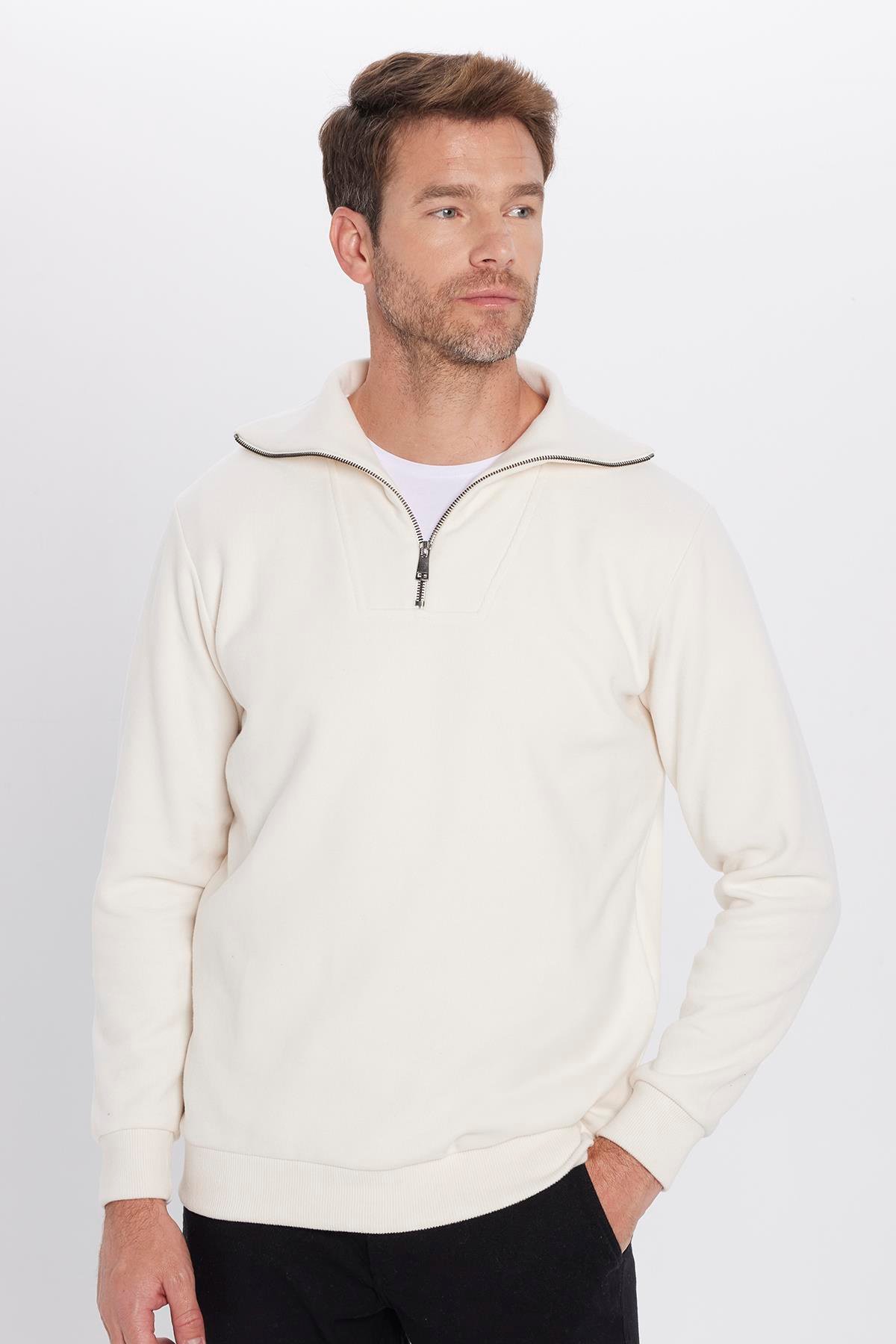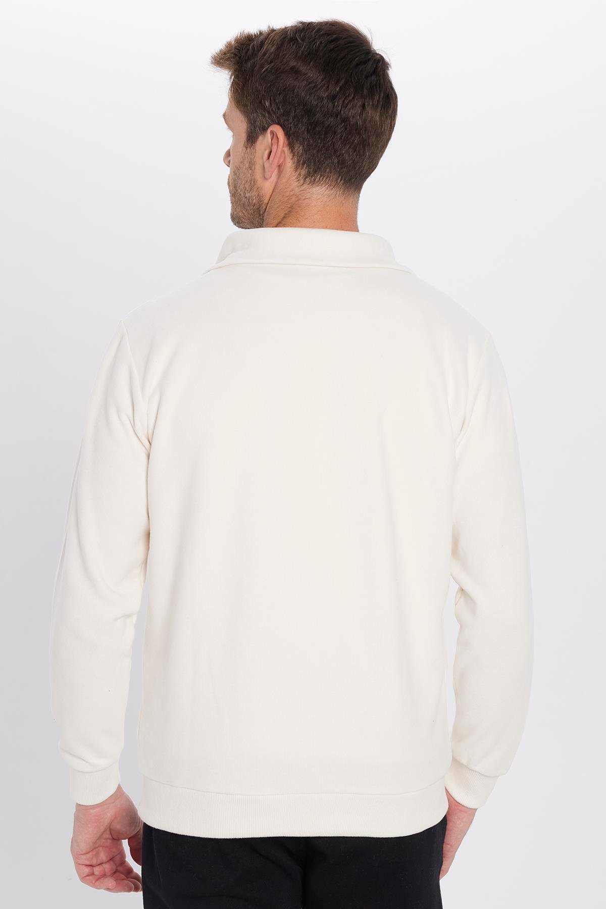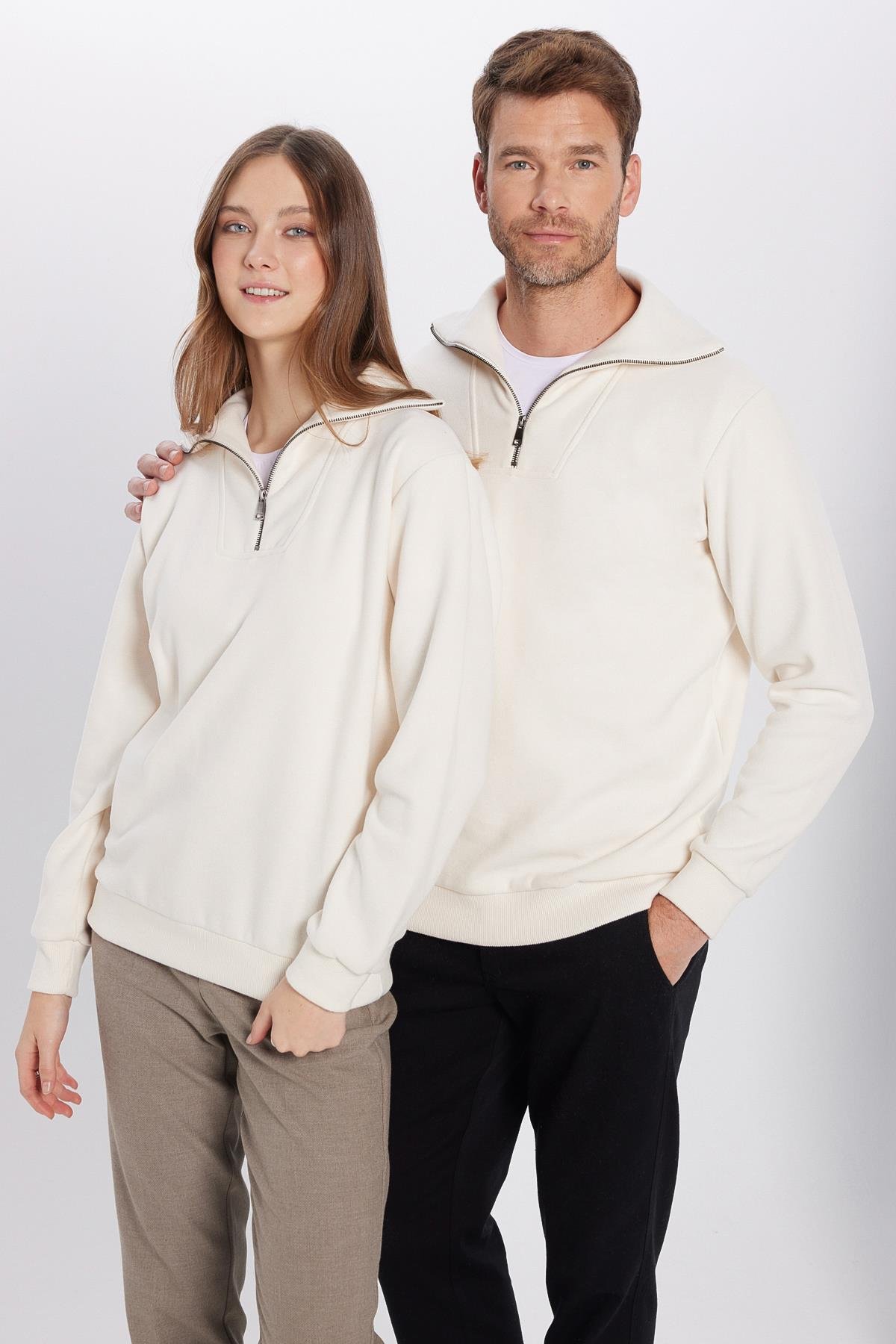 Unisex Relax Fit Rahat Kesim Fitilli Desenli Pamuklu Yarım Fermuarlı Ekru Dik Yaka Sweatshirt (SW240006-84)