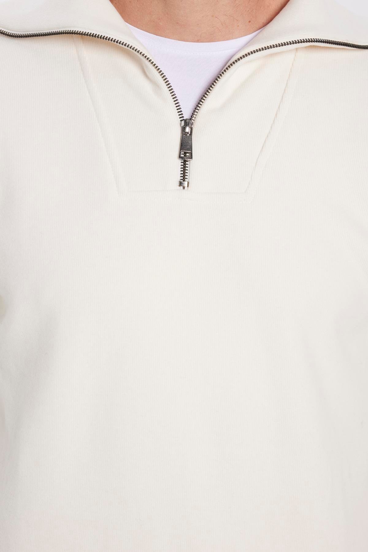 Unisex Relax Fit Rahat Kesim Fitilli Desenli Pamuklu Yarım Fermuarlı Ekru Dik Yaka Sweatshirt