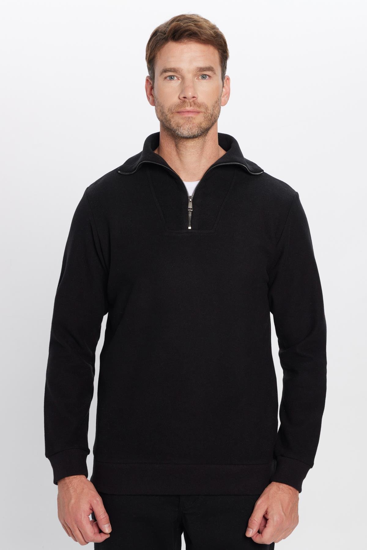 Unisex Relax Fit Rahat Kesim Fitilli Desenli Pamuklu Yarım Fermuarlı Siyah Dik Yaka Sweatshirt
