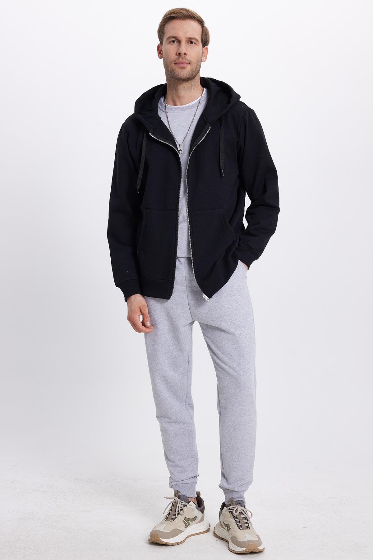 Unisex Relax Fit Rahat Kesim Pamuklu İçi Polarlı Çift Cepli Tam Fermuarlı Siyah Kapüşonlu Sweatshirt (SW250033-02)