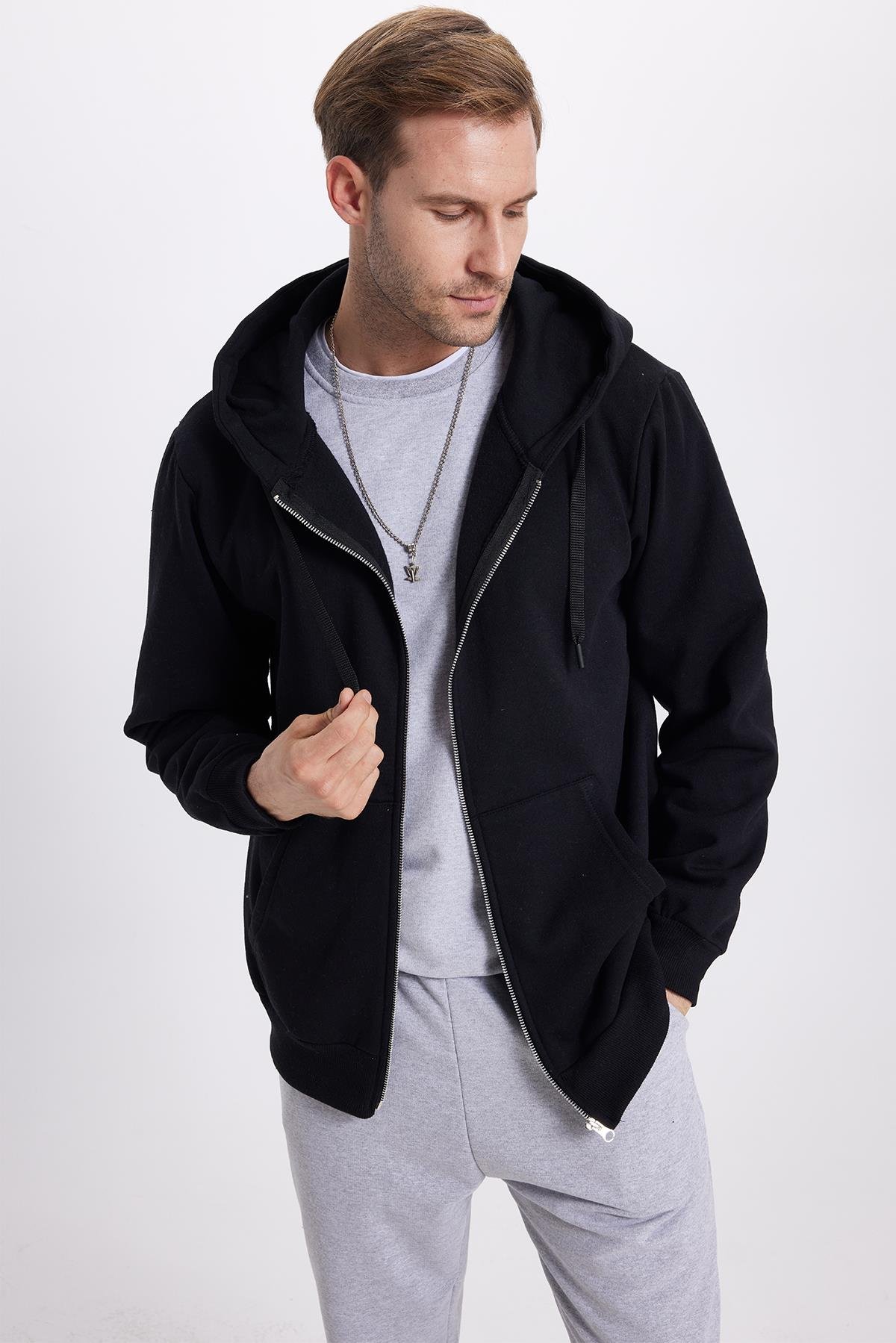 Unisex Relax Fit Rahat Kesim Pamuklu İçi Polarlı Çift Cepli Tam Fermuarlı Siyah Kapüşonlu Sweatshirt